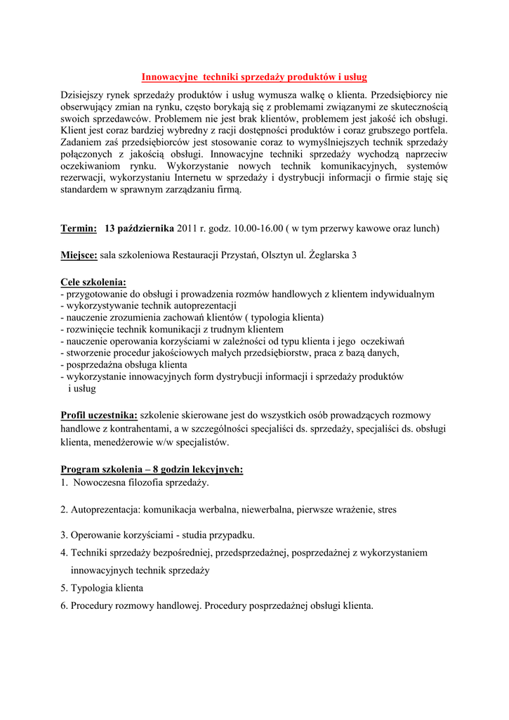 Innowacyjne techniki sprzedaży produktów i usług Dzisiejszy rynek sprzedaży produktów i usług wymusza walkę o klienta. Przedsiębiorcy nie obserwujący zmian na rynku, często borykają się z problemami związanymi ze skutecznością swoich sprzedawców. Problemem nie jest brak klientów, problemem jest jakość ich obsługi. Klient jest coraz bardziej wybredny z racji dostępności produktów i coraz grubszego portfela. Zadaniem zaś przedsiębiorców jest stosowanie coraz to wymyślniejszych technik sprzedaży połączonych z jakością obsługi. Innowacyjne techniki sprzedaży wychodzą naprzeciw oczekiwaniom rynku. Wykorzystanie nowych technik komunikacyjnych, systemów rezerwacji, wykorzystaniu Internetu w sprzedaży i dystrybucji informacji o firmie staję się standardem w sprawnym zarządzaniu firmą. Termin: 13 października 2011 r. godz. 10.00-16.00 ( w tym przerwy kawowe oraz lunch) Miejsce: sala szkoleniowa Restauracji Przystań, Olsztyn ul. Żeglarska 3 Cele szkolenia: - przygotowanie do obsługi i prowadzenia rozmów handlowych z klientem indywidualnym - wykorzystywanie technik autoprezentacji - nauczenie zrozumienia zachowań klientów ( typologia klienta) - rozwinięcie technik komunikacji z trudnym klientem - nauczenie operowania korzyściami w zależności od typu klienta i jego oczekiwań - stworzenie procedur jakościowych małych przedsiębiorstw, praca z bazą danych, - posprzedażna obsługa klienta - wykorzystanie innowacyjnych form dystrybucji informacji i sprzedaży produktów i usług Profil uczestnika: szkolenie skierowane jest do wszystkich osób prowadzących rozmowy handlowe z kontrahentami, a w szczególności specjaliści ds. sprzedaży, specjaliści ds. obsługi klienta, menedżerowie w/w specjalistów. Program szkolenia – 8 godzin lekcyjnych: 1. Nowoczesna filozofia sprzedaży. 2. Autoprezentacja: komunikacja werbalna, niewerbalna, pierwsze wrażenie, stres 3. Operowanie korzyściami - studia przypadku. 4. Techniki sprzedaży bezpośredniej, przedsprzedażnej, posprzedażnej z wykorzystaniem innowacyjnych technik sprzedaży 5. Typologia klienta 6. Procedury rozmowy handlowej. Procedury posprzedażnej obsługi klienta. Metody dydaktyczne: podczas szkolenia stosowane będą metody interaktywne. Będą mieli możliwość zdobyć wiedzę teoretyczną, a jednocześnie przećwiczyć ją i zdobyć nowe umiejętności. Podczas szkolenia będą wykorzystywane takie metody jak: studium przypadku, ćwiczenia praktyczne, dyskusje , burza mózgów, a także wykład. Poza tymi technikami uczestnicy zostaną nagrani na kamerę podczas rozmów handlowych, a następnie zostaną ich zachowania skomentowane i skorygowane. Materiały dydaktyczne: ekspert przygotowuje komplet materiałów do ćwiczeń. Ekspert wykorzystuje tylko profesjonalne, autorskie opracowania. Każdy z uczestników otrzyma komplet materiałów szkoleniowych. Ekspert: Artur Kasprowicz – Ekspert Berndson Sp. z o.o, Wyższa Szkoła Gospodarki w Bydgoszczy Rezultaty szkolenia: uczestnicy nabędą wiedzę i umiejętności w zakresie prowadzenia rozmów handlowych- rozwiną umiejętności zachowań w sytuacjach trudnych w kontakcie z klientem, a w szczególności: - poznają techniki radzenia sobie z manipulacją ze strony klienta - poznają typologię klientów - nauczą się technik komunikacji werbalnej i niewerbalnej - dzięki szkoleniu uczestnicy rozwiną swój potencjał, zyskają nowe umiejętności, które wprowadzić będą mogli do zachowań organizacyjnych w swoich przedsiębiorstwach Każdy z uczestników otrzyma zaświadczenie o udziale w szkoleniu. Cena: 399 zł + 23%VAT (cena obejmuje komplet materiałów szkoleniowych, udział w szkoleniu, wyżywienie – kawa/herbata oraz lunch). Osoba do kontaktu: Mariola Stefaniak W-MARR S.A. w Olsztynie Tel. 89 521 12 53 [email protected] Zapraszamy!