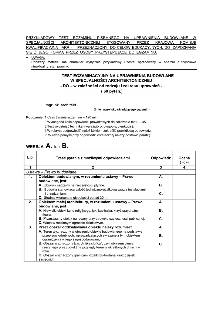 PRZYKŁADOWY TEST EGZAMINU PISEMNEGO NA UPRAWNIENIA BUDOWLANE W SPECJALNOŚCI ARCHITEKTONICZNEJ STOSOWANY PRZEZ KRAJOWĄ KOMISJĘ KWALIFIKACYJNĄ IARP - PRZEZNACZONY DO CELÓW EDUKACYJNYCH, DO ZAPOZNANIA SIĘ Z JEGO FORMĄ PRZEZ OSOBY PRZYSTĘPUJĄCE DO EGZAMINU. UWAGA: Poniższy materiał ma charakter wyłącznie przykładowy i został opracowany w oparciu o częściowo nieaktualny stan prawny. TEST EGZAMINACYJNY NA UPRAWNIENIA BUDOWLANE W SPECJALNOŚCI ARCHITEKTONICZNEJ - DO – w zależności od rodzaju i zakresu uprawnień ( 60 pytań.) mgr inż. architekt ……………………………………………………………………… (Imię i nazwisko składającego egzamin) Pouczenie: 1.Czas trwania egzaminu – 120 min. 2.Wymagana ilość odpowiedzi prawidłowych do zaliczenia testu – 45. 3.Test wypełniać techniką trwałą.(pióro, długopis, cienkopis). 4.W rubryce „odpowiedź” należ kółkiem zakreślić prawidłową odpowiedź. 5.W razie pomyłki przy odpowiedzi ostatecznej należy postawić parafkę. WERSJA A. lub B. L.p. Treść pytania z możliwymi odpowiedziami Odpowiedź 1 2 3 Obiektem budowlanym, w rozumieniu ustawy – Prawo budowlane, jest: A. Zbiornik szczelny na nieczystości płynne. B. Budowla stanowiąca całość techniczno-użytkową wraz z instalacjami A. Ustawa – Prawo budowlane 1. i urządzeniami. 2. C. Studnia wiercona o głębokości ponad 30 m. Obiektem małej architektury, w rozumieniu ustawy – Prawo budowlane, jest: A. Niewielki obiekt kultu religijnego, jak: kapliczka, krzyż przydrożny, B. C. A. B. figura. 3. B. Przestawny stojak na rowery przy budynku użyteczności publicznej. C. Wiata w rodzinnym ogrodzie działkowym. Przez obszar oddziaływania obiektu należy rozumieć: A. Teren wyznaczony w otoczeniu obiektu budowlanego na podstawie C. przepisów odrębnych, wprowadzających związane z tym obiektem ograniczenia w jego zagospodarowaniu. B. Obszar wyznaczony tzw. „linijką słońca”, czyli obrysem cienia rzucanego przez obiekt na przyległy teren w określonych dniach w roku. C. Obszar wyznaczony granicami działki budowlanej oraz działek sąsiednich. B. A. C. Ocena ( +; -) 4 1 4. 2 Przy projektowaniu i budowie należy zapewnić: A. Stały kontakt z właścicielem działki sąsiedniej. B. Bezpieczeństwo pożarowe. C. Cotygodniowe odprawy z udziałem inspektorów państwowego nadzoru budowlanego. 5. 6. 3 A. B. C. Do przepisów techniczno-budowlanych, w rozumieniu ustawy – Prawo budowlane, zalicza się: A. Przepisy BHP. B. Przepisy dotyczące sporządzania planów miejscowych. C. Warunki techniczne użytkowania obiektów budowlanych. A. Wniosek w sprawie zgody na odstępstwo od przepisów techniczno-budowlanych powinien m.in. zawierać: A. Zgodę na odstępstwo właścicieli działek sąsiednich. B. Szczegółowe uzasadnienie konieczności wprowadzenia odstępstwa. C. Egzemplarz projektu budowlanego z oryginalnymi uzgodnieniami A. B. C. B. C. rzeczoznawców budowlanych (p.poż., BHP i Sanepid.). 7. 8. 9. Zapewnienie udziału w opracowaniu projektu budowlanego osób posiadających uprawnienia budowlane w odpowiedniej specjalności i skoordynowanie ich opracowań, należy do obowiązków: A. Inwestora. B. Projektanta. C. Kierownika budowy. Wymagane opinie, uzgodnienia i sprawdzenia rozwiązań projektowych uzyskuje: A. Inspektor nadzoru inwestorskiego. B. Generalny wykonawca. C. Projektant. A. Pozwolenia na budowę nie wymaga budowa: A. Kortów tenisowych. B. Dróg gminnych. C. Mostków i kładek dla pieszych nad ulicami miejskimi. A. B. C. A. B. C. B. C. 10. Zgłoszenia właściwemu organowi wymaga wykonywanie robót budowlanych polegających na : A. Docieplaniu budynku o wysokości do 25 m. B. Instalowaniu reklam świetlnych i podświetlanych, usytuowanych poza obszarem zabudowanym w rozumieniu przepisów o ruchu drogowym. A. B. C. C. Przebudowie budynków mieszkalnych jednorodzinnych, o ile nie prowadzi do zwiększenia dotychczasowego obszaru oddziaływania tych budynków. 11. Do wniosku o pozwolenie na budowę należy m.in. dołączyć: A. Akt notarialny o własności działki. B. Cztery egzemplarze projektu budowlanego. C. Oświadczenie o zgodzie sąsiada na realizację inwestycji. A. B. C. 4 1 12. 2 Przed wydaniem decyzji o pozwoleniu na budowę właściwy organ sprawdza: A. Parametry charakterystyki energetycznej obiektu i ich zgodność z ustawą – Prawo ochrony środowiska. B. Prawidłowość przyjętych w projekcie rozwiązań technicznych. C. Zgodność projektu budowlanego z ustaleniami planu miejscowego albo decyzji o warunkach zabudowy w przypadku braku tego planu. 13. Do terminu wydania pozwolenia na budowę nie wlicza się: A. Okresów usprawiedliwionej nieobecności pracownika organu, proWadzącego sprawę. B. Okresów zawieszenia postępowania. C. Czasu przekazania złożonego wniosku do właściwej w sprawie 3 A. B. C. A. B. C. jednostki organizacyjnej organu. 14. W decyzji o pozwoleniu na budowę właściwy organ, w razie potrzeby, określa terminy rozbiórki: A. Istniejących podziemnych sieci i instalacji, znajdujących się w granicach działki, przeznaczonej na realizację inwestycji. B. Istniejących ogrodzeń działki o wysokości ponad 2,2 m. C. Tymczasowych obiektów budowlanych. 15. Decyzja o pozwoleniu na budowę wygasa jeżeli: A. Nastąpiła zmiana inwestora. B. Budowa nie została rozpoczęta przed upływem 3 lat, licząc od uprawomocnienia się decyzji o pozwoleniu na budowę. C. Została uchwalona zmiana w zapisach planu miejscowego. A. B. C. A. B. C. Rozporządzenie w spr. warunków technicznych, jakim powinny odpowiadać budynki 16. Do budynków użyteczności publicznej zalicza się: A. Domy dziecka. B. Budynki hotelowe z programem Spa. C. Budynki biurowe lub socjalne. A. B. C. 17. Pomieszczeniem technicznym jest pomieszczenie: A. Przeznaczone do wynajęcia na wykonywanie prac warsztatowych. B. Przeznaczone dla urządzeń służących do funkcjonowania i obsługi technicznej budynku. C. P