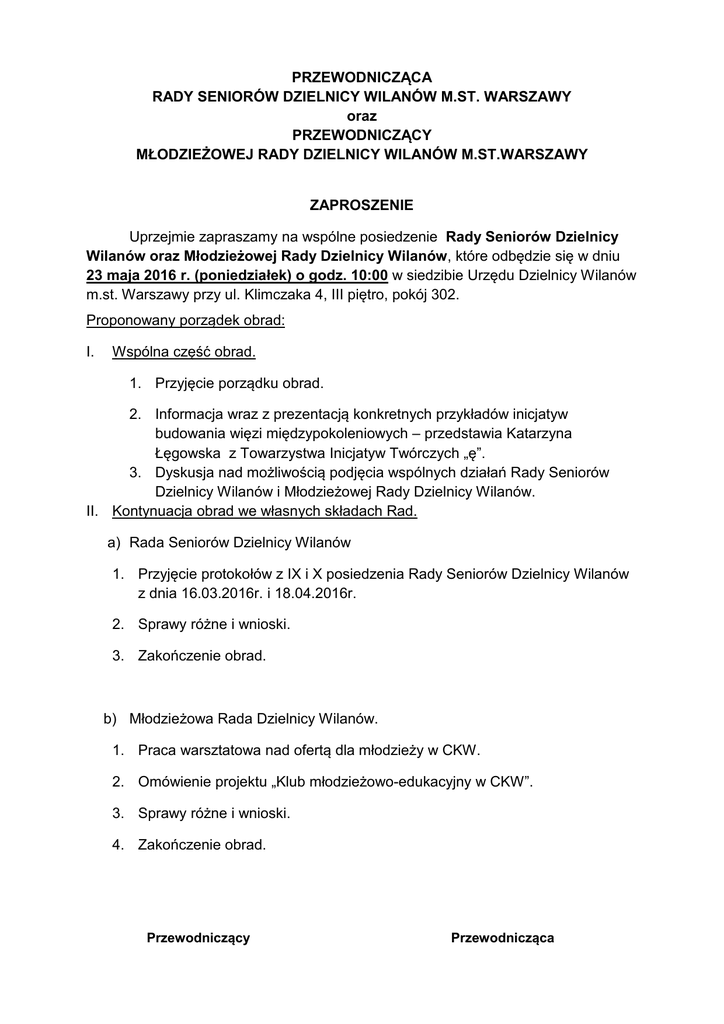 PRZEWODNICZĄCA RADY SENIORÓW DZIELNICY WILANÓW M.ST. WARSZAWY oraz PRZEWODNICZĄCY MŁODZIEŻOWEJ RADY DZIELNICY WILANÓW M.ST.WARSZAWY ZAPROSZENIE Uprzejmie zapraszamy na wspólne posiedzenie Rady Seniorów Dzielnicy Wilanów oraz Młodzieżowej Rady Dzielnicy Wilanów, które odbędzie się w dniu 23 maja 2016 r. (poniedziałek) o godz. 10:00 w siedzibie Urzędu Dzielnicy Wilanów m.st. Warszawy przy ul. Klimczaka 4, III piętro, pokój 302. Proponowany porządek obrad: I. Wspólna część obrad. 1. Przyjęcie porządku obrad. 2. Informacja wraz z prezentacją konkretnych przykładów inicjatyw budowania więzi międzypokoleniowych – przedstawia Katarzyna Łęgowska z Towarzystwa Inicjatyw Twórczych „ę”. 3. Dyskusja nad możliwością podjęcia wspólnych działań Rady Seniorów Dzielnicy Wilanów i Młodzieżowej Rady Dzielnicy Wilanów. II. Kontynuacja obrad we własnych składach Rad. a) Rada Seniorów Dzielnicy Wilanów 1. Przyjęcie protokołów z IX i X posiedzenia Rady Seniorów Dzielnicy Wilanów z dnia 16.03.2016r. i 18.04.2016r. 2. Sprawy różne i wnioski. 3. Zakończenie obrad. b) Młodzieżowa Rada Dzielnicy Wilanów. 1. Praca warsztatowa nad ofertą dla młodzieży w CKW. 2. Omówienie projektu „Klub młodzieżowo-edukacyjny w CKW”. 3. Sprawy różne i wnioski. 4. Zakończenie obrad. Przewodniczący Przewodnicząca Młodzieżowej Rady Dzielnicy Wilanów m.st. Warszawy /-/ Paweł Skrodzki Rady Seniorów Dzielnicy Wilanów m.st. Warszawy /-/ Elżbieta Wiśniewska