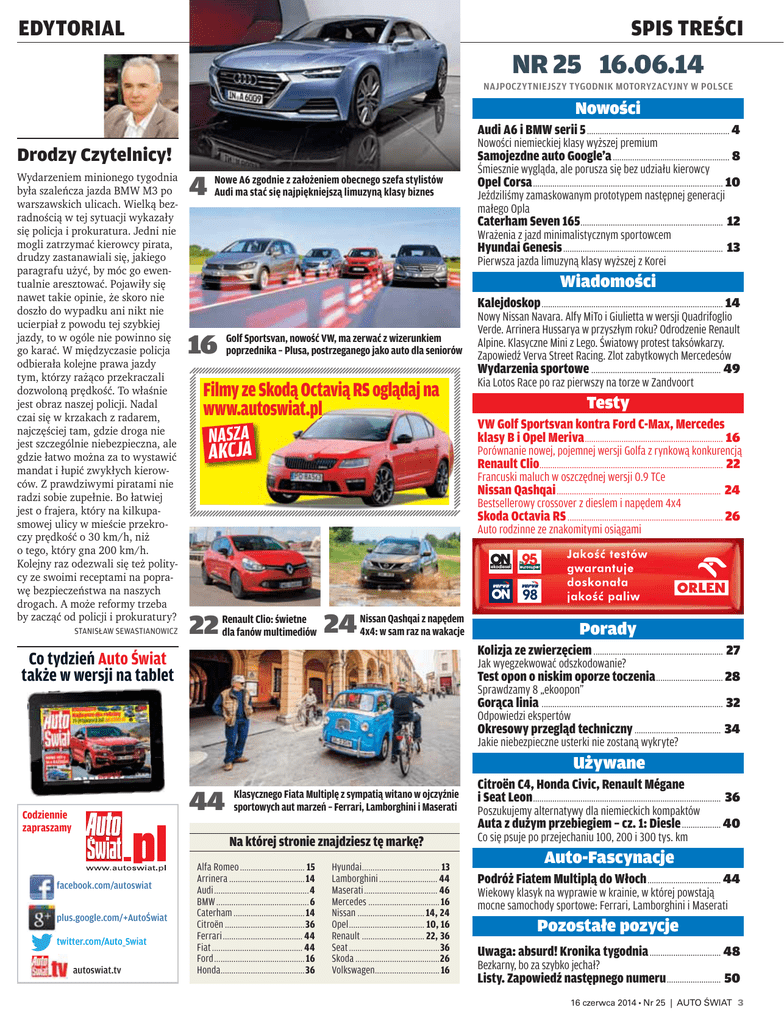 EDYTORIAL SPIS TREŚCI NR 25 16.06.14 NAJPOCZYTNIEJSZY TYGODNIK MOTORYZACYJNY W POLSCE Nowości Audi A6 i BMW serii 5 .................................................................. 4 Nowości niemieckiej klasy wyższej premium Drodzy Czytelnicy! Wydarzeniem minionego tygodnia była szaleńcza jazda BMW M3 po warszawskich ulicach. Wielką bezradnością w tej sytuacji wykazały się policja i prokuratura. Jedni nie mogli zatrzymać kierowcy pirata, drudzy zastanawiali się, jakiego paragrafu użyć, by móc go ewentualnie aresztować. Pojawiły się nawet takie opinie, że skoro nie doszło do wypadku ani nikt nie ucierpiał z powodu tej szybkiej jazdy, to w ogóle nie powinno się go karać. W międzyczasie policja odbierała kolejne prawa jazdy tym, którzy rażąco przekraczali dozwoloną prędkość. To właśnie jest obraz naszej policji. Nadal czai się w krzakach z radarem, najczęściej tam, gdzie droga nie jest szczególnie niebezpieczna, ale gdzie łatwo można za to wystawić mandat i łupić zwykłych kierowców. Z prawdziwymi piratami nie radzi sobie zupełnie. Bo łatwiej jest o frajera, który na kilkupasmowej ulicy w mieście przekroczy prędkość o 30 km/h, niż o tego, który gna 200 km/h. Kolejny raz odezwali się też politycy ze swoimi receptami na poprawę bezpieczeństwa na naszych drogach. A może reformy trzeba by zacząć od policji i prokuratury? STANISŁAW SEWASTIANOWICZ Samojezdne auto Google’a ...................................................... 8 4 Nowe A6 zgodnie z założeniem obecnego szefa stylistów Audi ma stać się najpiękniejszą limuzyną klasy biznes Śmiesznie wygląda, ale porusza się bez udziału kierowcy Opel Corsa ........................................................................................ 10 Jeździliśmy zamaskowanym prototypem następnej generacji małego Opla Caterham Seven 165.................................................................. 12 Wrażenia z jazd minimalistycznym sportowcem Hyundai Genesis .......................................................................... 13 Pierwsza jazda limuzyną klasy wyższej z Korei Wiadomości Kalejdoskop .................................................................................... 14 Sportsvan, nowość VW, ma zerwać z wizerunkiem 16 Golf poprzednika – Plusa, postrzeganego jako auto dla seniorów Filmyy ze Skodąą Octaviąą RS oglądaj g ą j na w.autoswiat.ppl www.autoswiat.pl NASZA AKCJA Nowy Nissan Navara. Alfy MiTo i Giulietta w wersji Quadrifoglio Verde. Arrinera Hussarya w przyszłym roku? Odrodzenie Renault Alpine. Klasyczne Mini z Lego. Światowy protest taksówkarzy. Zapowiedź Verva Street Racing. Zlot zabytkowych Mercedesów Wydarzenia sportowe ............................................................ 49 Kia Lotos Race po raz pierwszy na torze w Zandvoort Testy VW Golf Sportsvan kontra Ford C-Max, Mercedes klasy B i Opel Meriva ................................................................ 16 Porównanie nowej, pojemnej wersji Golfa z rynkową konkurencją Renault Clio..................................................................................... 22 Francuski maluch w oszczędnej wersji 0.9 TCe Nissan Qashqai ............................................................................ 24 Bestsellerowy crossover z dieslem i napędem 4x4 Skoda Octavia RS ........................................................................ 26 Auto rodzinne ze znakomitymi osiągami Nissan Qashqai z napędem Clio: świetne 22 Renault dla fanów multimediów 24 4x4: w sam raz na wakacje Co tydzień Auto Świat także w wersji na tablet Porady Kolizja ze zwierzęciem ............................................................ 27 Jak wyegzekwować odszkodowanie? Test opon o niskim oporze toczenia ............................... 28 Sprawdzamy 8 „ekoopon” Gorąca linia .................................................................................... 32 Odpowiedzi ekspertów Okresowy przegląd techniczny ........................................ 34 Jakie niebezpieczne usterki nie zostaną wykryte? Używane 44 Codziennie zapraszamy Klasycznego Fiata Multiplę z sympatią witano w ojczyźnie sportowych aut marzeń – Ferrari, Lamborghini i Maserati plus.google.com/+AutoŚwiat twitter.com/Auto_Swiat autoswiat.tv Poszukujemy alternatywy dla niemieckich kompaktów Auta z dużym przebiegiem – cz. 1: Diesle .................. 40 Na której stronie znajdziesz tę markę? facebook.com/autoswiat Citroën C4, Honda Civic, Renault Mégane i Seat Leon ....................................................................................... 36 Alfa Romeo .............................. 15 Arrinera ................................... 14 Audi ............................................4 BMW ...........................................6 Caterham ................................. 14 Citroën .....................................36 Ferrari ..................................... 44 Fiat .......................................... 44 Ford .......................................... 16 Honda.......................................36 Hyundai.................................... 13 Lamborghini ........................... 44 Maserati .................................. 46 Mercedes ................................. 16 Nissan ............................... 14, 24 Opel ................................... 10, 16 Renault ............................. 22, 36 Seat ..........................................36 Skoda .......................................26 Volkswagen.............................. 16 Co się psuje po przejechaniu 100, 200 i 300 tys. km Auto-Fascynacje Podróż Fiatem Multiplą do Włoch .................................. 44 Wiekowy klasyk na wyprawie w krainie, w której powstają mocne samochody sportowe: Ferrari, Lamborghini i Maserati Pozostałe pozycje Uwaga: absurd! Kronika tygodnia ................................. 48 Bezkarny, bo za szybko jechał? Listy. Zapowiedź