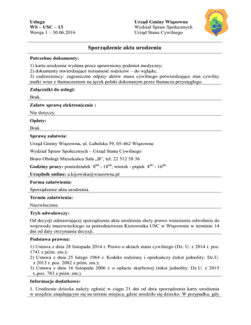 Usługa WS – USC – 13 Wersja 1 – 30.06.2016 Urząd Gminy Wiązowna Wydział Spraw Społecznych Urząd Stanu Cywilnego Sporządzenie aktu urodzenia Potrzebne dokumenty: 1) karta urodzenia wydana przez uprawniony podmiot medyczny; 2) dokumenty stwierdzające tożsamość rodziców – do wglądu; 3) cudzoziemcy: zagraniczne odpisy aktów stanu cywilnego potwierdzające stan cywilny matki wraz z tłumaczeniem na język polski dokonanym przez tłumacza przysięgłego. Załączniki do usługi: Brak. Załatw sprawę elektronicznie : Nie dotyczy. Opłaty: Brak. Sprawę załatwia: Urząd Gminy Wiązowna, ul. Lubelska 59, 05-462 Wiązowna Wydział Spraw Społecznych – Urząd Stanu Cywilnego Biuro Obsługi Mieszkańca Sala „B”, tel. 22 512 58 36 Godziny pracy: poniedziałek 800 - 1800, wtorek - piątek 800 - 1600 Urzędnik online: [email protected] Forma załatwienia: Sporządzenie aktu urodzenia. Termin załatwienia: Niezwłocznie. Tryb odwoławczy: Od decyzji odmawiającej sporządzenia aktu urodzenia służy prawo wniesienia odwołania do wojewody mazowieckiego za pośrednictwem Kierownika USC w Wiązownie w terminie 14 dni od daty otrzymania decyzji. Podstawa prawna: 1) Ustawa z dnia 28 listopada 2014 r. Prawo o aktach stanu cywilnego (Dz. U. z 2014 r. poz. 1741 z późn. zm.); 2) Ustawa z dnia 25 lutego 1964 r. Kodeks rodzinny i opiekuńczy (tekst jednolity: Dz.U. z 2015 r. poz. 2082 z późn. zm.); 3) Ustawa z dnia 16 listopada 2006 r. o opłacie skarbowej (tekst jednolity: Dz.U. z 2015 r.,poz. 783 z późn. zm.). Informacje dodatkowe: 1. Urodzenie dziecka należy zgłosić w ciągu 21 dni od dnia sporządzenia karty urodzenia w urzędzie znajdującym się na terenie miejsca, gdzie urodziło się dziecko. W przypadku, gdy dziecko urodziło się martwe, zgłoszenia należy dokonać w ciągu 3 dni. 2. Zgłoszenia dokonuje się ustnie. 3. Do zgłoszenia urodzenia dziecka są obowiązani ojciec dziecka lub matka, posiadający pełną zdolność do czynności prawnych. 4. Zgłoszenie urodzenia można dokonać również za pośrednictwem pełnomocnika, pełnomocnictwo musi być udzielone na piśmie. 5. Akt urodzenia zostaje sporządzony po potwierdzeniu zgodności danych z aktami stanu cywilnego rodziców. 6. Po sporządzeniu aktu urodzenia wydaje się bezpłatnie jeden odpis aktu urodzenia, dodatkowe odpisy mogą być wydane na wniosek w dowolnym urzędzie stanu cywilnego. Opracował: Sprawdził: Zatwierdził: A. Kijowska A. Kijowska A. Rosłaniec