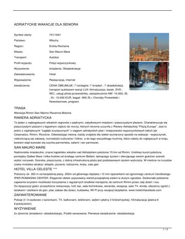 ADRIATYCKIE WAKACJE DLA SENIORA Symbol oferty: 741/1841 Państwo: Włochy Region: Emilia-Romania Miasto: San Mauro Mare Transport: Autokar Profil wyjazdu: Pobyt wypoczynkowy Wyżywienie: śniadanie, Obiadokolacje Zakwaterowanie: Hotel Wyposażenie: Restauracja, Internet świadczenia: CENA OBEJMUJE: 7 noclegów; 7 śniadań , 7 obiadokolacji, transport autokarem wersji LUX /klimatyzacja, barek, DVD , WC/, usługi pilota-przewodnika, ubezpieczenie NW -10.000,-ZŁ , KL- 10.000 EUR, bagaż -800 ZŁ+ Choroby Przewlekłe i Nowotworowe, program. TRASA Wenecja-Rimini-San Marino-Ravenna-Bolonia RIWIERA ADRIATYCKA To jeden z najbogatszych włoskich regionów z pięknymi, zabytkowymi miastami i piaszczystymi plażami. Charakteryzuje się piaszczystymi plażami o łagodnym zejściu do morza, których renoma uczyniła z Riwiery Adriatyckiej "Plażą Europy". Jest to jedno z największych "zagłębi turystycznych" z ciągiem adriatyckich plaż i miejscowości wypoczynkowych takich jak Cesenatico, Rimini, Riccione. Odwiedzając riwierę, każdy znajdzie dla siebie wymarzony sposób na wakacje - wypoczynek, niekończącą się zabawę, rozmaitości kulturalne i folklor, a do tego wszystkiego kuchnię, która należy do najlepszych w kraju, bowiem stąd wywodzi się szynka parmeńska, salami i ser parmezan. SAN MAURO MARE Nadmorskie miasteczko, znane kąpielisko włoskie nad Adriatykiem położone 15 km od Rimini. Urokliwy kurort położony pomiędzy Gatteo Mare i kilka kroków od ścisłego centrum Bellarii, tętniącego życiem i oferującego swoim gościom szeroki wybór rozrywek. Szeroka, piaszczysta, z dobrą infrastrukturą plaża jest podstawowym atutem wybrzeża. W mieście na turystów czeka mnóstwo atrakcji: sklepiki, pizzerie, lodziarnie, kluby, sale gier. HOTEL VILLA CELESTE *** Położony ok. 350 m od bezpłatnej plaży, 250m od głównego deptaka i 10 min spacerkiem od ogromnego centrum handlowego IPER-ROMAGNA CENTER. Elegancki obiekt usytuowany wśród przepięknej zieleni w dużym ogrodzie. Doskonałe położenie zapewnia turystom możliwość korzystania z regularnych środków transportu do centrum Rimini przez cały dzień i noc. Do dyspozycji gości: przeszklona restauracja, holl, bar, sala kominkowa, weranda, recepcja, sala TV, winda, obszerny ogród z leżakami i stolikami do gier, plac zabaw dla dzieci, huśtawka, WI-FI przy recepcji bezpłatnie. www.hotelvillaceleste.com ZAKWATEROWANIE Pokoje 2 i 3-osobowe z łazienkami, TV, balkonami, telefonem, sejfem (płatny 2 €/dzień/pokój). Klimatyzacja (płatna 6 €/pokój/dzień). WYŻYWIENIE 2x dziennie (śniadania i obiadokolacje), Posiłki serwowane. Pierwsze świadczenie- obiadokolacja 1/3 Ostatnie świadczenie: śniadanie PROGRAM I DZIEŃ - Wyjazd z Polski.Przejazd przez Czechy, Austrię do Włoch . II DZIEŃ - we wczesnych godz.rannych przyjazd do WENECJI - rejs statkiem po kanałach, zwiedzanie miasta: Plac i Bazylika Św. Marka, Pałac Dożów (z zewnątrz), Most Rialto, Most Westchnień (przerwa w podróży 9 godz.). Przejazd do Rimini. Zakwaterowanie, DRINK powitalny-zapoznanie z okolicą, obiadokolacja, nocleg. III DZIEŃ - NORDIC WALKING wzdłuż wybrzeża o wschodzie słońca, wypoczynek i plażowanie. ZAJĘCIA -Język włoski towarzyski IV DZIEŃ- po śniadaniu wyjazd autokarem na wycieczkę: RIMINI-STOLICA RIVIERY ADRIATYCKIEJ zwiedzanie miasta: Stare Miasto, Łuk Augusta, Most Tyberiusza, Piazza Cavour, następnie czas wolny na największym bazarze Rimini. Powrót do hotelu - wypoczynek, plażowanie, ZAJĘCIA- DRINKI TROPIKALNE- przyrządzanie i składniki, obiadokolacja, nocleg. V DZIEŃ- NORDIC WALKING wzdłuż wybrzeża o wschodzie słońca, wypoczynek i plażowanie. ZAJĘCIA - POZNAJEMY KUCHNIĘ WŁOSKĄ VI DZIEŃ- po śniadaniu wyjazd na wycieczkę autokarową SAN MARINO-NAJSTARSZA REPUBLIKA ŚWIATA- zwiedzanie miasta: Brama Św.Franciszka, Ogrody, Brama Łuczników, Bazylika Św.Marino, Piazza della Liberta z Ratuszem trzy wieże: La Guaita, La Cesta i La Montale i ewentualne zakupy. Powrót do hotelu, obiadokolacja, nocleg. VII DZIEŃ- NORDIC WALKING wzdłuż wybrzeża o wschodzie słońca wypoczynek i plażowanie. ZAJĘCIA- POZNAJ NOWE SMAKI” jak jeść, przyrządzać i nie bać się Frutti di Mare. VIII DZIEŃ - po śniadaniu wyjazd na wycieczkę autokarową do RAVENNY - jednego z najpiękniejszych miast Riwiery Adriatyckiej - znanego centrum mozaikarstwa - zwiedzanie m.in. Bazylika Usiano Grób Dante Alighieri, Kościół San Vitale czas wolny. Powrót do hotelu - wypoczynek, plażowanie, WIECZÓR WŁOSKI - kolacja regionalna przy świecach IX DZIEŃ -po śniadaniu przejazd do BOLONII- zwiedzanie stolicy regionu Emilia -Romania: zabytkowe centrum Piazza Maggiore, Piazza del Nettuno, bazylika S.Petronio, Piazza di Ravegnata ze słynnymi wieżami. Po zakończeniu zwiedzania wyjazd w drogę powrotną do Polski, nocny przejazd przez Austrię, X DZIEŃ- przejazd przez Austrię, Czechy Powrót w godz. porannych. CENA OBEJMUJE -7 noclegów -7 śniadań, 7 obiadokolacji, -transport autokarem wersji LUX /klimatyzacja, barek, DVD, WC/, -usługi pilota-przewodnika, -ubezpieczenie NW -10.000,-ZŁ, KL- 10.000 EUR, bagaż -800 ZŁ+ Choroby Przewlekłe i Nowotworowe -program UWAGI -napoje do obiadokolacji płatne dodatkowo -dopłata do pokoju 1-osobowego - 290,-zł -Na bilety wstępu do zwiedzanych obiektów, statek w Wenecji uczestnik powinien posiadać-ok.40 EUR Atrakcje: WYCIECZKI FAKULTATYWNIE: - WIECZOREK TANECZNY z zespołem na żywo, nauka tańców włoskich w grupach (płatne 250 EUR/grupa), - REJS statkiem po Adriatyku do CATTOLICA z tańcami, winem i poczęstunkiem (płatne 22 EUR/os), - RZYM- ok.45 EUR - ITALIA W MINIATURZE - 20 EUR TERMINY: od: 2017-04-28 do: 2017-05-07 (10 dni), miejsca: sprawdź miejsca cena od: 1590 PLN od: 2017-05-19 do: 2017-05-28 (10 dni), miejsca: sprawdź miejsca cena od: 1590 PLN 2/3 od: 2017-06-02 do: 2017-06-11 (10 dni), miejsca: sprawdź miejsca cena od: 1590 PLN od: 2017-09-01 do