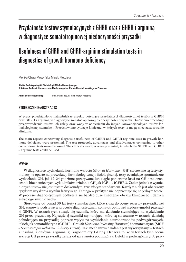 Streszczenia / Abstracts Przydatność testów stymulacyjnych z GHRH oraz z GHRH i argininą w diagnostyce somatotropinowej niedoczynności przysadki Usefulness of GHRH and GHRH-arginine stimulation tests in diagnostics of growth hormone deficiency Monika Obara-Moszyńska Marek Niedziela Klinika Endokrynologii i Diabetologii Wieku Rozwojowego, II Katedra Pediatrii Uniwersytetu Medycznego im. Karola Marcinkowskiego w Poznaniu Adres do korespondencji: Prof. UM dr hab. n. med. Marek Niedziela Streszczenie/Abstracts W pracy przedstawiono najważniejsze aspekty dotyczące przydatności diagnostycznej testów z GHRH oraz GHRH i argininą w diagnostyce somatotropinowej niedoczynności przysadki. Omówiono procedury przeprowadzenia testów, ich zalety oraz wady w odniesieniu do innych konwencjonalnych testów farmakologicznej stymulacji. Przedstawiono sytuacje kliniczne, w których testy te mogą mieć zastosowanie kliniczne. The main aspects concerning diagnostic usefulness of GHRH and GHRH-arginine tests in growth hormone deficiency were presented. The test protocols, advantages and disadvantages comparing to other conventional tests were discussed. The clinical situations were presented, in which the GHRH and GHRH – arginine tests could be used. Wstęp W diagnostyce wydzielania hormonu wzrostu (Growth Hormone – GH) stosowane są testy stymulacyjne oparte na prowokacji farmakologicznej i fizjologicznej, testy oceniające spontaniczne wydzielanie GH, jak 12–24 godzinne przerywane lub ciągłe pobieranie krwi na GH oraz oznaczanie biochemicznych wykładników działania GH jak IGF -1, IGFBP-3. Żaden jednak z wymienionych testów nie jest testem doskonałym, tzw. złotym standardem. Każdy z nich jest obarczony ryzykiem uzyskania wyniku fałszywego. Dlatego w praktyce nie poprzestaje się na jednym teście. W procesie diagnostycznym podkreśla się bardzo duże znaczenie obrazu klinicznego i danych auksologicznych dziecka. Stosowane od ponad 30 lat testy stymulacyjne, które służą do oceny rezerwy przysadkowej GH, stanowią podstawę w procesie diagnostycznym somatotropinowej niedoczynności przysadki (SNP). W testach tych stosuje się czynnik, który ma działanie stymulujące na wydzielanie GH przez przysadkę. Najczęściej czynniki stymulujące, które są stosowane w testach, działają pobudzająco na przysadkę poprzez wpływ na wydzielanie neurohormonów podwzgórzowych, takich jak somatoliberyna (GHRH – Growth Hormone Releasing Hormone) i somatostatyna (SRIF – Somatotropin Release-Inhibitory Factor). Taki mechanizm działania jest wykorzystany w testach z insuliną, klonidyną, argininą, glukagonem czy L-Dopą. Oznacza to, że w testach tych ocena sekrecji GH przez przysadkę zależy od sprawności podwzgórza. Defekt w podwzgórzu i/lub przy29 Endokrynol. Ped., vol. 9/2009, Suplement nr 1 sadce spowoduje nieprawidłową odpowiedź na czynnik stymulujący bez możliwości zróżnicowania miejsca uszkodzenia. Z punktu widzenia klinicysty, który ma na celu wykluczenie niedoboru GH, fakt ten nie ma zasadniczego znaczenia. Test z zastosowaniem biosyntetycznego GHRH daje możliwość różnicowania pacjentów z dysfunkcją przysadki od pacjentów z nieprawidłowościami w obrębie podwzgórza. W indywidualnych przypadkach klinicznych ustalenie miejsca uszkodzenia może mieć wpływ na postępowanie diagnostyczne i terapeutyczne. Test z GHRH GHRH jest peptydowym hormonem produkowanym przez neurony w jądrze łukowatym podwzgórza. U człowieka występują dwie formy GHRH; zbudowane z 40 i 44 aminokwasów. Dotychczas nie wyjaśniono, który rodzaj izoformy ma większe znaczenie fizjologiczne. GHRH działa poprzez receptory umiejscowione w przednim płacie przysadki. Receptor GHRH (GHRHR) sprzężony jest z białkiem G. Przekazanie sygnału odbywa się poprzez cAMP. Aktywacja receptora w somatotropach prowadzi do pobudzenia syntezy i sekrecji GH. Somatoliberyna wraz z somatostatyną są odpowiedzialne za pulsacyjne wydzielanie GH. Efekty działania GHRH są częściowo hamowane przez SRIF. Odkryta w ostatnich latach ghrelina – analog enkefaliny, działa synergistycznie z GHRH. To działanie stymulujące jest silniejsze od somatoliberyny i zależne od prawidłowej budowy i funkcji receptora dla GHRH. Dowiedziono również, że stymulacja GHSR (GH Secretagogue Receptor) przez ghrelinę warunkuje sekrecję hormonu wzrostu pod wpływem GHRH [1]. Nieprawidłowa synteza, sekrecja i działanie GHRH prowadzą do niedoboru hormonu wzrostu. Patologie zarówno wrodzone, jak i nabyte w obrębie podwzgórza mogą być przyczyną niedoboru somatoliberyny. Do zmian nabytych, które mogą powodować uszkodzenie podwzgórza, należą: 1) urazy czaszkowo-mózgowe w okresie dzieciństwa i okołoporodowe związane z niedotlenieniem, porodem kleszczowym oraz pośladkowym, 2) guzy wewnątrzczaszkowe jak np. craniopharyngioma (najczęstsza postać guza okolicy przysadkowo-podwzgórzowej u dzieci), germinoma, glejak nerwu wzrokowego, histiocytoza X oraz stan po operacji guza, 3) procesy zapalne w obrębie jamy czaszki (o etiologii bakteryjnej, wirusowej, grzybiczej, pasożytniczej), 4) nacieczenia komórkowe w obrębie OUN (sarkoidoza, gruźlica, hemochromatoza), 5) zaburzenia krążeniowo-naczyniowe, 6) stan po radioterapii lub chemioterapii. Postaci wrodzone niedoboru GHRH głównie uwarunkowane są zmianami organicznymi. Zmiany organiczne występują w postaci bezmózgowia oraz wad linii środkowej mózgowia, jak holoprosencefalia, dysplazja przegrodowo-wzrokowa, rozszczep wargi i podniebienia, nieprawidłowe uzębienie szczęki górnej (single central incisor), przepuklina podstawy mózgu. Nieprawidłowy rozwój narządów linii pośrodkowej może prowadzić do różnego rodzaju wad wrodzonych, w tym obejmujących podwzgórze i przysadkę [2]. Podkreśla się fakt jednoczesnego występowania wad w obrębie części środkowej twarzy jako rezultatu zaburzeń mezenchymalnych z niedoczynnością przy