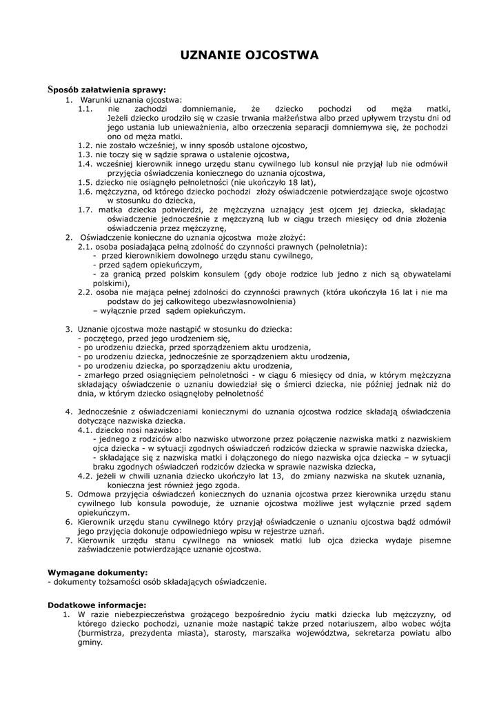 UZNANIE OJCOSTWA Sposób załatwienia sprawy: 1. Warunki uznania ojcostwa: 1.1. nie zachodzi domniemanie, że dziecko pochodzi od męża matki, Jeżeli dziecko urodziło się w czasie trwania małżeństwa albo przed upływem trzystu dni od jego ustania lub unieważnienia, albo orzeczenia separacji domniemywa się, że pochodzi ono od męża matki. 1.2. nie zostało wcześniej, w inny sposób ustalone ojcostwo, 1.3. nie toczy się w sądzie sprawa o ustalenie ojcostwa, 1.4. wcześniej kierownik innego urzędu stanu cywilnego lub konsul nie przyjął lub nie odmówił przyjęcia oświadczenia koniecznego do uznania ojcostwa, 1.5. dziecko nie osiągnęło pełnoletności (nie ukończyło 18 lat), 1.6. mężczyzna, od którego dziecko pochodzi złoży oświadczenie potwierdzające swoje ojcostwo w stosunku do dziecka, 1.7. matka dziecka potwierdzi, że mężczyzna uznający jest ojcem jej dziecka, składając oświadczenie jednocześnie z mężczyzną lub w ciągu trzech miesięcy od dnia złożenia oświadczenia przez mężczyznę, 2. Oświadczenie konieczne do uznania ojcostwa może złożyć: 2.1. osoba posiadająca pełną zdolność do czynności prawnych (pełnoletnia): - przed kierownikiem dowolnego urzędu stanu cywilnego, - przed sądem opiekuńczym, - za granicą przed polskim konsulem (gdy oboje rodzice lub jedno z nich są obywatelami polskimi), 2.2. osoba nie mająca pełnej zdolności do czynności prawnych (która ukończyła 16 lat i nie ma podstaw do jej całkowitego ubezwłasnowolnienia) – wyłącznie przed sądem opiekuńczym. 3. Uznanie ojcostwa może nastąpić w stosunku do dziecka: - poczętego, przed jego urodzeniem się, - po urodzeniu dziecka, przed sporządzeniem aktu urodzenia, - po urodzeniu dziecka, jednocześnie ze sporządzeniem aktu urodzenia, - po urodzeniu dziecka, po sporządzeniu aktu urodzenia, - zmarłego przed osiągnięciem pełnoletności - w ciągu 6 miesięcy od dnia, w którym mężczyzna składający oświadczenie o uznaniu dowiedział się o śmierci dziecka, nie później jednak niż do dnia, w którym dziecko osiągnęłoby pełnoletność 4. Jednocześnie z oświadczeniami koniecznymi do uznania ojcostwa rodzice składają oświadczenia dotyczące nazwiska dziecka. 4.1. dziecko nosi nazwisko: - jednego z rodziców albo nazwisko utworzone przez połączenie nazwiska matki z nazwiskiem ojca dziecka - w sytuacji zgodnych oświadczeń rodziców dziecka w sprawie nazwiska dziecka, - składające się z nazwiska matki i dołączonego do niego nazwiska ojca dziecka – w sytuacji braku zgodnych oświadczeń rodziców dziecka w sprawie nazwiska dziecka, 4.2. jeżeli w chwili uznania dziecko ukończyło lat 13, do zmiany nazwiska na skutek uznania, konieczna jest również jego zgoda. 5. Odmowa przyjęcia oświadczeń koniecznych do uznania ojcostwa przez kierownika urzędu stanu cywilnego lub konsula powoduje, że uznanie ojcostwa możliwe jest wyłącznie przed sądem opiekuńczym. 6. Kierownik urzędu stanu cywilnego który przyjął oświadczenie o uznaniu ojcostwa bądź odmówił jego przyjęcia dokonuje odpowiedniego wpisu w rejestrze uznań. 7. Kierownik urzędu stanu cywilnego na wniosek matki lub ojca dziecka wydaje pisemne zaświadczenie potwierdzające uznanie ojcostwa. Wymagane dokumenty: - dokumenty tożsamości osób składających oświadczenie. Dodatkowe informacje: 1. W razie niebezpieczeństwa grożącego bezpośrednio życiu matki dziecka lub mężczyzny, od którego dziecko pochodzi, uznanie może nastąpić także przed notariuszem, albo wobec wójta (burmistrza, prezydenta miasta), starosty, marszałka województwa, sekretarza powiatu albo gminy. 2. Jeżeli oświadczenie o uznaniu ojcostwa składa cudzoziemiec, nie znający języka polskiego, musi to uczynić w obecności tłumacza, którego obecność zapewniają osoby składające oświadczenie. Opłata skarbowa: Czynność zwolniona z opłaty skarbowej. Termin załatwienia: W dniu złożenia wniosku. Jednostka odpowiedzialna: Urząd Stanu Cywilnego, wejście główne, parter, pokój nr 1, tel. 74 645-08-44, 74 645-08-45, 74 645-08-46, 74 645-08-47. Tryb odwoławczy i skargowy: Kierownik urzędu stanu cywilnego albo konsul, który odmówi przyjęcia oświadczeń koniecznych do uznania ojcostwa w terminie 7 dni od dnia odmowy - powiadamia pisemnie matkę dziecka i mężczyznę, który twierdzi, że jest ojcem dziecka o przyczynach odmowy oraz możliwości uznania ojcostwa przed sądem opiekuńczym. Podstawa prawna: art. 63, 64, 65, 66, 19 i 32 ustawy - Prawo o aktach stanu cywilnego - z dnia 28 listopada 2014, (Dz.U z 2014, poz. 1741 z późn. zm.).art.72, 73, 74, 75, 76, 77, 78, 79, 80, 81, 82, 83 - Kodeks Rodzinny i Opiekuńczy /tekst jednolity Dz. U. z 2015, poz. 583/. Formularze wniosków: Wniosek składa się ustnie.