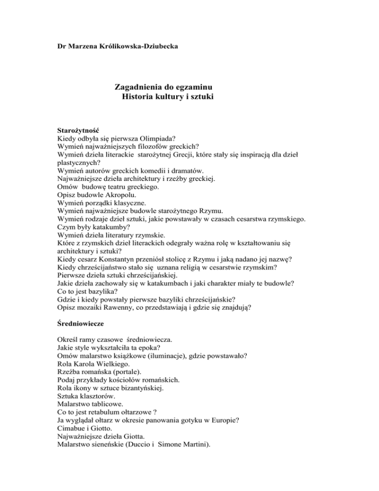 Dr Marzena Królikowska-Dziubecka Zagadnienia do egzaminu Historia kultury i sztuki Starożytność Kiedy odbyła się pierwsza Olimpiada? Wymień najważniejszych filozofów greckich? Wymień dzieła literackie starożytnej Grecji, które stały się inspiracją dla dzieł plastycznych? Wymień autorów greckich komedii i dramatów. Najważniejsze dzieła architektury i rzeźby greckiej. Omów budowę teatru greckiego. Opisz budowle Akropolu. Wymień porządki klasyczne. Wymień najważniejsze budowle starożytnego Rzymu. Wymień rodzaje dzieł sztuki, jakie powstawały w czasach cesarstwa rzymskiego. Czym były katakumby? Wymień dzieła literatury rzymskie. Które z rzymskich dzieł literackich odegrały ważna rolę w kształtowaniu się architektury i sztuki? Kiedy cesarz Konstantyn przeniósł stolicę z Rzymu i jaką nadano jej nazwę? Kiedy chrześcijaństwo stało się uznana religią w cesarstwie rzymskim? Pierwsze dzieła sztuki chrześcijańskiej. Jakie dzieła zachowały się w katakumbach i jaki charakter miały te budowle? Co to jest bazylika? Gdzie i kiedy powstały pierwsze bazyliki chrześcijańskie? Opisz mozaiki Rawenny, co przedstawiają i gdzie się znajdują? Średniowiecze Określ ramy czasowe średniowiecza. Jakie style wykształciła ta epoka? Omów malarstwo książkowe (iluminacje), gdzie powstawało? Rola Karola Wielkiego. Rzeźba romańska (portale). Podaj przykłady kościołów romańskich. Rola ikony w sztuce bizantyńskiej. Sztuka klasztorów. Malarstwo tablicowe. Co to jest retabulum ołtarzowe ? Ja wyglądał ołtarz w okresie panowania gotyku w Europie? Cimabue i Giotto. Najważniejsze dzieła Giotta. Malarstwo sieneńskie (Duccio i Simone Martini). Wymień i opisz cechy katedry gotyckiej. Epoka nowożytna Wymień, kiedy zaczęły powstawać książki drukowane? Kto wynalazł ruchomą czcionkę? Jaki rodzaj ilustracji zaczęto stosować w XV wieku? Jakie style ukształtowały się w czasach nowożytnych ? Malarstwo renesansu – Masaccio. Malarze XV w. we Florencji ( Sandro Botticelli) Malarstwo braci van Eyck Leonardo da Vinci. Malarstwo Rafaela. Sztuka Michała Anioła. Budowa nowej bazyliki watykańskiej.. Rola Rzymu w dobie renesansu. Kultura renesansu poza Italią Jakie wydarzenie w XVI wieku wpłynęło na kształtowanie się sztuki? Znaczenie reformacji i jej wpływ na podział w artystycznych dziejach Europy. Sobór Trydencki i jego znaczenie. Odkrycia geograficzne. Co wpłynęło na ukształtowanie się sztuki baroku? Malarstwo Caravaggia. Malarstwo flamandzkie. Sztuka Holandii XVII wieku. Co można powiedzieć o twórczości Rembrandta van Rijn? Rola Rubensa w dziejach sztuki. Sztuka klasycyzmu ( J.L.David, A. Canova) Jakie cechy posiadała architektura neoklasycyzmu? Lektura podstawowa: Davies Norman , Europa, rozprawa historyka z historią , przekład Elżbieta Tabakowska, Wydawnictwo ZNAK, Kraków 2003 ( również wydanie ukraińskie) Gombrich Ernest, O sztuce, Wydawnictwo Arkady (potem Rebis) Warszawa 1997 ( i następne wydania) Białostocki Jan, Sztuka cenniejsza niż złoto. Opowieść o sztuce europejskiej naszej ery, Wydawnictwo Naukowe PWN, Warszawa 2006 Literatura uzupełniająca: Słownik terminologiczny sztuk pięknych, ( Nowe wydanie), Wydawnictwo Naukowe PWN, Warszawa (różne wydania)