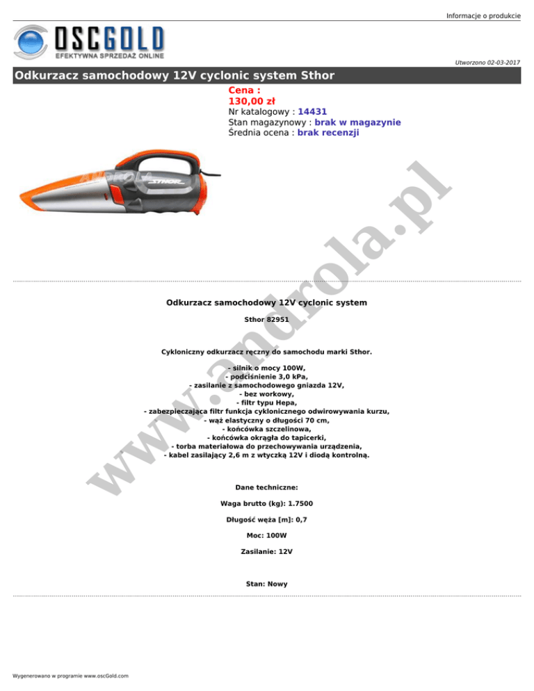 Informacje o produkcie Utworzono 02-03-2017 Odkurzacz samochodowy 12V cyclonic system Sthor Cena : 130,00 zł ro la .p l Nr katalogowy : 14431 Stan magazynowy : brak w magazynie Średnia ocena : brak recenzji Odkurzacz samochodowy 12V cyclonic system nd Sthor 82951 Cykloniczny odkurzacz ręczny do samochodu marki Sthor. w w w .a - silnik o mocy 100W, - podciśnienie 3,0 kPa, - zasilanie z samochodowego gniazda 12V, - bez workowy, - filtr typu Hepa, - zabezpieczająca filtr funkcja cyklonicznego odwirowywania kurzu, - wąż elastyczny o długości 70 cm, - końcówka szczelinowa, - końcówka okrągła do tapicerki, - torba materiałowa do przechowywania urządzenia, - kabel zasilający 2,6 m z wtyczką 12V i diodą kontrolną. Dane techniczne: Waga brutto (kg): 1.7500 Długość węża [m]: 0,7 Moc: 100W Zasilanie: 12V Stan: Nowy Wygenerowano w programie www.oscGold.com