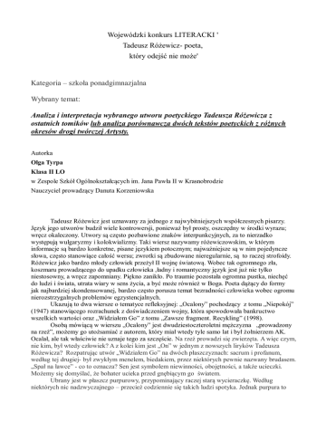 Wojewódzki konkurs LITERACKI ' Tadeusz Różewicz- poeta, który odejść nie może' Kategoria – szkoła ponadgimnazjalna Wybrany temat: Analiza i interpretacja wybranego utworu poetyckiego Tadeusza Różewicza z ostatnich tomików lub analiza porównawcza dwóch tekstów poetyckich z różnych okresów drogi twórczej Artysty. Autorka Olga Tyrpa Klasa II LO w Zespole Szkół Ogólnokształcących im. Jana Pawła II w Krasnobrodzie Nauczyciel prowadzący Danuta Korzeniowska Tadeusz Różewicz jest uznawany za jednego z najwybitniejszych współczesnych pisarzy. Język jego utworów budził wiele kontrowersji, ponieważ był prosty, oszczędny w środki wyrazu; wręcz okaleczony. Utwory są często pozbawione znaków interpunkcyjnych, za to nierzadko występują wulgaryzmy i kolokwializmy. Taki wiersz nazywamy różewiczowskim, w którym informacje są bardzo konkretne, pisane językiem potocznym; najważniejsze są w nim pojedyncze słowa, często stanowiące całość wersu; zwrotki są zbudowane nieregularnie, są to raczej strofoidy. Różewicz jako bardzo młody człowiek przeżył II wojnę światową. Wobec tak ogromnego zła, koszmaru prowadzącego do upadku człowieka ,ładny i romantyczny język jest już nie tylko niestosowny, a wręcz zapomniany. Piękno zanikło. Po traumie pozostała ogromna pustka, niechęć do ludzi i świata, utrata wiary w sens życia, a być może również w Boga. Poeta dążący do formy jak najbardziej skondensowanej, bardzo często porusza temat bezradności człowieka wobec ogromu nierozstrzygalnych problemów egzystencjalnych. Ukazują to dwa wiersze o tematyce refleksyjnej: „Ocalony” pochodzący z tomu „Niepokój” (1947) stanowiącego rozrachunek z doświadczeniem wojny, która spowodowała bankructwo wszelkich wartości oraz „Widziałem Go” z tomu „Zawsze fragment. Recykling” (1998). Osobą mówiącą w wierszu „Ocalony” jest dwudziestoczteroletni mężczyzna „prowadzony na rzeź”, możemy go utożsamiać z autorem, który miał wtedy tyle samo lat i był żołnierzem AK. Ocalał, ale tak właściwie nie uznaje tego za szczęście. Na rzeź prowadzi się zwierzęta. A więc czym, nie kim, był wtedy człowiek? A z kolei kim jest „On” w jednym z nowszych liryków Tadeusza Różewicza? Rozpatrując utwór „Widziałem Go” na dwóch płaszczyznach: sacrum i profanum, według tej drugiej- był zwykłym menelem, biedakiem, przez niektórych pewnie nazwany brudasem. „Spał na ławce” - co to oznacza? Sen jest symbolem niewinności, obojętności, a także ucieczki. Możemy się domyślać, że bohater ucieka przed gnębiącym go światem. Ubrany jest w płaszcz purpurowy, przypominający raczej starą wycieraczkę. Według niektórych nic nadzwyczajnego – przecież codziennie się takich ludzi spotyka. Jednak purpura to znak potęgi i władzy, z sakralnego punktu widzenia można w tym dostrzec kontekst biblijny. Tak Św. Marek opisuje wyśmianie króla: „Żołnierze zaprowadzili Go na wewnętrzny dziedziniec, czyli pretorium, i zwołali całą kohortę. Ubrali Go w purpurę i uplótłszy wieniec z ciernia włożyli Mu na głowę.” (Mk 15, 16-17) Trzy swetry: czarny – żałoba, biały – niewinność, zielony – nadzieja straciły już kolor. Być może to również oznacza utratę nadziei i znów pogrążenie się w sen. „Spał spokojnie jak dziecko”. „Odzież” tego człowieka ma także znaczenie dosłowne. Miał czapkę i rękawiczki, zresztą dziurawe... Z tego wniosek, że musiała już być zima. On na pewno bardzo cierpiał i drżał z wyziębienia. Dlaczego pozwalamy na takie cierpienie drugiego człowieka? Jesteśmy obojętni na los biedniejszych, często ich nawet nie dostrzegamy, bo już się przyzwyczailiśmy, bo zabieganym jak zwykle brakuje na wszystko czasu i oczywiście zawsze mają coś ważniejszego na głowie. Nie zauważamy, a również może nie chcemy zauważać dewastacji przyrody. Biedak siedział na ławce w parku (to miejsce powinno być nazwane wysypiskiem śmieci) pomiędzy drzewkiem, „blaszaną puszką po piwie i podpaską zawieszoną na krzaku dzikiej róży”. „Krzak dzikiej róży ” to również tytuł cyklu sonetów Jana Kasprowicza, który interpretuje się jako poetykę symbolizmu – dostrzegania w jednym pojęciu wielu ukrytych znaczeń. W ten sposób również odczytujemy opisywany wiersz. Taka jest współczesna rzeczywistość. Zaniedbujemy środowisko, często otoczenie własnego miejsca zamieszkania, bo jesteśmy nieczuli na piękno krajobrazu. My zatraciliśmy pewne wartości jak „Ocaleni” podczas II Wojny Światowej. Z tym, że oni mieli do tego powody, doznali takiej traumy, że przestali dostrzegać wszelkie wartości, bądź je mylili. Były one tylko pustymi słowami, nie znajdującymi odzwierciedlenia w rzeczywistości. Człowiek porównany do zwierzęcia, wróg do przyjaciela. Miłość mylona z nienawiścią, a ciemność ze światłem. My nie potrafimy sobie nawet wyobrazić: jak można nie dostrzegać różnicy między tak przeciwstawnymi pojęciami. Niestety, to powodowała wojna – okrucieństwo wobec niewinnych oraz bezbronnych ludzi. Zatracono kanon moralny. Współczesne pokolenie nie ma prawa do utraty jakichkolwiek wartości, ale coraz częściej pokazujemy poprzez swoje postawy, że nie jesteśmy patriotami. Nie musimy walczyć o ojczyznę, oddawać swojego życia, dzięki „Ocalonym”, bo oni walczyli i zapłacili wysoka cenę; byli skłonni do największego poświecenia, a my? Jesteśmy leniwi, obojętni, przeważnie nie wykazujemy najmniejszego zainteresowania osobami potrzebującymi naszej pomocy, wypowiadamy słowa: „To nie moja sprawa, nie obchodzi mnie to.” Otrzymujemy dlatego przestrogę, tak jak Ci po lewej stronie w Ewangelii według Św. Mateusza „Idźcie precz ode Mnie, przeklęci w ogień wieczny, przygotowany diabłu i jego aniołom! Bo byłem głodny, a nie daliście Mi jeść; byłem spragniony, a nie d
