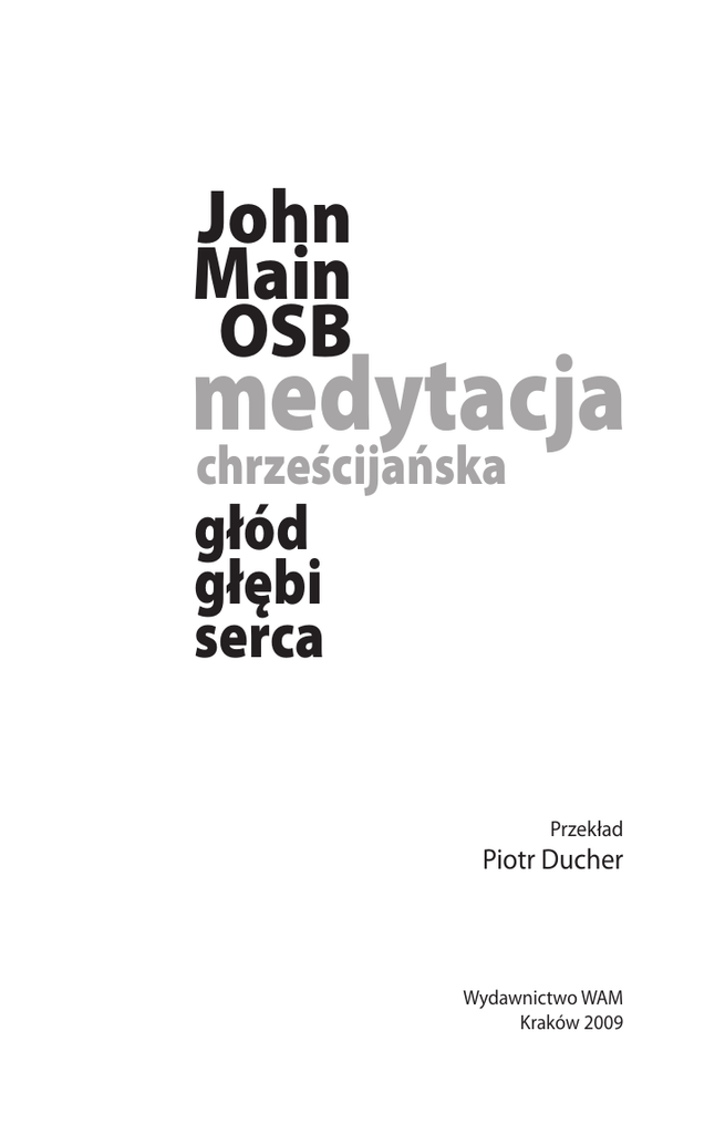 John Main OSB medytacja chrześcijańska głód głębi serca Przekład Piotr Ducher Wydawnictwo WAM Kraków 2009 13 John Main i medytacja chrześcijańska John Main, irlandzki benedyktyn, był jednym z nauczycieli modlitwy, który wywarł szczególny wpływ na nasze czasy. Urodził się w Anglii w 1926 roku. Zmarł pięćdziesiąt sześć lat później w Kanadzie. Dla o. Bede Griffithsa, którego najbardziej znane książki zaczęły ukazywać się niedługo po śmierci o. Johna, był „najważniejszym przewodnikiem duchowym dzisiejszego Kościoła”. Kiedy w młodości pracował jako dyplomata na Dalekim Wschodzie, John Main poznał Satyanandę, hinduskiego swamiego, który wprowadził go w praktykę medytacji. Nie odstępując nigdy od wiary chrześcijańskiej, John Main natychmiast rozpoznał wartość tej praktyki, która pogłębiła i ubogaciła inne znane mu formy modlitwy chrześcijańskiej. Dopiero po latach w pełni uświadomił sobie, jak bardzo cicha modlitwa serca pozostaje zakorzeniona w tradycji chrześcijańskiej. W nowym świetle ujrzał naukę Jezusa o modlitwie i z innym spojrzeniem przeczytał spisane przez Jana Kasjana barwne opisy życia pierwszych mnichów chrześcijańskich – Ojców i Matek pustyni, którzy w pokorze nauczali i praktykowali prostą dyscyplinę „modlitwy jednego słowa”, czyli tak zwaną modlitwę monologiczną (monologistos). Zobaczył, że ta dyscyplina ma moc pokonania rozproszeń, które szczególnie podczas modlitwy, ale i w trakcie innych zajęć, nieuchronnie pojawiają się w umyśle. W powtarzaniu mantry dostrzegał metodę umożliwiającą osiągnięcie pokoju, który tradycja prawosław- 14 JOHN MAIN I MEDYTACJA CHRZEŚCIJAŃSKA na określa mianem hezychii, oraz „modlitwy czystej” będącej „oddawaniem czci w Duchu i prawdzie”. Zobaczył, że dyscyplina powtarzania mantry oczyszcza serce z przeciwstawnych pragnień i jednoczy ludzi. Miejscem tego zjednoczenia staje się serce – w nim najgłębiej i w najbardziej naturalny sposób zwracamy się ku Bogu, od którego pochodzimy i ku któremu zmierzamy. John Main dostrzegł również, że praktyka mantry prowadzi do ubóstwa w duchu albo, innymi słowy, nieprzywiązywania się do posiadania dóbr materialnych. Owo ubóstwo ducha Jezus wymienia jako pierwsze błogosławieństwo i podstawowy warunek ludzkiego szczęścia. Wkrótce, dzięki własnej praktyce, John Main sam doświadczył, że poranna i wieczorna dyscyplina medytacji wprowadza porządek do wykonywanych w ciągu dnia czynności, pogłębiając trwale wewnętrzny pokój i radość. Coraz bardziej dostrzegał, że istnieje związek między doświadczeniem wewnętrznego pokoju i radości z Ewangelią i wiarą chrześcijańską. Modlitwa stała się dla niego czymś więcej niż rozmawianiem z Bogiem lub rozmyślaniem o Nim – stała się przebywaniem z Bogiem. John Main widział również, że jakość naszych relacji z innymi jest prawdziwym probierzem postępu w medytacji. W ostateczności postęp jest możliwy tylko dzięki łasce. Ale oczywiście musimy wykonać to, co do nas należy. Musimy odpowiedzieć na wołanie łaski – nie tylko sięgając po zwykłą technikę, ale i dyscyplinę wiary. Dla Johna Maina, podobnie jak dla mistrzów wielowiekowej tradycji chrześcijańskiej, z których czerpał, dobrowolnie przyjęta dyscyplina stanowi ścieżkę prowadzącą do wolności, a nie do zniewolenia. Duchowa dyscyplina jest JOHN MAIN I MEDYTACJA CHRZEŚCIJAŃSKA 15 konieczna w uwalnianiu się od tyranii egocentryzmu, nieopanowania, urojeń i skupienia na samym sobie. John Main zawsze podkreślał, że praktyka medytacji to droga wiary, i pokazywał, jak w praktyczny sposób należy z nią postępować. Medytacja praktykowana dwukrotnie w ciągu dnia i cotygodniowe spotkania w grupie jako minimum zaangażowania są jedynie zewnętrznym aspektem dyscypliny, której nauczał. Wiedział, że większość ludzi zaczyna praktykować medytację bez większego przekonania albo też z ogromną gorliwością, która nieuchronnie, jak każdy entuzjazm, po jakimś czasie traci swoją moc. Zaczynamy, potem zaprzestajemy, później znowu zaczynamy i tak nieraz wielokrotnie. Niektórym zajmuje wiele czasu, nawet lata, by wcielić podstawową dyscyplinę medytacji w codzienne życie. Dlatego tak ważna jest grupa medytacyjna. Niewielu bowiem posiada umiejętność praktykowania samodyscypliny jedynie w oparciu o własne doświadczenie. Wykształcenie dobrego nawyku wymaga czasu i ciągłego zaangażowania. Dzięki wsparciu i przykładowi innych utwierdzamy się w rozumieniu, że medytacja choć prosta, wcale nie jest łatwa; że jest życiodajna, a nie przeciwna życiu; i że przede wszystkim jest drogą miłości. Dlatego John Main zachęcał tych, którzy pragnęli nauczyć się medytacji i jej nie zaprzestać, by pielęgnowali dary, których źródłem jest wspólnota; dary, które rozwijają się pośród osób wspólnie podążających drogą modlitwy. Stąd na świecie istnieje ponad tysiąc grup liczących od kilku do kilkunastu członków, spotykających się cotygodniowo na uczelniach, w kościołach, domach prywatnych, biurach, szpitalach, hospicjach, więzieniach, szkołach i centrach handlowych.