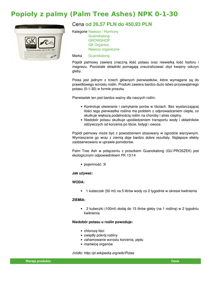 Popioły z palmy (Palm Tree Ashes) NPK 0-1-30 Cena od 26,57 PLN do 450,93 PLN Kategorie Nawozy / Hormony Guanokalong GROWSHOP GK Organics Nawozy organiczne Marka Guanokalong Popiół palmowy zawiera znaczną ilość potasu oraz niewielką ilość fosforu i magnezu. Pozostałe składniki pomagają zneutralizować zbyt kwaśny odczyn gleby. Potas jest jednym z trzech głównych pierwiastków, które wymagane są do prawidłowego wzrostu roślin. Produkt zawiera bardzo dużo łatwo przyswajalnego potasu (0-1-30) w formie proszku Pierwiastek ten jest bardzo ważny dla naszych roślin: Kontroluje otwieranie i zamykanie porów w liściach. Bez wystarczającej ilości tego pierwiastka roślina ma problem z odprowadzaniem ciepła, co skutkuje większą podatnością roślin na choroby i stres cieplny. Niedobór potasu skutkuje upośledzeniem transportu wody i składników odżywczych od korzenia po liście, łodygi i owoce. Popiół palmowy może być z powodzeniem stosowany w ogrodzie warzywnym. Wymieszanie go wraz z ziemią daje bardzo dobre rezultaty. Najlepsze efekty zaobserwowano w uprawie pomidorów. Palm Tree Ash w połączeniu z proszkiem Guanokalong (GU-PROSZEK) jest ekologicznym odpowiednikiem PK 13/14 pojemność: 3l Jak używać: WODA: 1 kubeczek (50 ml) na 5 litrów wody co 2 tygodnie w okresie kwitnienia ZIEMIA: 2 kubeczki (100ml) dodaj do 15 litrów gleby (na 1 roślinę) w 2 tygodniu kwitnienia Niedobór potasu u roślin powoduje: chlorozę liści zwiędły pokrój rośliny zahamowanie wzrostu korzenia, pędu martwicę organów źródło: http://pl.wikipedia.org/wiki/Potas Wersja produktu Cena Powered by TCPDF (www.tcpdf.org) Palm Tree Ashes (Popiół z palmy) 0,5L 28,70 PLN 26,57 PLN netto Palm Tree Ashes (Popiół z palmy) 1L 43,90 PLN 40,65 PLN netto Palm Tree Ashes (Popiół z palmy) 3L 81,90 PLN 75,83 PLN netto Palm Tree Ashes (Popiół z palmy) 5L 139,50 PLN 129,17 PLN netto Palm Tree Ashes (Popiół z palmy) 25L 487,00 PLN 450,93 PLN netto