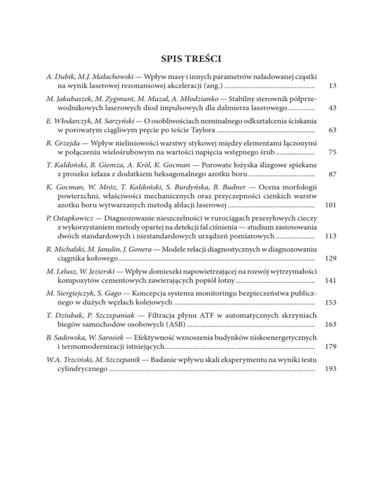 Spis treści A. Dubik, M.J. Małachowski — Wpływ masy i innych parametrów naładowanej cząstki na wynik laserowej rezonansowej akceleracji (ang.).................................................. 13 M. Jakubaszek, M. Zygmunt, M. Muzal, A. Młodzianko — Stabilny sterownik półprzewodnikowych laserowych diod impulsowych dla dalmierza laserowego................ 43 E. Włodarczyk, M. Sarzyński — O osobliwościach nominalnego odkształcenia ściskania w porowatym ciągliwym pręcie po teście Taylora...................................................... 63 R. Grzejda — Wpływ nieliniowości warstwy stykowej między elementami łączonymi w połączeniu wielośrubowym na wartości napięcia wstępnego śrub...................... 75 T. Kałdoński, B. Giemza, A. Król, K. Gocman — Porowate łożyska ślizgowe spiekane z proszku żelaza z dodatkiem heksagonalnego azotku boru..................................... 87 K. Gocman, W. Mróz, T. Kałdoński, S. Burdyńska, B. Budner — Ocena morfologii powierzchni, właściwości mechanicznych oraz przyczepności cienkich warstw azotku boru wytwarzanych metodą ablacji laserowej................................................ 101 P. Ostapkowicz — Diagnozowanie nieszczelności w rurociągach przesyłowych cieczy z wykorzystaniem metody opartej na detekcji fal ciśnienia — studium zastosowania dwóch standardowych i niestandardowych urządzeń pomiarowych...................... 113 R. Michalski, M. Janulin, J. Gonera — Modele relacji diagnostycznych w diagnozowaniu ciągnika kołowego........................................................................................................... 129 M. Lelusz, W. Jezierski — Wpływ domieszki napowietrzającej na rozwój wytrzymałości kompozytów cementowych zawierających popiół lotny............................................ 141 M. Siergiejczyk, S. Gago — Koncepcja systemu monitoringu bezpieczeństwa publicznego w dużych węzłach kolejowych............................................................................. 153 T. Dziubak, P. Szczepaniak — Filtracja płynu ATF w automatycznych skrzyniach biegów samochodów osobowych (ASB)...................................................................... 163 B. Sadowska, W. Sarosiek — Efektywność wznoszenia budynków niskoenergetycznych i termomodernizacji istniejących.................................................................................. 179 W.A. Trzciński, M. Szczepanik — Badanie wpływu skali eksperymentu na wyniki testu cylindrycznego................................................................................................................ 193