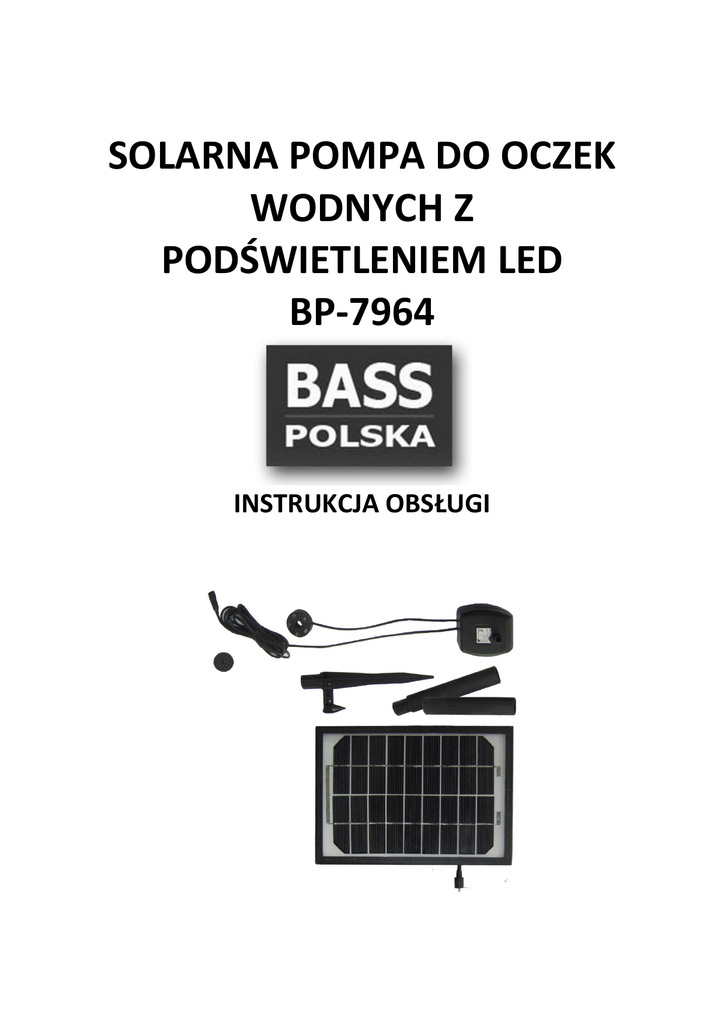 SOLARNA POMPA DO OCZEK WODNYCH Z PODŚWIETLENIEM LED BP-7964 INSTRUKCJA OBSŁUGI DANE TECHNICZNE Spis treści I. II. III. I. DANE TECHNICZNE .................................................................................................. 2 MONTAŻ .................................................................................................................. 2 WAŻNE INFORMACJE .............................................................................................. 3 DANE TECHNICZNE Moc baterii słonecznej Wymiary baterii słonecznej Tym baterii Moc pompy Maksymalna wysokość podnoszenia słupa wody 9V, 5W 170mm x 250mm NI-MH 6V/1200MA DC 3,5-12V, 0,5-5W 80-100cm II. MONTAŻ 1. Przed użyciem należy przymocować pompę do panelu słonecznego. Pod dyszę lub wąż do wyjścia pompy. Należy upewnić się, że woda zakrywa pompę ale nie zalewa dyszy. Należy podłączyć układ zasilający pompy do wyczki na panelu słonecznym i dokręcić śrubę. Umieścić panel słoneczny, aby był w słonecznym miejscu i skierować go optymalnie w stronę słońca, aby zwiększyć wydajność pracy. Gdy bateria słoneczna naładuje się podczas pracy na słońcu automatycznie zasili pompę bez pomocy panelu słonecznego. W razie potrzeba w przypadki małego nasłonecznienia pompa może działać na baterii. Należy przełącznik z tylu panelu. Jeśli bateria jest naładowana, pompa zacznie automatycznie działać. Jeśli przełącznik jest wyłączony, pompa będzie zasilana jedynie poprzez panel słoneczny. 2. 3. 4. 5. 2 WAŻNE INFORMACJE Schemat montażu III. WAŻNE INFORMACJE 1. Jeśli nie ma wody w zbiorniku, należy odłączyć pompę od paneli i baterii. Praca pompy na sucho spowoduje jej uszkodzenie oraz skróci jej żywotność. Gdy pompa nie jest używana i przed jej transportem, należy odłączyć ją od baterii. Należy myć pompę regularnie po dłuższym użyciu. 2. 3. 3