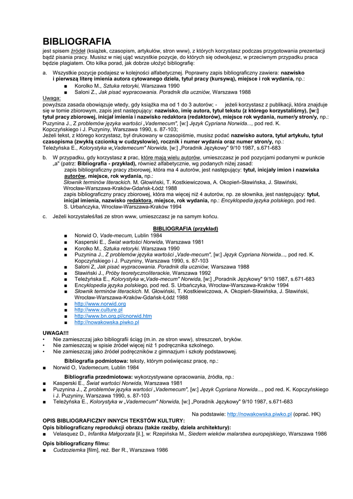 BIBLIOGRAFIA jest spisem źródeł (książek, czasopism, artykułów, stron www), z których korzystasz podczas przygotowania prezentacji bądź pisania pracy. Musisz w niej ująć wszystkie pozycje, do których się odwołujesz, w przeciwnym przypadku praca będzie plagiatem. Oto kilka porad, jak dobrze ułożyć bibliografię: Wszystkie pozycje podajesz w kolejności alfabetycznej. Poprawny zapis bibliograficzny zawiera: nazwisko i pierwszą literę imienia autora cytowanego dzieła, tytuł pracy (kursywą), miejsce i rok wydania, np.: ■ Korolko M., Sztuka retoryki, Warszawa 1990 ■ Saloni Z., Jak pisać wypracowania. Poradnik dla uczniów, Warszawa 1988 Uwaga: powyższa zasada obowiązuje wtedy, gdy książka ma od 1 do 3 autorów; jeżeli korzystasz z publikacji, która znajduje się w tomie zbiorowym, zapis jest następujący: nazwisko, imię autora, tytuł tekstu (z którego korzystaliśmy), [w:] tytuł pracy zbiorowej, inicjał imienia i nazwisko redaktora (redaktorów), miejsce rok wydania, numer/y stron/y, np.: Puzynina J., Z problemów języka wartości „Vademecum", [w:] Język Cypriana Norwida..., pod red. K. Kopczyńskiego i J. Puzyniny, Warszawa 1990, s. 87-103; Jeżeli tekst, z którego korzystasz, był drukowany w czasopiśmie, musisz podać nazwisko autora, tytuł artykułu, tytuł czasopisma (zwykłą czcionką w cudzysłowie), rocznik i numer wydania oraz numer stron/y, np.: Teleżyńska E., Kolorystyka w„Vademecum" Norwida, [w:] „Poradnik Językowy" 9/10 1987, s.671-683 a. b. W przypadku, gdy korzystasz z prac, które mają wielu autorów, umieszczasz je pod pozycjami podanymi w punkcie „a" (patrz: Bibliografia - przykład), również alfabetycznie, wg podanych niżej zasad: zapis bibliograficzny pracy zbiorowej, która ma 4 autorów, jest następujący: tytuł, inicjały imion i nazwiska autorów, miejsce, rok wydania, np.: Słownik terminów literackich. M. Głowiński, T. Kostkiewiczowa, A. Okopień-Sławińska, J. Sławiński, Wrocław-Warszawa-Kraków-Gdańsk-Łódź 1988 zapis bibliograficzny pracy zbiorowej, która ma więcej niż 4 autorów, np. ze słownika, jest następujący: tytuł, inicjał imienia, nazwisko redaktora, miejsce, rok wydania, np.: Encyklopedia języka polskiego, pod red. S. Urbańczyka, Wrocław-Warszawa-Kraków 1994 c. Jeżeli korzystałeś/łaś ze stron www, umieszczasz je na samym końcu. ■ ■ ■ ■ ■ ■ ■ ■ ■ ■ ■ ■ ■ BIBLIOGRAFIA (przykład) Norwid O, Vade-mecum, Lublin 1984 Kasperski E., Świat wartości Norwida, Warszawa 1981 Korolko M., Sztuka retoryki. Warszawa 1990 Puzynina J., Z problemów języka wartości „Vade-mecum", [w:] Język Cypriana Norwida..., pod red. K. Kopczyńskiego i J. Puzyniny, Warszawa 1990, s. 87-103 Saloni Z, Jak pisać wypracowania. Poradnik dla uczniów, Warszawa 1988 Sławiński J., Próby teoretycznoliterackie, Warszawa 1992 Teleżyńska E., Kolorystyka w„Vade-mecum" Norwida, [w:] „Poradnik Językowy" 9/10 1987, s.671-683 Encyklopedia języka polskiego, pod red. S. Urbańczyka, Wrocław-Warszawa-Kraków 1994 Słownik terminów literackich. M. Głowiński, T. Kostkiewiczowa, A. Okopień-Sławińska, J. Sławiński, Wrocław-Warszawa-Kraków-Gdańsk-Łódź 1988 http://www.norwid.org http://www.culture.pl http://www.bn.org.pl/cnorwid.htm http://nowakowska.piwko.pl UWAGA!!! • Nie zamieszczaj jako bibliografii ściąg (m.in. ze stron www), streszczeń, bryków. • Nie zamieszczaj w spisie źródeł więcej niż 1 podręcznika szkolnego. • Nie zamieszczaj jako źródeł podręczników z gimnazjum i szkoły podstawowej. ■ ■ ■ ■ Bibliografia podmiotowa: teksty, którym poświęcasz pracę, np.: Norwid O, Vademecum, Lublin 1984 Bibliografia przedmiotowa: wykorzystywane opracowania, źródła, np.: Kasperski E., Świat wartości Norwida, Warszawa 1981 Puzynina J., Z problemów języka wartości „Vademecum", [w:] Język Cypriana Norwida..., pod red. K. Kopczyńskiego i J. Puzyniny, Warszawa 1990, s. 87-103 Teleżyńska E., Kolorystyka w „Vademecum" Norwida, [w:] „Poradnik Językowy" 9/10 1987, s.671-683 Na podstawie: http://nowakowska.piwko.pl (oprać. HK) OPIS BIBLIOGRAFICZNY INNYCH TEKSTÓW KULTURY: Opis bibliograficzny reprodukcji obrazu (także rzeźby, dzieła architektury): ■ Velasquez D., Infantka Małgorzata [il.], w: Rzepińska M., Siedem wieków malarstwa europejskiego, Warszawa 1986 Opis bibliograficzny filmu: ■ Cudzoziemka [film], reż. Ber R., Warszawa 1986