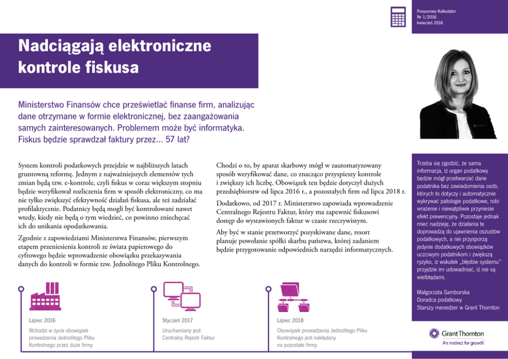 Purpurowy Kalkulator Nr 1/2016 kwiecień 2016 Nadciągają elektroniczne kontrole fiskusa Ministerstwo Finansów chce prześwietlać finanse firm, analizując dane otrzymane w formie elektronicznej, bez zaangażowania samych zainteresowanych. Problemem może być informatyka. Fiskus będzie sprawdzał faktury przez… 57 lat? System kontroli podatkowych przejdzie w najbliższych latach gruntowną reformę. Jednym z najważniejszych elementów tych zmian będą tzw. e-kontrole, czyli fiskus w coraz większym stopniu będzie weryfikował rozliczenia firm w sposób elektroniczny, co ma nie tylko zwiększyć efektywność działań fiskusa, ale też zadziałać profilaktycznie. Podatnicy będą mogli być kontrolowani nawet wtedy, kiedy nie będą o tym wiedzieć, co powinno zniechęcać ich do unikania opodatkowania. Zgodnie z zapowiedziami Ministerstwa Finansów, pierwszym etapem przeniesienia kontroli ze świata papierowego do cyfrowego będzie wprowadzenie obowiązku przekazywania danych do kontroli w formie tzw. Jednolitego Pliku Kontrolnego. Chodzi o to, by aparat skarbowy mógł w zautomatyzowany sposób weryfikować dane, co znacząco przyspieszy kontrole i zwiększy ich liczbę. Obowiązek ten będzie dotyczył dużych przedsiębiorstw od lipca 2016 r., a pozostałych firm od lipca 2018 r. Dodatkowo, od 2017 r. Ministerstwo zapowiada wprowadzenie Centralnego Rejestru Faktur, który ma zapewnić fiskusowi dostęp do wystawionych faktur w czasie rzeczywistym. Aby być w stanie przetworzyć pozyskiwane dane, resort planuje powołanie spółki skarbu państwa, której zadaniem będzie przygotowanie odpowiednich narzędzi informatycznych. Trzeba się zgodzić, że sama informacja, iż organ podatkowy będzie mógł przetwarzać dane podatnika bez zawiadomienia osób, których to dotyczy i automatycznie wykrywać patologie podatkowe, robi wrażenie i niewątpliwie przyniesie efekt prewencyjny. Pozostaje jednak mieć nadzieję, że działania te doprowadzą do ujawnienia oszustów podatkowych, a nie przysporzą jedynie dodatkowych obowiązków uczciwym podatnikom i zwiększą ryzyko, iż wskutek „błędów systemu” przyjdzie im udowadniać, iż nie są wielbłądami. Małgorzata Samborska Doradca podatkowy Starszy menedżer w Grant Thornton Lipiec 2016 Styczeń 2017 Lipiec 2018 Wchodzi w życie obowiązek prowadzenia Jednolitego Pliku Kontrolnego przez duże firmy Uruchamiany jest Centralny Rejestr Faktur Obowiązek prowadzenia Jednolitego Pliku Kontrolnego jest nakładany na pozostałe firmy Purpurowy Kalkulator Nr 1/2016 kwiecień 2016 Nadciągają elektroniczne kontrole fiskusa Gdyby fiskus, zgodnie z zapowiedziami, miał prześwietlać wszystkie faktury, potrzebowałby 57 lat, żeby kompleksowo zweryfikować faktury z jednego roku Wiceminister finansów Wiesław Jasiński z zadowoleniem informował niedawno, iż system IT będzie na tyle sprawny, że „wystarczą tylko trzy minuty, aby fiskus mógł sprawdzić 1000 faktur”. Czy to jednak dużo, aby stanowić efektywne narzędzie w rękach organów podatkowych? Czy też może Ministerstwo może liczyć jedynie na pozytywny efekt prewencyjny? Z danych przywoływanych przez wiceministra finansów Leszka Skibę w Sejmie wynika, że w Portugalii (w której JPK funkcjonuje od 2012 r., a centralny rejestr faktur od 2013 r.) sama informacja, że zostanie wprowadzony system informatyczny do walki z wyłudzeniami w VAT, spowodowała, że luka w VAT w ciągu roku została ograniczona o 30 proc. Warto jednak mieć świadomość, iż w Portugalii (z populacją 10,5 mln mieszkańców) do centralnego rejestru faktur trafia rocznie 4,2 mld faktur (360 mln miesięcznie)1. Należałoby więc przyjąć, iż w Polsce faktur wystawianych przez przedsiębiorców nie powinno być mniej niż 10 mld. 1 Na podstawie danych prezentowanych na Second Global Forum on VAT w Tokio, w kwietniu 2014 r. http://www.oecd.org/ctp/consumption/presentation-session5-filipe-abreu-portugal-second-global-forum-on-vat.pdf, s. 7. Policzmy. Jeśli potrzeba 3 minut na sprawdzenie 1000 faktur, to do sprawdzenia 10 miliardów potrzeba 500 tys. godzin, a więc 20 833 dni, czyli ponad 57 lat. A to wszystko przy założeniu, iż narzędzie informatyczne będzie sprawne przez 24 godziny, 7 dni w tygodniu. Oznacza to, że nawet przy pełnym wykorzystaniu nowego systemu, kontrole nadal będą wyrywkowe, tzn. będą prowadzone na około 2 proc. faktur, które będą trafiać do rejestru. 3 minuty x 1000 faktur x 10 mld faktur rocznie 500 tys. godzin 20,8 tys. dni 57 lat E-kontrole wydają się na pierwszy rzut oka skutecznym narzędziem w rękach fiskusa. Jednak diabeł tkwi w szczegółach. Przy planowanych założeniach informatycznych, system będzie mało wydajny. Poza tym trzeba pamiętać o kosztach związanych z implementacją systemu, kwestiach związanych z ochroną danych stanowiących tajemnicę handlową, pokusie korupcyjnej osób mających dostęp do tych wrażliwych danych czy ryzykiem błędów systemowych, które mogą sparaliżować działalność przedsiębiorców. Małgorzata Samborska Doradca podatkowy Starszy menedżer w Grant Thornton Purpurowy Kalkulator Nr 1/2016 kwiecień 2016 Kontakt Chcesz być zawsze na bieżąco? Zapisz się na newsletter Grant Thornton! Informujemy o najnowszych zmianach w prawie oraz podpowiadamy, jak się do nich przygotować. Zapisz się! >> Dariusz Gałązka Małgorzata Samborska Partner, Biegły rewident Doradztwo podatkowe T: +48 61 625 1317 M: +48 605 828 912 E: [email protected] Dyrektor Biura w Warszawie Doradca Podatkowy T: +48 22 205 4930 M: +48 661 538 580 E: [email protected] Kontakt dla mediów: Jacek Kowalczyk T 22 205 48 41 M 505 024 168 E [email protected]