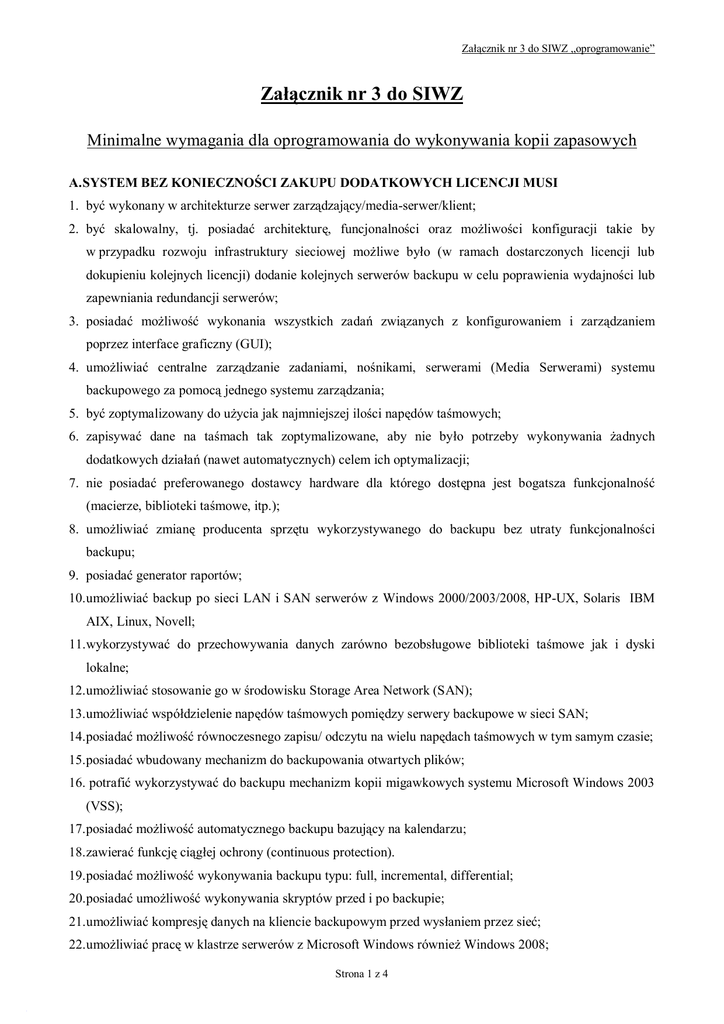 Załącznik nr 3 do SIWZ „oprogramowanie” Załącznik nr 3 do SIWZ Minimalne wymagania dla oprogramowania do wykonywania kopii zapasowych A. SYSTEM BEZ KONIECZNOŚCI ZAKUPU DODATKOWYCH LICENCJI MUSI 1. być wykonany w architekturze serwer zarządzający/media-serwer/klient; 2. być skalowalny, tj. posiadać architekturę, funcjonalności oraz możliwości konfiguracji takie by w przypadku rozwoju infrastruktury sieciowej możliwe było (w ramach dostarczonych licencji lub dokupieniu kolejnych licencji) dodanie kolejnych serwerów backupu w celu poprawienia wydajności lub zapewniania redundancji serwerów; 3. posiadać możliwość wykonania wszystkich zadań związanych z konfigurowaniem i zarządzaniem poprzez interface graficzny (GUI); 4. umożliwiać centralne zarządzanie zadaniami, nośnikami, serwerami (Media Serwerami) systemu backupowego za pomocą jednego systemu zarządzania; 5. być zoptymalizowany do użycia jak najmniejszej ilości napędów taśmowych; 6. zapisywać dane na taśmach tak zoptymalizowane, aby nie było potrzeby wykonywania żadnych dodatkowych działań (nawet automatycznych) celem ich optymalizacji; 7. nie posiadać preferowanego dostawcy hardware dla którego dostępna jest bogatsza funkcjonalność (macierze, biblioteki taśmowe, itp.); 8. umożliwiać zmianę producenta sprzętu wykorzystywanego do backupu bez utraty funkcjonalności backupu; 9. posiadać generator raportów; 10. umożliwiać backup po sieci LAN i SAN serwerów z Windows 2000/2003/2008, HP-UX, Solaris IBM AIX, Linux, Novell; 11. wykorzystywać do przechowywania danych zarówno bezobsługowe biblioteki taśmowe jak i dyski lokalne; 12. umożliwiać stosowanie go w środowisku Storage Area Network (SAN); 13. umożliwiać współdzielenie napędów taśmowych pomiędzy serwery backupowe w sieci SAN; 14. posiadać możliwość równoczesnego zapisu/ odczytu na wielu napędach taśmowych w tym samym czasie; 15. posiadać wbudowany mechanizm do backupowania otwartych plików; 16. potrafić wykorzystywać do backupu mechanizm kopii migawkowych systemu Microsoft Windows 2003 (VSS); 17. posiadać możliwość automatycznego backupu bazujący na kalendarzu; 18. zawierać funkcję ciągłej ochrony (continuous protection). 19. posiadać możliwość wykonywania backupu typu: full, incremental, differential; 20. posiadać umożliwość wykonywania skryptów przed i po backupie; 21. umożliwiać kompresję danych na kliencie backupowym przed wysłaniem przez sieć; 22. umożliwiać pracę w klastrze serwerów z Microsoft Windows również Windows 2008; Strona 1 z 4 Załącznik nr 3 do SIWZ „oprogramowanie” 23. posiadać możliwość wykonywania backupów na urządzenia dyskowe, które następnie będą automatycznie powielane na nośniki taśmowe (D2D2T). System backupowy powinien, tak długo jak dane obecne są na dyskach, wykorzystywać je w procesach restore; 24. oferować funkcjonalność pozwalającą zminimalizować ilość koniecznych do wykonywania powtarzalnych pełnych kopii danych systemów plików, w tym umożliwiać wykonanie backupu syntetycznego (tzn. możliwośc utworzenia backupu pełnego nie tylko z danych znajdujących się bezpośrednio na serwerach, lecz również na podstawie danych znajdujących się we wcześniejszym pełnym backup’ie i backup’ach przyrostowych); 25. umożliwiać serwerom backupowym zapisywanie danych na te same napędy taśmowe poprzez sieć SAN, zastosowanie urządzeń z NDMP musi umożliwiać backup na te same napędy taśmowe 26. posiadać możliwość monitowania i alertowania poprzez email i SNMP; 27. posiadać możliwość zintegrowania się z technologią VCB (Vmware Consolidate Backup) celem wydajnego backupu danych z możliwością odtwarzania pojedynczych plików (zawartych w VMDK dla systemów Windows), backup musi być wykonywany jednoprzebiegowo (cały plik VMDK backupowany raz); 28. wspierać najnowsze wersje środowisk Vmware vSphere 4.0 i wspierać backup za pomocą mechanizmu vstorage API dając te same możliwości jak z wykorzystaniem mechanizmu VCB opisane w punkcie 26. 29. wspierać najnowsze wersje aplikacji i serwerów takich jak: Windows 2008 R2, Exchange 2010, Domino 8.5, Windows 7; 30. posiadać zdolność do deduplikacji danych, która a) musi opierać się na blokowej deduplikacji danych wykonywanej online a więc w trakcie wykonywania zadania backupowego. b) umożliwia przeprowadzenie procesu deduplikacji danych zarówno na kliencie (serwerze z danymi czy aplikacją) jak również na media serwerze. c) musi być konfigurowana i zarządzana, włącznie z przełączaniem miejsca deduplikacji, za pomocą jednej konsoli zarządzającej systemem backupowym; d) nie wymaga konieczności doinstalowania dodatkowego oprogramowania po stronie klienta backupu czy media serwera (serwera systemu backupowego); 31. posiadać otwarte API umożliwiające podłączanie urządzeń deduplikacyjnych innych firm; 32. umożliwiać backup dowolnej ilości maszyn wirtualnych znajdujących się na dwóch 2-procesorowych 6rdzeniowych serwerach fizycznych; 33. umożliwiać wykonywanie backupu przynajmniej jednej maszyny wirtualnej z działającym systemem Windows Serwer 2003 lub nowszym za pomocą dziającego w tym systemie agenta backup’u pochodzącego od producenta oferowanego oprogramowania do backupu; 34. zezwalać na przenoszenie licencji na oprogramowanie pomiędzy serwerami fizycznymi różnych producentów z zachowaniem wsparcia technicznego; 35. nie zawierać ograniczenia ani na okres ważności licencji ani na okres używania oprogramowania; Strona 2 z 4 Załącznik nr 3 do SIWZ „oprogramowanie” 36. zawierać przynajmniej 2-letni okres wsparcia technicznego świadczonego przez producenta oprogramowania wirtualizacyjnego telefonicznie i poprzez pocztę elektroniczną przez 5 dni w tygodniu 8 godzin na dobę i obejmujące dostęp do bezpłatnych aktualizacji (upgrade’y i update’y) oprogramowania. B. WYMAGANIA DODATKOWE 1. oferowa