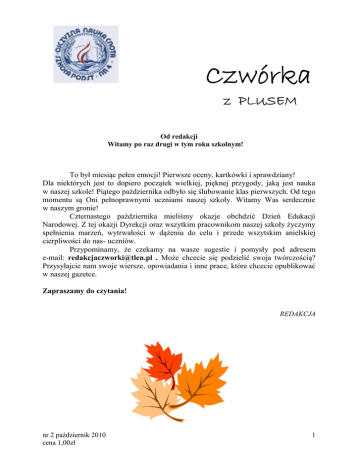 Czwórka z PLUSEM Od redakcji Witamy po raz drugi w tym roku szkolnym! To był miesiąc pełen emocji! Pierwsze oceny, kartkówki i sprawdziany! Dla niektórych jest to dopiero początek wielkiej, pięknej przygody, jaką jest nauka w naszej szkole! Piątego października odbyło się ślubowanie klas pierwszych. Od tego momentu są Oni pełnoprawnymi uczniami naszej szkoły. Witamy Was serdecznie w naszym gronie! Czternastego października mieliśmy okazje obchdzić Dzień Edukacji Narodowej. Z tej okazji Dyrekcji oraz wszytkim pracownikom naszej szkoły życzymy spełnienia marzeń, wytrwałości w dążeniu do celu i przede wszytskim anielskiej cierpliwości do nas- uczniów. Przypominamy, że czekamy na wasze sugestie i pomysły pod adresem e-mail: [email protected] . Może chcecie się podzielić swoja twórczością? Przysyłajcie nam swoje wiersze, opowiadania i inne prace, które chcecie opublikować w naszej gazetce. Zapraszamy do czytania! REDAKCJA nr 2 październik 2010 cena 1,00zł 1 Dzień Edukacji Narodowej 14 października obchodziliśmy Dzień Edukacji Narodowej, znany jako Dzień Nauczyciela. Z tej okazji chcieliśmy wszystkim pracownikom naszej szkoły złożyć najserdeczniejsze życzenia! Życzymy cierpliwości do nas, uśmiechu na co dzień i jeszcze więcej zapału do pracy! Święto to, jest bardzo popularne wśród uczniów (głównie z powodu dnia wolnego od zajęć ), jednak mało kto zna jego historię. Czy wiecie, że: Dzień Edukacji Narodowej został ustanowiony w 1972 roku Upamiętnia rocznicę powstania Komisji Edukacji Narodowej, utworzonej z inicjatywy króla Stanisława Augusta Poniatowskiego Inne kraje też obchodzą takie święto, np. Albania (7 marca), Brazylia (15 października), Tajwan (28 września), Meksyk (15 maja) 5 października obchodzony jest Światowy Dzień Nauczyciela (ang.World Teacher’s Day). W Polsce obchodzony jest w szkolnictwie wyższym. nr 2 październik 2010 cena 1,00zł 2 Co w trawie piszczy ? 1 listopada dzień Wszystkich Świętych – uroczystość obchodzona ku czci wszystkich świętych – tych znanych i nie znanych. Zmiana czasu już niedługo! 30 października zmieniamy czas na zimowy – czas zmieniany jest w około 70-ciu krajach świata! Jedynym wysoko uprzemysłowionym krajem który nie wprowadza tej zmiany jest Japonia. Halloween Zbliża się Halloween – zwyczaj popularny w kulturze amerykańskiej, odnoszący się do Święta Zmarłych. Halloween obchodzi się w nocy z 31 października na 1 listopada. Narodowe Święto Niepodległości 11 listopada obchodzimy Przemek Redesiuk nr 2 październik 2010 cena 1,00zł 3 Alfabet Życia pani Anny Dyńka – nauczyciela kształcenia zintegrowanego A jak ABeCaDło z pieca spadło.... B jak Balon C jak Cukiereczki, Ciasteczka D jak Dynia duża, pomarańczowa E jak Ekologia F jak Flaga, nasza biało- czerwona G jak Globus H jak Hiszpania i piękne plaże I jak Igloo ciekawe czy jest w nim zimno? :P J jak Jedynka - uczeń bez niej jest jak żołnierz bez karabinu :P ale pamiętajmy, co za dużo to niezdrowo K jak Kreda najlepiej Kolorowa L jak Leniuchowanie, szczególnie w sobotę :) M jak Mama - ona ma zawsze rację! N jak Nowy Rok już niedługo 2011 O jak Osa - Lata osa koło nosa P jak Pomidorówka najlepsza zupa na świecie :) R jak Radość, S jak Samolot i lot nad chmurami T jak Tablica U jak Uśmiech W jak Wakacje, Wycieczki,Wyjazdy, Wyprawy.... X jak rzymska dziesiątka Y jak Yeti podobno gdzieś biega i straszy... Z jak Zebra, która biega po sawannie w Afryce p. Anna Dyńka nr 2 październik 2010 cena 1,00zł 4 Dla moli książkowych „Dzieci z Bullerbyn” Książka, którą dzisiaj opiszę jest skierowana zarówno do młodszych jak i do starszych czytelników. Została ona napisana przez Astrid Lindgren 63 lata temu. Akcja opowieści rozgrywa się w Szwecji, w małej osadzie Bullerbyn, na terenie trzech gospodrastw. Główną bohaterką jest Liza, siedmioletnia dziewczynka, i jej piątka przyjaciół. Każdego z nich spotykają nizwykłe historie. Łowią w rzece raki, karmią jagniątko z butelki, uciekają przed złym baranem, śpią w sianie i przesyłają sobie listy za pomocą sznurka zawieszonego między dwoma oknami. Kto by tak nie chciał?! W tej książce można znaleźć naprawdę wszystko! Ducha walki dawnych Indian, bohaterskie czyny, podpowiedzi jak zbudować szałas oraz przepis na szybkie i bezbolesne wyrwanie zęba! Jak to mówią: „Dla każdego coś dobrego”. Młodsi czytelnicy, dzięki tej książce, odnajdą w sobie żądze przygód, a dorośli z chęcią powrócą w myślalach do lat beztroskich zabaw i wielkich problemów małych dzieci. Przenosząc się w wyobraźni do dawnej Szwecji można na nowo odkryć, radość i piękno dzieciństwa oraz nauczyć się cieszyć z drobnostek. Każdy kto lubi się bawić i śmiać powienien przeczytać tą książkę! p. Justyna Zawadzka nr 2 październik 2010 cena 1,00zł 5 Ze świata nauki ! ? Po prostu szok…! 1. Do tej pory znanych jest 280 obcych systemów planetarnych! 2. W naszym układzie planetarnych jest 8 planet, ale w samej Drodze Mlecznej mogą ich być setki miliardów. 3. Amerykańscy naukowcy stworzyli opakowanie do pakowania jedzenia które jest… jadalne. 4. W nocy z 12 na 13 października nad centralną Polską pojawił się jasny i wolny bolid - meteor o dużej jasności. 5. Paski u zebry są jak odciski palców u ludzi – nie ma dwóch identycznych układów. 6. Uważana za wymarłą od 160 lat mucha Thyreophora cynophila żyje i ma się dobrze Rekordy Guinnessa: 1. Najdłuższy kot na świecie ma aż 1,23 metra długości! 2. W tym roku powstała największa tabliczka czekolady.5,6 metra długości, 2,75 metra szerokości oraz 25 centymetrów grubości. 3. Cztery tony mąki, 1500 litrów sosu pomidorowego, 1600 kg mozzarelli – te składniki zostały wykorzystane w czasie przygotowywania najdłuższej pizzy świata – miała aż 1100 metrów długości. 4. Największy król