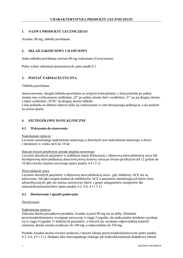 CHARAKTERYSTYKA PRODUKTU LECZNICZEGO 1. NAZWA PRODUKTU LECZNICZEGO Axudan, 80 mg, tabletki powlekane 2. SKŁAD JAKOŚCIOWY I ILOŚCIOWY Jedna tabletka powlekana zawiera 80 mg walsartanu (Valsartanum). Pełny wykaz substancji pomocniczych, patrz punkt 6.1. 3. POSTAĆ FARMACEUTYCZNA Tabletka powlekana Jasnoczerwona, okrągła tabletka powlekana ze ściętymi krawędziami, z linią podziału po jednej stronie oraz wytłoczonym symbolem „D” po jednej stronie linii i symbolem „V” po jej drugiej stronie, a także symbolem „NVR” na drugiej stronie tabletki. Linia podziału na tabletce ułatwia tylko jej rozkruszenie w celu łatwiejszego połknięcia, a nie podział na równe dawki. 4. 4.1 SZCZEGÓŁOWE DANE KLINICZNE Wskazania do stosowania Nadciśnienie tętnicze Leczenie samoistnego nadciśnienia tętniczego u dorosłych oraz nadciśnienia tętniczego u dzieci i młodzieży w wieku od 6 do 18 lat. Stan po świeżo przebytym zawale mięśnia sercowego Leczenie dorosłych pacjentów w stabilnym stanie klinicznym z objawową niewydolnością serca lub bezobjawową niewydolnością skurczową lewej komory serca po świeżo przebytym (od 12 godzin do 10 dni) zawale mięśnia sercowego (patrz punkty 4.4 i 5.1). Niewydolność serca Leczenie dorosłych pacjentów z objawową niewydolnością serca , gdy inhibitory ACE nie są tolerowane lub jako terapia dodana do inhibitorów ACE u pacjentów nietolerujących leków betaadrenolitycznych, gdy nie można zastosować leków z grupy antagonistów receptorów dla mineralokortykosteroidów (patrz punkty 4.2, 4.4, 4.5 i 5.1). 4.2 Dawkowanie i sposób podawania Dawkowanie Nadciśnienie tętnicze Zalecana dawka początkowa produktu Axudan wynosi 80 mg raz na dobę. Działanie przeciwnadciśnieniowe występuje zazwyczaj w ciągu 2 tygodni, ale maksymalne działanie uzyskuje się w ciągu 4 tygodni. U niektórych pacjentów, u których nie uzyskano odpowiedniej kontroli ciśnienia, dawkę można zwiększyć do 160 mg, a maksymalnie do 320 mg. Produkt Axudan można również podawać z innymi lekami przeciwnadciśnieniowymi (patrz punkty 4.3, 4.4, 4.5 i 5.1). Dodanie leku moczopędnego (takiego jak hydrochlorotiazyd) dodatkowo obniża 1 SE/H/0813/002/IB/018 ciśnienie tętnicze u tych pacjentów. Stan po świeżo przebytym zawale mięśnia sercowego U pacjentów w stabilnym stanie klinicznym leczenie można rozpocząć już po 12 godzinach od zawału mięśnia sercowego. Po zastosowaniu dawki początkowej 20 mg dwa razy na dobę dawkę walsartanu należy zwiększać przez kilka następnych tygodni do 40 mg, 80 mg i 160 mg, podawanych dwa razy na dobę. Wyjściową dawkę zapewniają podzielne tabletki o mocy 40 mg. Maksymalna docelowa dawka wynosi 160 mg dwa razy na dobę. Zwykle zaleca się uzyskanie dawki 80 mg dwa razy na dobę w ciągu dwóch tygodni od rozpoczęcia leczenia, a docelowej dawki maksymalnej (160 mg dwa razy na dobę) w ciągu trzech miesięcy, zależnie od tolerancji produktu leczniczego przez pacjenta. Jeśli wystąpi objawowe niedociśnienie tętnicze lub zaburzenia czynności nerek, należy rozważyć zmniejszenie dawki. Walsartan można stosować u pacjentów otrzymujących inne leki stosowane po przebytym zawale mięśnia sercowego, takie jak leki trombolityczne, kwas acetylosalicylowy, leki beta-adrenolityczne, statyny i leki moczopędne. Nie zaleca się jednoczesnego stosowania z inhibitorami ACE (patrz punkty 4.4 i 5.1). Ocena stanu pacjenta po przebytym zawale mięśnia sercowego powinna zawsze zawierać ocenę czynności nerek. Niewydolność serca Zalecana dawka początkowa produktu Axudan wynosi 40 mg dwa razy na dobę. Dawkę należy zwiększać w odstępach co najmniej dwóch tygodni do 80 mg i 160 mg podawanych dwa razy na dobę, aż do uzyskania największej dawki tolerowanej przez pacjenta. Należy rozważyć zmniejszenie dawki jednocześnie stosowanych leków moczopędnych. Maksymalna dawka dobowa stosowana w badaniach klinicznych wynosiła 320 mg walsartanu w dawkach podzielonych. Walsartan można podawać razem z innymi lekami stosowanymi w leczeniu niewydolności serca, lecz nie zaleca się jednoczesnego stosowania walsartanu z inhibitorem ACE i lekiem beta-adrenolitycznym lub lekiem moczopędnym oszczędzającym potas (patrz punkty 4.4 i 5.1). Ocena stanu pacjentów z niewydolnością serca powinna zawsze zawierać ocenę czynności nerek. Dodatkowe informacje dotyczące szczególnych grup pacjentów Osoby w podeszłym wieku Modyfikacja dawki dla pacjentów w podeszłym wieku nie jest konieczna. Pacjenci z zaburzeniami czynności nerek U dorosłych pacjentów z klirensem kreatyniny >10 ml/min dostosowanie dawki nie jest konieczne (patrz punkty 4.4 i 5.2). Przeciwwskazane jest jednoczesne stosowanie walsartanu i aliskirenu u pacjentów z zaburzeniami czynności nerek (GFR <60 ml/min/1,73 m2), patrz punkt 4.3. Cukrzyca Przeciwwskazane jest jednoczesne stosowanie walsartanu i aliskirenu u pacjentów z cukrzycą (patrz punkt 4.3). Pacjenci z zaburzeniami czynności wątroby Stosowanie produktu Axudan jest przeciwwskazane u pacjentów z ciężkimi zaburzeniami czynności wątroby, marskością żółciową i u pacjentów z zastojem żółci (patrz punkty 4.3, 4.4 i 5.2). U pacjentów z lekkimi do umiarkowanych zaburzeniami czynności wątroby bez zastoju żółci dawka walsartanu nie powinna być większa niż 80 mg. Dzieci i młodzież Nadciśnienie tętnicze u dzieci i młodzieży 2 SE/H/0813/002/IB/018 Dzieci i młodzież w wieku od 6 do 18 lat Dawka początkowa dla dzieci o masie ciała mniejszej niż 35 kg wynosi 40 mg raz na dobę, a o masie ciała 35 kg lub większej wynosi 80 mg raz na dobę. Dawkę produktu leczniczego należy dostosować w zależności od uzyskanego działania przeciwnadciśnieniowego. Maksymalne dawki produktu leczniczego oceniane w badaniach klinicznych podano w poniższej tabeli. W badaniach nie oceniano dawek większych od wymienionych, dlatego nie są one zalecane. Masa ciała ≥18