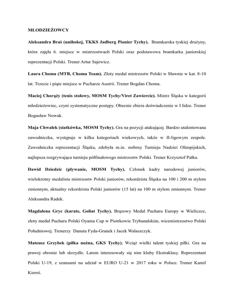 MŁODZIEŻOWCY Aleksandra Braś (unihokej, TKKS Jadberg Pionier Tychy). Bramkarska tyskiej drużyny, która zajęła 6. miejsce w mistrzostwach Polski oraz podstawowa bramkarka juniorskiej reprezentacji Polski. Trener Artur Sajewicz. Laura Choma (MTB, Choma Team). Złoty medal mistrzostw Polski w Sławnie w kat. 8-10 lat. Trzecie i piąte miejsce w Pucharze Austrii. Trener Bogdan Choma. Maciej Chorąży (tenis stołowy, MOSM Tychy/Viret Zawiercie). Mistrz Śląska w kategorii młodzieżowiec, czyni systematyczne postępy. Obecnie zbiera doświadczenie w I lidze. Trener Bogusław Nowak. Maja Chwałek (siatkówka, MOSM Tychy). Gra na pozycji atakującej. Bardzo utalentowana zawodniczka, występuje w kilku kategoriach wiekowych, także w II-ligowym zespole. Zawodniczka reprezentacji Śląska, zdobyła m.in. srebrny Turnieju Nadziei Olimpijskich, najlepsza rozgrywająca turnieju półfinałowego mistrzostw Polski. Trener Krzysztof Pałka. Dawid Dziedzic (pływanie, MOSM Tychy). Członek kadry narodowej juniorów, wielokrotny medalista mistrzostw Polski juniorów, rekordzista Śląska na 100 i 200 m stylem zmiennym, aktualny rekordzista Polski juniorów (15 lat) na 100 m stylem zmiennym. Trener Aleksandra Radek. Magdalena Gryc (karate, Goliat Tychy). Brązowy Medal Pucharu Europy w Wieliczce, złoty medal Pucharu Polski Oyama Cup w Piotrkowie Trybunalskim, wicemistrzostwo Polski Południowej. Trenerzy Danuta Fyda-Granek i Jacek Walaszczyk. Mateusz Grzybek (piłka nożna, GKS Tychy). Wciąż wielki talent tyskiej piłki. Gra na prawej obronie lub skrzydle. Latem interesowały się nim kluby Ekstraklasy. Reprezentant Polski U-19, z szansami na udział w EURO U-21 w 2017 roku w Polsce. Trener Kamil Kiereś. Dorota Hałatek (piłka nożna, KKS Polonia Tychy). Mimo, że ma dopiero 13 lat, już jest pełnoprawną reprezentantką Polski U-15. Zawodniczka kadry Śląska U-16. Najmłodsza strzelczyni bramki w historii Polonii. Mocny punkt środka pola seniorskiej drużyny. Trenerzy Jarosław Ziemba i Dawid Kołodziejczyk. Bartłomiej Jeziorski (hokej na lodzie, GKS Tychy). Zdobywca potrójnej korony mistrzostwa, Pucharu i Superpucharu Polski. Wywalczył awans do finału Pucharu Kontynentalnego. Jeden z największych talentów tyskiego hokeja ostatnich lat. Pełnoprawny zawodnik seniorskiego zespołu. Reprezentant Polski U-18 oraz U-20. Trenerzy Jirzi Sejba i Krzysztof Majkowski. Remigiusz Kapica (siatkówka, MOSM Tychy). Dwumetrowy leworęczny atakujący. Powołany do kardy na turniej Nadziei Olimpijskich. W tym roku, mimo swoich 15 lat zawodnik II ligowego TKS Tychy oraz juniorów MOSM Tychy. Trener Marcin Nycz. Dawid Kochanowski (futsal, GKS Tychy). Kapitan brązowych medalistów Młodzieżowych Mistrzostw Polski U-18. Podstawowy zawodnik pierwszego zespołu, który walczy o awans do Ekstraklasy. W kręgu zainteresowań kadry Polski U-19. Trenerzy Witold Zając i Samuel Jania. Patrycja Komudzińska (boks, MOSM Tychy). Mistrzyni Polski juniorów (kat. 48 kg). Reprezentantka Polski, uczestniczka mistrzostw Europy na Węgrzech. Trener Ryszard Dziopa. Emilia Kowalik (piłka ręczna, MOSM Tychy). Reprezentantka Polski juniorek młodszych. W międzynarodowym turnieju w Giżycku zdobyła po trzy bramki w meczach z Litwą i Hiszpanią – to były pierwsze gole tyskiej szczypiornistki dla kadry od niemal 30 lat! Trenerzy Jerzy Ciałoń, Krzysztof Willem i Stansław Loska. Jan Krzyżek (hokej na lodzie, MOSM Tychy). Brązowy medalista mistrzostw Polski żaków starszych. Lider drugiego ataku. Bardzo dobry technicznie zawodnik. Reprezentant Śląska. Trener Adam Worwa. Mateusz Litewczuk (pływanie, MOSM Tychy). Członek kadry narodowej juniorów, podwójny złoty medalista Mistrzostw Polski Szkół Sportowych, wielokrotny medalista Międzywojewódzkich Mistrzostw Młodzików i Mistrzostw Śląska w stylu zmiennym, klasycznym i motylkowym. Trener Aleksandra Radek. Sylwia Łaskawska (hokej na lodzie, Atomówki GKS Tychy). Środkowa I ataku tyskiej drużyny, reprezentantka Polski seniorek i U-18. Brała udział w MŚ w Wielkiej Brytanii oraz w Katowicach. Ogromny talent. Trener Dariusz Garbocz. Dominika Marczyk (hokej na lodzie, Atomówki GKS Tychy). Twarda obrończyni. Reprezentantka Polski U-18, grała w MŚ w Katowicach. Liderka formacji defensywnej seniorskiej drużyny Atomówek. Trener Dariusz Garbocz. Aleksandra Mentelska (zapasy, MOSM Tychy). Reprezentantka Polski juniorek młodszych, piąta zawodniczka Pucharu Polski juniorek młodszych (kat. 70 kg). Trener Marzena Horoszko. Anna Mielnik (kajakarstwo, MOSM Tychy). Srebrny medal mistrzostw Polski młodzików (K-1 na 2 km), dwukrotna zwyciężczyni Międzywojewódzkich Mistrzostw Młodzików. Spore sukcesy, bowiem startowała ze starszymi zawodniczkami. Trenerzy Sylwia i Marek Stanny. Piotr Namyślak (szachy, UKS SP 1 Jedynka Tychy). Zdobył złoty medal podczas mistrzostw Polski szkół w Dąbkach, srebrny medal Międzywojewódzkich Mistrzostw juniorów i wywalczył awans do przyszłorocznych finałów MP. Trener Janusz Górski. Wiktoria Nowak (piłka nożna, KKS Polonia Tychy). 13-latka, która zdobyła już 15 bramek w seniorskich rozgrywkach. Zawodniczka kadry Śląska U-16, w kręgu zainteresowań reprezentacji Polski U-15. Trenerzy Jarosław Ziemba i Dawid Kołodziejczyk. Wioletta Pawluszek (strzelectwo, Tyskie Towarzystwo Strzeleckie). Brązowy medal drużynowych mistrzostw Polski, wicemistrzyni Polski w pistolecie pneumatycznym. Zawodniczka kadry narodowej. Trener Krzysztof Rymski. Dominik Petera (hokej na lodzie, MOSM Tychy). Brązowy medalista mistrzostw Polski żaków starszych. Prawoskrzydłowy, waleczny i nieustępliwy i skuteczny zawodnik. Trener Adam Worwa. Karolina Pęczak (siatkówka, MOSM Tychy). Gra na pozycji libero. Złota medalistka Ogólnopolskiej Olimpiady Młodzieży, w której startowała w reprezentacji Śląska. Występuję w II-ligowej drużynie. Trener Krzysztof Pałka. Weronika Pławecka (boks, MOSM Tychy). Mistrzyni Polski k