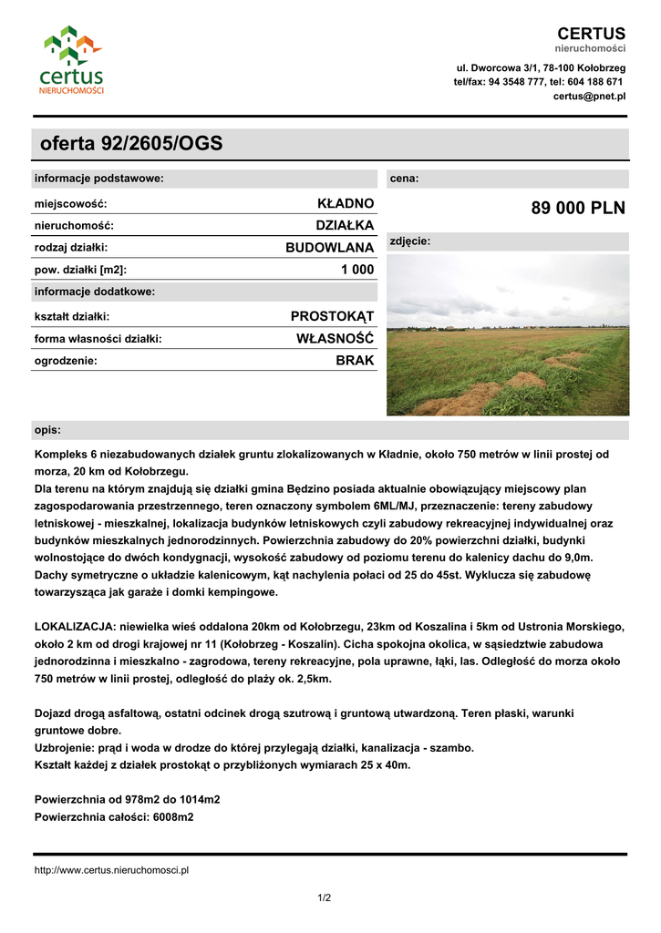CERTUS nieruchomości ul. Dworcowa 3/1, 78-100 Kołobrzeg tel/fax: 94 3548 777, tel: 604 188 671 [email protected] oferta 92/2605/OGS informacje podstawowe: cena: miejscowość: KŁADNO nieruchomość: DZIAŁKA rodzaj działki: BUDOWLANA 89 000 PLN zdjęcie: 1 000 pow. działki [m2]: informacje dodatkowe: kształt działki: forma własności działki: PROSTOKĄT WŁASNOŚĆ BRAK ogrodzenie: opis: Kompleks 6 niezabudowanych działek gruntu zlokalizowanych w Kładnie, około 750 metrów w linii prostej od morza, 20 km od Kołobrzegu. Dla terenu na którym znajdują się działki gmina Będzino posiada aktualnie obowiązujący miejscowy plan zagospodarowania przestrzennego, teren oznaczony symbolem 6ML/MJ, przeznaczenie: tereny zabudowy letniskowej - mieszkalnej, lokalizacja budynków letniskowych czyli zabudowy rekreacyjnej indywidualnej oraz budynków mieszkalnych jednorodzinnych. Powierzchnia zabudowy do 20% powierzchni działki, budynki wolnostojące do dwóch kondygnacji, wysokość zabudowy od poziomu terenu do kalenicy dachu do 9,0m. Dachy symetryczne o układzie kalenicowym, kąt nachylenia połaci od 25 do 45st. Wyklucza się zabudowę towarzysząca jak garaże i domki kempingowe. LOKALIZACJA: niewielka wieś oddalona 20km od Kołobrzegu, 23km od Koszalina i 5km od Ustronia Morskiego, około 2 km od drogi krajowej nr 11 (Kołobrzeg - Koszalin). Cicha spokojna okolica, w sąsiedztwie zabudowa jednorodzinna i mieszkalno - zagrodowa, tereny rekreacyjne, pola uprawne, łąki, las. Odległość do morza około 750 metrów w linii prostej, odległość do plaży ok. 2,5km. Dojazd drogą asfaltową, ostatni odcinek drogą szutrową i gruntową utwardzoną. Teren płaski, warunki gruntowe dobre. Uzbrojenie: prąd i woda w drodze do której przylegają działki, kanalizacja - szambo. Kształt każdej z działek prostokąt o przybliżonych wymiarach 25 x 40m. Powierzchnia od 978m2 do 1014m2 Powierzchnia całości: 6008m2 http://www.certus.nieruchomosci.pl 1/2 CERTUS nieruchomości ul. Dworcowa 3/1, 78-100 Kołobrzeg tel/fax: 94 3548 777, tel: 604 188 671 [email protected] CENA: 89.000 zł/szt Działka nr 6/30 powierzchnia: 1014m2 Działka nr 6/31 powierzchnia: 1011m2 Działka nr 6/32 powierzchnia: 1000m2 Działka nr 6/33 powierzchnia: 1006m2 Działka nr 6/34 powierzchnia: 978m2 Działka nr 6/35 powierzchnia: 999m2 W celu uzyskania pełnej informacji o ofercie prosimy o kontakt telefoniczny, bądź mailowy. http://www.certus.nieruchomosci.pl 2/2