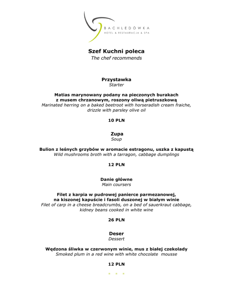 Szef Kuchni poleca The chef recommends Przystawka Starter Matias marynowany podany na pieczonych burakach z musem chrzanowym, roszony oliwą pietruszkową Marinated herring on a baked beetroot with horseradish cream fraiche, drizzle with parsley olive oil 10 PLN Zupa Soup Bulion z leśnych grzybów w aromacie estragonu, uszka z kapustą Wild mushrooms broth with a tarragon, cabbage dumplings 12 PLN Danie główne Main coursers Filet z karpia w pudrowej panierce parmezanowej, na kiszonej kapuście i fasoli duszonej w białym winie Filet of carp in a cheese breadcrumbs, on a bed of sauerkraut cabbage, kidney beans cooked in white wine 26 PLN Deser Dessert Wędzona śliwka w czerwonym winie, mus z białej czekolady Smoked plum in a red wine with white chocolate mousse 12 PLN * * * Przystawki Starters Oscypek grillowany z ziołami, borówka brusznica, mini sałatka z kiszonego ogórka Grilled Local farm smoked cheese with lingonberry jam and pickled cucumber salad 12 PLN Terrina z kaszanki otulonej wędzonym boczkiem na ciepło, domowa konfitura gruszkowo-jabłkowa z imbirem Warm black pudding terrine wrapped in smoked bacon with a ginger pear & apple jam 13PLN Smażone na maśle wątróbki drobiowe z cebulą i wiśniówką, mini sałatka z czosnkowymi grzankami Pan freid chicken livers with onions and cherry flavor, mini salad with garlic croutons 14 PLN Delikatne gęsie żołądki i półgęsek na dżemie z borówki brusznicy, rydze, prażone orzechy w miodzie lipowym, chrupiąca pietruszka Delicate stomachs and breast of goose on a bed of cowberry chutney, riga mushrooms, honey roasted nuts, crunchy parsley 16 PLN * * * Sałatki Salads Marynowany bunc własnego wyrobu na sałatach, pieczone buraki, bazyliowy vinegret, grzanki razowe Our made white cottage cheese marinated in herbs with a baked beetroot and fresh mix salad in basil vinaigrette, wholemeal croutons 16 PLN Sałatka a la Cezar z kurczakiem, boczkiem, grzanką czosnkową, parmezan, sos aioli Caesar Salad with grilled chicken breast, bacon, garlic croutons, aioli dressing 25 PLN Sałatka z marynowanymi grzybami, oscypkiem, prażonymi orzechami w miodzie, balsamiczny vinegret Wild Wood mushrooms salad with local farm smoked cheese, toasted honey nuts and balsamic vinaigrette 19 PLN * * * Zupy Soups Kwaśnica gotowana z żeberkiem wędzonym i ziemniakami Sour soup cooked with smoked ribs and potatoes 12 PLN Bursztynowy rosół drobiowo wołowy z makaronem i warzywami Amber chicken broth with homemade noodles and vegetables 10 PLN Staropolski żurek na zakwasie chlebowym z białą kiełbasą i jajkiem Old polish cuisine soup made on bread sourdough with white sausage and boiled egg 12 PLN Barszcz czerwony gotowany na wędzonce z majerankiem, podany z uszkami z mięsem Traditional borsch boiled on smoked ribs with marjoram, served with meat dumplings 14 PLN * * * Dania główne Main courses Golonko wieprzowe w czerwonym winie na puree chrzanowym, borowiki smażone na maśle Shank of pork cooked in a red wine on a bed of horseradish potato puree, boletus mushrooms in butter 32 PLN Pieczony Pstrąg Górski z ziołami, podany z duszonymi porami w śmietanie oraz gotowanymi ziemniakami Roasted mountain trout with a herbs served with braised creamy leek and boiled potato 30 PLN Udko z gęsi confit na puree z pieczonej dyni, ragout z warzyw jesiennych i cieciorki, sos różany Confit goose leg on a baked pumpkin puree, autumn vegetable with chick pea, gravy with a Rose flavor 36 PLN Potrawka z lokalnej jagnięciny z tymiankiem, podane z warzywami i ziemniakami The local lamb stew in tyme, served with a vegetable and potato 31 PLN Smażona „Bawette” cielęca z duszonymi pieczarkami, ziemniaczane gratin, kremowy sos pieprzowy Pan freid veal bawette with duxelles and potato gratin, creamy peppercorn sauce 38 PLN * * * Pierogi Dumplings Pierogi z serem na słodkiej śmietanie Dumplings stuffed with cheese on a sweet cream 12 PLN Pierogi ruskie smażone na maśle Dumplings with potatoes and cottage cheese fried in butter 15 PLN Pierogi z mięsem i skwarkami Dumplings with meat and bacon cracklings 16 PLN Pierogi ze szpinakiem i bryndzą Dumplings with spinach, regional salty cheese 17 PLN Mix pierogów (ruskie i z mięsem), oscypek Mix dumplings (potatoes and cottage cheese and meat), local smoked cheese 18 PLN * * * Desery Desserts Sernik domowy na kruchym spodzie z lodami czekoladowymi Homemade cheesecake on a crunchy bottom with chocolate ice cream 12 PLN Beza Pavlova z owocami leśnymi i sorbetem cytrynowym Pavlova meringue with a wild forestry fruits compote and lemon sorbet 14 PLN Śliwki z kardamonem pod kruszonką na ciepło z lodami waniliowymi Warm plum and cardamon crumble with vanilla ice cream 12 PLN Gruszka gotowana w białym winie, z musem czekoladowym i sosem karmelowym Cooked pear in a white wine, with chocolate mousse and caramel sauce 12 PLN Puchar lodowy z bitą śmietaną i sosem malinowym Ice cream cup with whipped cream and raspberry sauce 10 PLN * * * Menu dla dzieci Children's menu Bulion z makaronem Consome with noodles 7 PLN Pomidorowa z ryżem Tomato soup with rice 8 PLN Pierogi z jabłkiem i słodką smietaną Dumplings with apple and sweet cream 9 PLN Farfalle w sosie pomidorowym z parmezanem Farfalle pasta in tomato sauce with parmezan chesse 12 PLN Domowe kotleciki z kurczaka, frytki Chicken nuggets with french fries 13 PLN Pierś z kurczaka smażona saute, surówka z marchewki Plain pan freid chicken breast 12 PLN Potrawka z królika z warzywami, ziemniaczki gotowane Stew of rabbit and vegetable, boild potato 16 PLN Domowe paluszki rybne w tempurze, puree ziemniaczane Homemade fish fingers in tempura with mush potato 12 PLN * * *