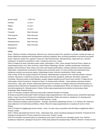 Symbol oferty: 1135/1719 Państwo: no conv : Region: no conv : Miasto: no conv : Transport: Brak informacji Profil wyjazdu: Brak informacji Wyżywienie: Brak informacji Zakwaterowanie: Brak informacji Wyposażenie: Brak informacji świadczenia: OPIS Dzień 1 Zbiórka na lotnisku w Warszawie. Wylot do Limy. Przylot do stolicy Peru, powitanie na lotnisku, transfer do hotelu, po drodze objaśnienie podstawowych paradygmatów cywilizacji andyjskiej, które umożliwią prawidłowe zrozumienie facynujacej historii i obecnych realiów Peru (zgodnie z teoria prof. Marii Roztworowski). Zakwaterowanie. Zapoznanie sie z owocami tropikalnymi na spotkaniu przywitalnym, toast z narodowym pisco sour, nocleg. Dzień 2 Przejście do starej, kolonialnej części miasta, założonego w 1535 r. przez samego Francisca Pizarro. Spacer po najważniejszym placu Limy, Plaza de Armas, wzdłuż Pałacu Rządowego, Katedry i siedziby arcybiskupiej. Podziwianie bogatych zbiorów Muzeum Złota, próba zrozumienia wizji świata przedinkaskiej i inkaskiej cywilizacji na bazie obejrzenia eksponatów z wyjaśnieniami przewodnika. Eksponowane przedmioty oprócz ich treści semiotycznej intrepretacji budzą niekłamany zachwyt nad wyczuciem piękna i jubilerskiego kunsztu mistrzów rzemieślników. Obiad i nocleg. Dzień 3 Godz. 03:30 rano wyjazd autokarem do Paracas, najciekawszego na wybrzeżu Peru rezerwatu ptactwa i zwierząt morskich. Obcowanie z nieskażoną przyrodą: obserwacja kormoranów, głuptaków, pelikanów, flamingów i pingwinów Humboldta. Wycieczka łodzią na Islas Ballestas, wysepki, będące siedzibą licznych kolonii lwów morskich. Przejazd do Ica krótki postój w Oazie Huacachina. Przejazd do Nazca. Po drodze postój w Mirador - wieża widokowa (pierwszy kontakt z liniami Nazca - figury ręka i drzewo). Obserwacja tajemniczych linii wyrytych na rozległym obszarze kamienistej pustyni ze specjalnej wieży widokowej lub fakultatywnie przelot awionetkami nad płaskowyżem Nazca (lot odbywa się w zależności od warunków pogodowych). Zakwaterowanie. Kolacja. Krótka sesja przygotowawcza do podróży do pierwszego miasta andyjskiego: Biała Arequipa.Nocleg. Dzień 4 Po śniadaniu przejazd malowniczą trasą wzdłuż wybrzeża Pacyfiku do Arequipy. W drodze przewodnik przeprowadzi krótkie treningowe sesje przygotowawcze w celu uzyskania przez uczestników optymalnej relacji z nowymi warunkami klimatycznymi andyjskiego środowiska. Obiad nad oceanem, zwiedzanie ruin dawnego portu inkaskiego (Puerto Inca). Zakwaterowanie po trudach podroży i nocleg. Dzień 5 Zwiedzanie białego miasta Kordylierów - Arequipa. Zwiedzanie zabytkowego centrum, m.in. klasztoru Św. Katarzyny, sesja zdjęciowa na tle kolonialnej architektury. Obiad. Wieczorna sesja przygotowawcza na wyprawę do kanionu Colca. Nocleg. Dzień 6 Przejazd do najgłębszego kanionu świata - Colca. Ten dziw natury wyrzeźbiła rzeka Rio Majes na głębokość 3400 m. Kolacja i nocleg. Dzień 7 Dalszy ciąg eksploracji Kanionu Colca - obserwacja nisko, prawie nad głową szybujących kondorów. Przyjazd do Puno leżącego na brzegu jeziora Titicaca w godzinach wieczornych. Kolacja i nocleg. Dzień 8 Po śniadaniu wycieczka łodzią na zamieszkane przez Indian z plemienia Uru "pływające wyspy" Uros. Obchód wysepek po niepewnym, uginającym się gruncie. Krótka sesja połączenia energetycznego z Wielkim Jeziorem. Konieczna seria 1/4 zdjęć na tle trzcinowych chatynek i ich mieszkańców. Wyjazd do Boliwii przez Copacabana i wizyta w miejscu kultu i pielgrzymek Kościele Maryjnym. Obiad. Dojazd do La Paz - jednego z najwyżej położonych miast świata. Zakwaterowanie. Nocleg Dzień 9 Intensywne zwiedzanie założonej w 1548 r. położonej w dolinie na wys. ok. 4000 m. n.p.m. stolicy - La Paz. Łowcy pamiątek i wyrobów będą mogli zdobyć do swoich kolekcji kolejne makatki, poncha, torby, wisiorki wykonane przez Indian Keczua. Sesja zdjęciowa w malowniczej scenerii targowisk i dam w melonikach. Ucieczka od gwaru miejskiego do Doliny Księżycowej (Valle de la Luna), gdzie na skutek erozji powstały niesamowite labirynty wąwozów i pinakli. Aby dotrzeć do doliny będziemy mieli okazję skorzystać z kolejki linowej (teleferico) z której wagoników roztacza się wspaniały widok na nowoczesną część La Paz. Obiad. Powrót do hotelu i nocleg. Dzień 10 Wyjazd do Puno, wizyta na ruinach Tiawanaku. Przekroczenie granicy peruwiańsko - boliwijskiej w Desaguadero. Po drodze zwiedzimy kościół w Pomata i świątynię płodności w Chuquito. Dojazd do Puno, zakwaterowanie. Kolacja i nocleg. Dzień 11 Po śniadaniu wyjazd w kierunku starej stolicy imperium Inków - Cusco. Po drodze zwiedzanie nekropolii i centrum ceremonialnego Sillustani. Obiad typu bufet w Sicuani. Zwiedzanie kompleksu archeologicznego w Raqchi ze świątynią poświęconą Wiracocha. Zwiedzanie Andahuaylillas - przepięknego kolonialnego kościoła zwanego Kaplicą Sykstyńską. Dojazd do Cusco. Zakwaterowanie i nocleg. Dzień 12 Całodniowa wycieczka z obiadem do Św. Doliny Inków. Po drodze do Pisac widoki na malownicze tarasy, zwiedzanie ruin Pisac, spacer na indiańskim rynku przepełnionym kramami ze swetrami, tkaninami i pamiątkami. Obiad. Zwiedzanie pozostałości kompleksowego obiektu Ollantaytambo. Sesja przygotowawcza do zwiedzania Machu Picchu. Nocleg w Cusco lub Urubamba. Dzień 13 Wycieczka do wymarzonego i najsłynniejszego na kontynencie zaginionego miasta - Machu Picchu. Obiekt został odkryty dopiero w 1911 roku przez amerykańskiego historyka. To niesamowite dzieło rąk ludzkich zadziwia doskonałością kamieniarki, bogactwem dekoracji i ciekawą treścią semiotyczną, którą przewodnik podkreśli podczas wizyty o charakterze ceremonialnym. Sesja zdjęciowa na tle ruin Świątyni Trzech Okien, Słonecznego Obserwatorium i malowniczych tarasów. (Dla chętnych możliwość wejścia na szczyt Huayna Picchu lub Machu Picchu-za dodatkową opłatą-rez