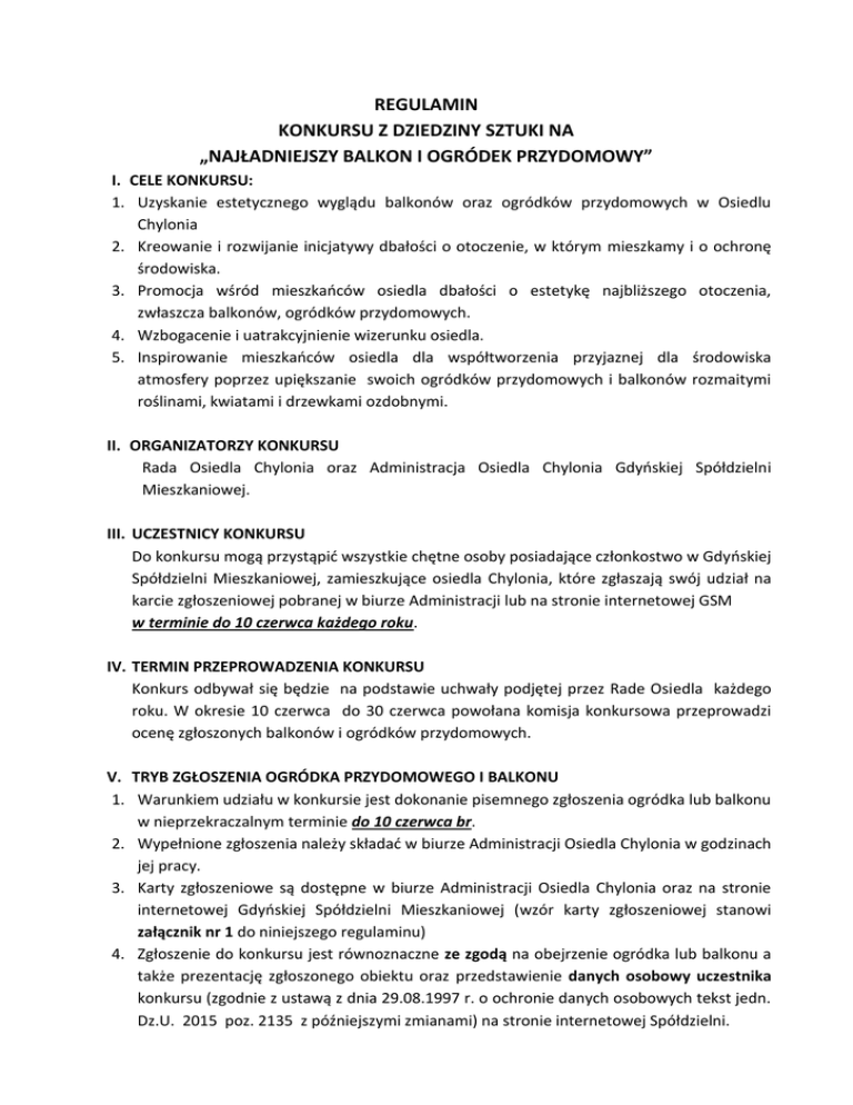 REGULAMIN KONKURSU Z DZIEDZINY SZTUKI NA „NAJŁADNIEJSZY BALKON I OGRÓDEK PRZYDOMOWY” I. CELE KONKURSU: 1. Uzyskanie estetycznego wyglądu balkonów oraz ogródków przydomowych w Osiedlu Chylonia 2. Kreowanie i rozwijanie inicjatywy dbałości o otoczenie, w którym mieszkamy i o ochronę środowiska. 3. Promocja wśród mieszkańców osiedla dbałości o estetykę najbliższego otoczenia, zwłaszcza balkonów, ogródków przydomowych. 4. Wzbogacenie i uatrakcyjnienie wizerunku osiedla. 5. Inspirowanie mieszkańców osiedla dla współtworzenia przyjaznej dla środowiska atmosfery poprzez upiększanie swoich ogródków przydomowych i balkonów rozmaitymi roślinami, kwiatami i drzewkami ozdobnymi. II. ORGANIZATORZY KONKURSU Rada Osiedla Chylonia oraz Administracja Osiedla Chylonia Gdyńskiej Spółdzielni Mieszkaniowej. III. UCZESTNICY KONKURSU Do konkursu mogą przystąpić wszystkie chętne osoby posiadające członkostwo w Gdyńskiej Spółdzielni Mieszkaniowej, zamieszkujące osiedla Chylonia, które zgłaszają swój udział na karcie zgłoszeniowej pobranej w biurze Administracji lub na stronie internetowej GSM w terminie do 10 czerwca każdego roku. IV. TERMIN PRZEPROWADZENIA KONKURSU Konkurs odbywał się będzie na podstawie uchwały podjętej przez Rade Osiedla każdego roku. W okresie 10 czerwca do 30 czerwca powołana komisja konkursowa przeprowadzi ocenę zgłoszonych balkonów i ogródków przydomowych. V. TRYB ZGŁOSZENIA OGRÓDKA PRZYDOMOWEGO I BALKONU 1. Warunkiem udziału w konkursie jest dokonanie pisemnego zgłoszenia ogródka lub balkonu w nieprzekraczalnym terminie do 10 czerwca br. 2. Wypełnione zgłoszenia należy składać w biurze Administracji Osiedla Chylonia w godzinach jej pracy. 3. Karty zgłoszeniowe są dostępne w biurze Administracji Osiedla Chylonia oraz na stronie internetowej Gdyńskiej Spółdzielni Mieszkaniowej (wzór karty zgłoszeniowej stanowi załącznik nr 1 do niniejszego regulaminu) 4. Zgłoszenie do konkursu jest równoznaczne ze zgodą na obejrzenie ogródka lub balkonu a także prezentację zgłoszonego obiektu oraz przedstawienie danych osobowy uczestnika konkursu (zgodnie z ustawą z dnia 29.08.1997 r. o ochronie danych osobowych tekst jedn. Dz.U. 2015 poz. 2135 z późniejszymi zmianami) na stronie internetowej Spółdzielni. 5. W konkursie nie mogą brać udziału pracownicy organizatora konkursu ani członkowie komisji konkursowej. 6. Decyzja komisji konkursowej jest ostateczna i nie podlega odwołaniu. VI. WARUNKI PRZEPROWADZENIA KONKURSU 1. Organizator konkursu zastrzega sobie prawo do odstąpienia od przeprowadzenia konkursu jeżeli nie wpłyną do biura Administracji Osiedla Chylonia co najmniej 6 pisemnych zgłoszeń uczestników konkursu. 2. Organizator konkursu zastrzega sobie prawo do nierozpatrywania zgłoszeń, które wpłyną do biura administracji Osiedla Chylonia po terminie wskazanym w niniejszym regulaminie. VII. KRYTERIA OCENY I PUNKTACJA 1. Za zagospodarowanie balkonu oraz ogródka zgodnie z regulaminem Zakładania i Użytkowania Przydomowych Ogródków Kwiatowych (rośliny kwiatowe oraz krzewy i drzewka ozdobne, ogrodzenie) 1-10 pkt. 2. Za dobór roślin kwiatowych zapewniających kwitnienie od wiosny do jesieni 1-10 pkt. 3. Za walory estetyczne oraz inne dekoracyjne elementy balkonu(np. skrzynki, pojemniki z kwiatami) oraz inne efektowne wyposażenie ogródków. 1-10 pkt. 4. Za ład i porządek na balkonie i ogródku. 1-10 pkt. VIII. KOMISJA KONKURSOWA 1. Oceny dokonuje Komisja konkursowa w składzie minimum 3 osoby w skład, której wchodzą przedstawiciele rady osiedla Chylonia. 2. Komisja konkursowa dokona indywidualnej oceny na karcie, która stanowi załącznik nr 2 do niniejszego regulaminu. Przyjmuje się skalę ocen od 1 do 10 punktów. Ocena ostateczna jest wyliczona średnią arytmetyczną ocen punktowych poszczególnych członków komisji. 3. Podstawa oceny będą wyniki wizytacji udokumentowane na kartach oceny (załącznik nr 2) zawierające szczegółowe zasady punktacji. IX. NAGRODY I ROZSTRZYGNIĘCIE KONKURSU 1. Nagrody rzeczowe i dyplomy zostaną przyznane za pierwsze trzy miejsca w kategorii ogródek przydomowy i za pierwsze trzy miejsca w kategorii balkon. 2. Wyniki konkursu zostaną ogłoszone za stronie internetowej Gdyńskiej Spółdzielni Mieszkaniowej. 3. Zwycięzcy konkursu o terminie i miejscu wręczenia nagród rzeczowych oraz dyplomów zostaną powiadomieni telefonicznie lub pisemnie. Regulamin został zatwierdzony Uchwała Rady Osiedla Chylonia nr 1/2016 w dniu 18.01.2016 r ( protokół nr 1/2016 ) . Załącznik nr 1 Do Regulaminu konkursu z dziedziny sztuki „Na najładniejszy balkon i ogródek przydomowy” organizowany przez Radę Osiedla Chylonia oraz Administrację Osiedla Chylonia GSM . KARTA ZGŁOSZENIOWA DO KONKURSU NA NAJŁADNIESZY BALKON I OGRÓDEK PRZYDOMOWY. Data zgłoszenia Imię Nazwisko Adres zamieszkania Adres zgłoszonego balkonu Adres zgłoszonego ogródka przydomowego PESEL Nr. dowodu osobistego Telefon kontaktowy Urząd Skarbowy Niniejszym zgłaszam swój udział w konkursie „Na najładniejszy balkon i ogródek przydomowy”. Oświadczam, że zapoznałem się z treścią regulaminu i akceptuję jego postanowienia. „Wyrażam zgodę na przetwarzanie moich danych osobowych dla potrzeb konkursu, zgodnie z ustawą z dnia 29.08.1997 r. o ochronie danych osobowych tekst jedn. (Dz. U. 2015 poz. 2135 z późniejszymi zmianami)”. ……………………………………………………….. Podpis uczestnika Potwierdzenie złożonego zgłoszenia ……………………………………………………….. Data i pieczątka Administracji Osiedla KRYTERIA OCENY I PUNKTACJA Imię i nazwisko ……………………………………………………………. Data dokonanej oceny ……………………………………..……………………. 1. Za zagospodarowanie balkonu oraz ogródka zgodnie z regulaminem Zakładania i Użytkowania Przydomowych O