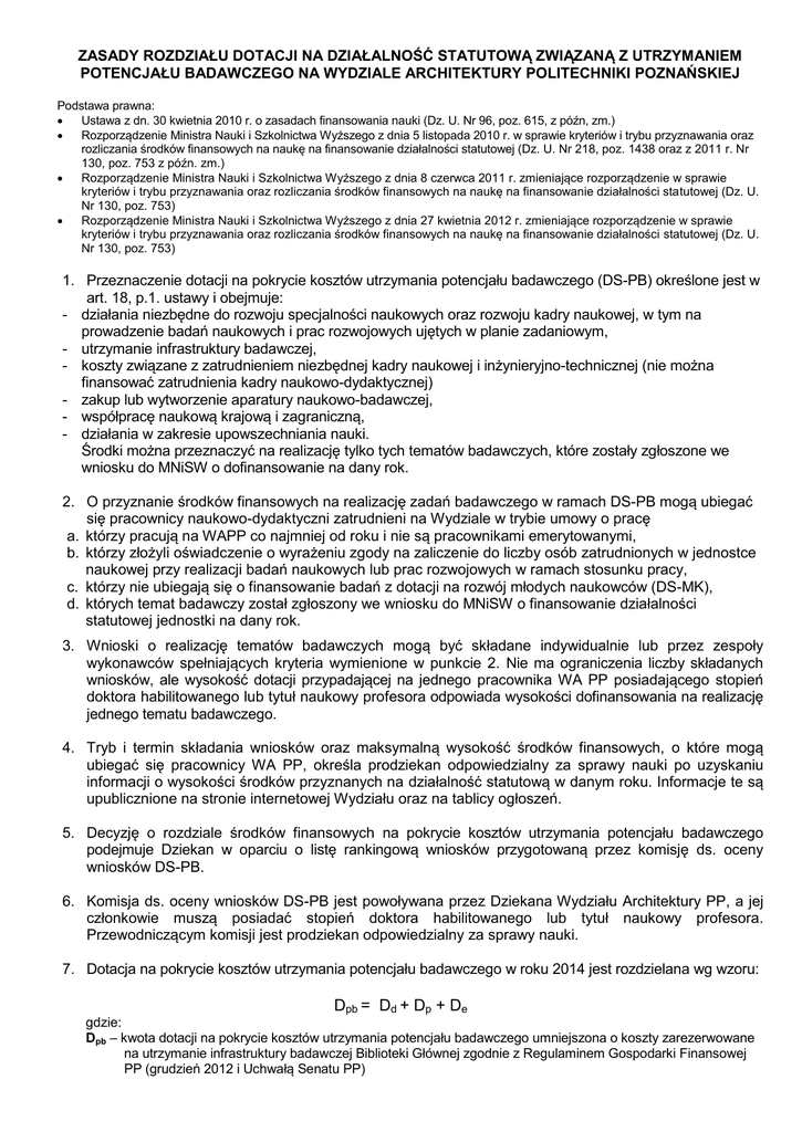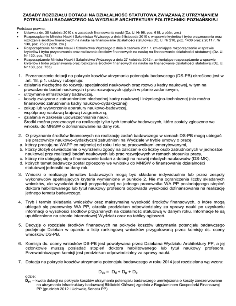 ZASADY ROZDZIAŁU DOTACJI NA DZIAŁALNOŚĆ STATUTOWĄ ZWIĄZANĄ Z UTRZYMANIEM POTENCJAŁU BADAWCZEGO NA WYDZIALE ARCHITEKTURY POLITECHNIKI POZNAŃSKIEJ Podstawa prawna: Ustawa z dn. 30 kwietnia 2010 r. o zasadach finansowania nauki (Dz. U. Nr 96, poz. 615, z późn, zm.) Rozporządzenie Ministra Nauki i Szkolnictwa Wyższego z dnia 5 listopada 2010 r. w sprawie kryteriów i trybu przyznawania oraz rozliczania środków finansowych na naukę na finansowanie działalności statutowej (Dz. U. Nr 218, poz. 1438 oraz z 2011 r. Nr 130, poz. 753 z późn. zm.) Rozporządzenie Ministra Nauki i Szkolnictwa Wyższego z dnia 8 czerwca 2011 r. zmieniające rozporządzenie w sprawie kryteriów i trybu przyznawania oraz rozliczania środków finansowych na naukę na finansowanie działalności statutowej (Dz. U. Nr 130, poz. 753) Rozporządzenie Ministra Nauki i Szkolnictwa Wyższego z dnia 27 kwietnia 2012 r. zmieniające rozporządzenie w sprawie kryteriów i trybu przyznawania oraz rozliczania środków finansowych na naukę na finansowanie działalności statutowej (Dz. U. Nr 130, poz. 753) 1. Przeznaczenie dotacji na pokrycie kosztów utrzymania potencjału badawczego (DS-PB) określone jest w art. 18, p.1. ustawy i obejmuje: - działania niezbędne do rozwoju specjalności naukowych oraz rozwoju kadry naukowej, w tym na prowadzenie badań naukowych i prac rozwojowych ujętych w planie zadaniowym, - utrzymanie infrastruktury badawczej, - koszty związane z zatrudnieniem niezbędnej kadry naukowej i inżynieryjno-technicznej (nie można finansować zatrudnienia kadry naukowo-dydaktycznej) - zakup lub wytworzenie aparatury naukowo-badawczej, - współpracę naukową krajową i zagraniczną, - działania w zakresie upowszechniania nauki. Środki można przeznaczyć na realizację tylko tych tematów badawczych, które zostały zgłoszone we wniosku do MNiSW o dofinansowanie na dany rok. 2. O przyznanie środków finansowych na realizację zadań badawczego w ramach DS-PB mogą ubiegać się pracownicy naukowo-dydaktyczni zatrudnieni na Wydziale w trybie umowy o pracę a. którzy pracują na WAPP co najmniej od roku i nie są pracownikami emerytowanymi, b. którzy złożyli oświadczenie o wyrażeniu zgody na zaliczenie do liczby osób zatrudnionych w jednostce naukowej przy realizacji badań naukowych lub prac rozwojowych w ramach stosunku pracy, c. którzy nie ubiegają się o finansowanie badań z dotacji na rozwój młodych naukowców (DS-MK), d. których temat badawczy został zgłoszony we wniosku do MNiSW o finansowanie działalności statutowej jednostki na dany rok. 3. Wnioski o realizację tematów badawczych mogą być składane indywidualnie lub przez zespoły wykonawców spełniających kryteria wymienione w punkcie 2. Nie ma ograniczenia liczby składanych wniosków, ale wysokość dotacji przypadającej na jednego pracownika WA PP posiadającego stopień doktora habilitowanego lub tytuł naukowy profesora odpowiada wysokości dofinansowania na realizację jednego tematu badawczego. 4. Tryb i termin składania wniosków oraz maksymalną wysokość środków finansowych, o które mogą ubiegać się pracownicy WA PP, określa prodziekan odpowiedzialny za sprawy nauki po uzyskaniu informacji o wysokości środków przyznanych na działalność statutową w danym roku. Informacje te są upublicznione na stronie internetowej Wydziału oraz na tablicy ogłoszeń. 5. Decyzję o rozdziale środków finansowych na pokrycie kosztów utrzymania potencjału badawczego podejmuje Dziekan w oparciu o listę rankingową wniosków przygotowaną przez komisję ds. oceny wniosków DS-PB. 6. Komisja ds. oceny wniosków DS-PB jest powoływana przez Dziekana Wydziału Architektury PP, a jej członkowie muszą posiadać stopień doktora habilitowanego lub tytuł naukowy profesora. Przewodniczącym komisji jest prodziekan odpowiedzialny za sprawy nauki. 7. Dotacja na pokrycie kosztów utrzymania potencjału badawczego w roku 2014 jest rozdzielana wg wzoru: Dpb = Dd + Dp + De gdzie: Dpb – kwota dotacji na pokrycie kosztów utrzymania potencjału badawczego umniejszona o koszty zarezerwowane na utrzymanie infrastruktury badawczej Biblioteki Głównej zgodnie z Regulaminem Gospodarki Finansowej PP (grudzień 2012 i Uchwałą Senatu PP) Dd – część kwoty dotacji (ok. 15% Dpb) przeznaczona na finansowanie wniosków złożonych przez pracowników zatrudnionych na Wydziale Architektury PP nie posiadających stopnia doktora habilitowanego, ani tytułu naukowego profesora, a spełniających kryteria określone w p.2. Dp – dotacja podstawowa - kwota dofinansowania (ok. 45% Dpb) przydzielona na realizację tematów badawczych wszystkich pracowników WA PP posiadających stopień doktora habilitowanego lub tytuł naukowy profesora uzyskany w roku poprzedzającym rok złożenia wniosku lub wcześniej. Kwota to jest dzielona równo pomiędzy wszystkich samodzielnych pracowników naukowych WAPP, którzy spełniają kryteria określone w p.2. De – kwota dofinansowania premiowego (ok. 40% Dpb) przydzielana wg listy rankingowej stworzonej przez komisję ds. oceny wniosków DS-PB na podstawie liczby punktów uzyskanych przez poszczególne zespoły badawcze pod kierownictwem samodzielnych pracowników naukowych WAPP w roku poprzedzającym złożenie wniosku. 8. Dotacja na pokrycie kosztów utrzymania potencjału badawczego w roku 2015 i kolejnych będzie rozdzielana wg wzoru: Dpb = (Dd + R) + (Dp – R) + De gdzie: Dpb – j.w. R – suma niewykorzystanych środków przyznanych na badania w ramach DS-PB dwa lata przed rokiem składania wniosku, które musiały zostać zwrócone do MNiSW. Sumuje się zwrócone środki z poszczególnych projektów badawczych (Ri) przekraczające kwotę 500 zł. Dd – j.w. Kwota dotacji na wnioski doktorskie jest zwiększana o R przed rozdziałem środków. Dp – j.w. Kwota dotacji podstawowej jest umniejszana o R dopiero przy rozdziale środków dla poszczególnych, samodzielnych pra