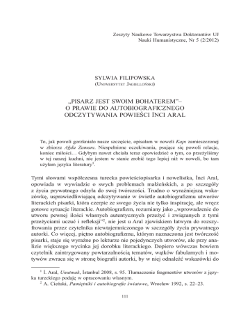 Zeszyty Naukowe Towarzystwa Doktorantów UJ Nauki Humanistyczne, Nr 5 (2/2012) Sylwia Filipowska (Uniwersytet Jagielloński) „Pisarz jest swoim bohaterem”– o prawie do autobiograficznego odczytywania powieści İnci Aral To, jak powoli gorzkniało nasze szczęście, opisałam w noweli Kapı zamieszczonej w zbiorze Ağda Zamanı. Niespełnione oczekiwania, psujące się powoli relacje, koniec miłości… Gdybym nawet chciała teraz opowiedzieć o tym, co przeżyliśmy w tej naszej kuchni, nie jestem w stanie zrobić tego lepiej niż w noweli, bo tam użyłam języka literatury1. Tymi słowami współczesna turecka powieściopisarka i nowelistka, İnci Aral, opowiada w wywiadzie o swych problemach małżeńskich, a po szczegóły z życia prywatnego odsyła do swej twórczości. Trudno o wyraźniejszą wskazówkę, usprawiedliwiającą odczytywanie w świetle autobiografizmu utworów literackich pisarki, która czerpie ze swego życia nie tylko inspirację, ale wręcz gotowe sytuacje literackie. Autobiografizm, rozumiany jako „wprowadzenie do utworu pewnej ilości własnych autentycznych przeżyć i związanych z tymi przeżyciami uczuć i refleksji”2, nie jest u Aral zjawiskiem łatwym do rozszyfrowania przez czytelnika niewtajemniczonego w szczegóły życia prywatnego autorki. Co więcej, piętno autobiografizmu, którym naznaczona jest twórczość pisarki, staje się wyraźne po lekturze nie pojedynczych utworów, ale przy analizie większego wycinka jej dorobku literackiego. Dopiero wówczas bowiem czytelnik zaintrygowany powtarzalnością tematów, wątków fabularnych i motywów zwraca się w stronę biografii autorki, by w niej odnaleźć wskazówki do İ. Aral, Unutmak, İstanbul 2008, s. 95. Tłumaczenie fragmentów utworów z języka tureckiego podaję w opracowaniu własnym. 2 A. Cieński, Pamiętniki i autobiografie światowe, Wrocław 1992, s. 22–23. 1 111 Sylwia Filipowska zrozumienia zagadkowej twórczości. W przypadku niniejszego artykułu reprezentatywną dziedziną, na której przedstawione zostanie zagadnienie autobiografizmu w twórczości Aral, jest jej powieściopisarstwo. İnci Aral urodziła się w 1944 roku w Denizli. Po ukończeniu w 1964 roku studiów na Wydziale Malarstwa Instytutu Nauczycielskiego Gazi (późniejszy Uniwersytet Gazi) w Ankarze pracowała aż do emerytury w gimnazjach jako nauczycielka rysunku. Zadebiutowała w 1977 roku nowelą pod tytułem Haziranlarda (Jakoś w czerwcu3), która ukazała się w czasopiśmie „Türk Dili” („Język Turecki”). Twórczość nowelistyczną Aral reprezentują następujące tomy opowiadań: Ağda Zamanı (Czas depilacji, 1979), Kıran Resimleri (Obrazy rzezi, 1984), Uykusuzlar (Chorzy na bezsenność, 1984), Sevginin Eşsiz Kışı (Wyjątkowa zima miłości, 1986), Gölgede Kırk Derece (Czterdzieści stopni w cieniu, 2000), Ruhumu Öpmeyi Unuttun (Zapomniałeś ucałować mą duszę, 2006). Jeszcze bardziej okazale prezentuje się jej powieściopisarstwo: Ölü Erkek Kuşlar (Martwe ptaki, 1991), Yeni Yalan Zamanlar (Czasy nowego kłamstwa, 1994)/ Yeşil (Zieleń)4, Hiçbir Aşk Hiçbir Ölüm (Ani miłości, ani śmierci, 1997), İçimden Kuşlar Göçüyor (Ptaki ze mnie odlatują, 1998), Mor (Fiolet, 2003), Taş ve Ten (Kamień i ciało, 2005), Safran Sarı (Żółć szafranu, 2007), Sadakat (Wierność, 2010), Şarkını Söylediğin Zaman (Kiedy śpiewałeś swoją piosenkę, 2011). Za efekt prac nad innymi gatunkami literackimi można uznać dwa tomiki esejów: Anlar İzler Tutkular (Chwile, ślady, pasje, 2003), Yazma Büyüsü (Magia pisania, 2011) oraz Unutmak (Zapomnieć, 2008) – specyficzną książkę w formie wywiadu rzeki, nazwaną przez Aral po prostu opowieścią5. Pisarka jest laureatką kilku cenionych w Turcji nagród literackich, między innymi za Gölgede Kırk Derece, Ölü Erkek Kuşlar czy Mor, a dwa tomy jej opowiadań zostały przetłumaczone na język francuski i opublikowane we Francji (Kıran Resimleri i Uykusuzlar). Obecnie Aral mieszka w Stambule i jako emerytowana nauczycielka oddaje się pracy twórczej. Uważana jest za jednego z najważniejszych przedstawicieli postmodernizmu w literaturze tureckiej ostatnich lat. Przedstawiona powyżej krótka informacja biograficzna, jaką zainteresowany postacią pisarza czytelnik odnaleźć może w każdym słowniku czy encyklopedii6, 3 Tłumaczenie tureckich tytułów na język polski – własne. W Polsce dotychczas nie ukazało się tłumaczenie żadnego z utworów İnci Aral. 4 Podczas pisania Safran Sarı İnci Aral zdecydowała się na połączenie trzech powieści: Yeni Yalan Zamanlar, Mor i Safran Sarı w luźną trylogię pod wspólnym tytułem Yeni Yalan Zamanlar. Pociągnęło to za sobą zmianę tytułu Yeni Yalan Zamanlar na Yeşil – wszystkie wydania tej powieści po 2007 roku zatytułowane są Yeşil. 5 Mimo iż osobą przeprowadzającą wywiad z İnci Aral jest Tolga Meriç, na karcie tytułowej jako nazwisko autora książki widnieje nazwisko pisarki. Z tego powodu zwykło się zaliczać tę „opowieść” do jej dorobku literackiego. 6 İ. Enginün, Cumhuriyet Dönemi Türk Edebiyatı, İstanbul 2002, s. 363. Por. 112 „Pisarz jest swoim bohaterem”... nie jest oczywiście źródłem wystarczającym do badania zjawiska autobiografizmu w twórczości Aral. Źródłem takim (a raczej jednym ze źródeł) może być Unutmak, książka klucz do dotychczasowego dorobku literackiego pisarki. Unutmak to obszerny, prawie trzystupięćdziesięciostronicowy wywiad, przeprowadzony przez Tolgę Meriç, w którym pisarka odpowiada szczegółowo na pytania związane z życiem osobistym, pracą zawodową i okolicznościami powstawania poszczególnych utworów. Oprócz wypowiedzi, które – podobnie jak cytat przytoczony na początku artykułu – bezpośrednio wskazują na związek pewnych przeżyć autorki z jej utworami, odnaleźć można w Unutmak wiele autentycznych historii, powtarzających się w mniej