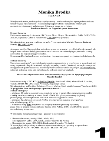 Monika Brodka GRANDA Niniejszy dokument jest integralną częścią umowy i zawiera niezbędne wymagania techniczne, umożliwiające wykonawcom i realizatorom przeprowadzenie koncertu na właściwym poziomie artystycznym i technicznym. Dokument składa sie z 4 stron. Prosimy o kontakt na 2 tygodnie przed koncertem System frontowy Preferowane systemy: L-Acoustic, JBL Vertec, Nexo, Meyer, Electro-Voice, D&B, EAW, CODA AirLine, Dynacord Cobra 4, Polanowski (TYLKO nowe systemy). Nie akceptujemy aparatur „zrobione na wzór...” oraz systemów Mackie, Dynacord (stary), Peavey, JBL SRX!!!! etc. Aparatura musi być bezwzględnie uziemiona, wolna od szumów i przydźwięków sieciowych lub innych które uniemożliwiają przeprowadzenie koncertu na zadowalającym poziomie, o mocy adekwatnej do nagłaśnianej powierzchni. System musi być zainstalowany, uruchomiony i sprawdzony przed przyjazdem techniki zespołu. Mikser frontowy Ustawiony „centralnie” z uwzględnieniem małego przesunięcia w lewo/prawo w stosunku do osi sceny, w połowie długości widowni, najlepiej na podwyższeniu (30-40cm), zabezpieczony przed dostępem osób postronnych oraz przed wpływem warunków atmosferycznych. Nie akceptujemy ustawień miksera z boku sali, na balkonach, pod nimi oraz we wnękach. Mikser lub odpowiednia ilość kanałów musi być wyłącznie do dyspozycji zespołu Moniki Brodki! Preferowane stoły – TYLKO: Roland M-380/400, Soundcraft Vi4/6, Allen&Heath iLive 144, Yamaha PM5D-RH, LS9, Midas Pro6/XL8, Digidesign Venue Nie akceptujemy stołów firm Behringer, Peavey, Mackie, Spirit a także konsolet Yamaha serii GA! W przypadku stołu analogowego – prosimy o kontakt! Mikser analogowy: - minimum 40 wejść z parametryczną regulacja barwy w kanale (dwa parametryczne środki) - każdy kanał wyposażony w insert, tłumik –20dB, filtr górnoprzepustowy (najlepiej przestrajany), zasilanie phantom, wskaźnik obecności sygnału w kanale. - minimum 4 podgrupy i 6 wysyłek AUX z przestawianym punktem pracy pre/post mile widziane grupy VCA - W insercie sumy musi znajdować się tercjowy korektor graficzny wykonany przez firmę o uznanej reputacji (Klark-Teknik, BSS, Ashley, DBX) oraz DOBREJ jakości stereofoniczny kompresor. W przypadku miksera analogowego – prosimy o zapewnienie: - 7 bramek (Drawmer, Ashley, Klark, Altair, BSS) - 11 kompresorów (BSS, DBX, Klark, Altair, Focusrite, TL Audio) - 5 kompresorów stereo (BSS, DBX, Klark, Altair, Focusrite, TL Audio) W sytuacji gdy nie jedziemy z własnym systemem efektowym - prosimy o zapewnienie: 1xSPX990, 3x PCM91 / PCM81 / SPX2000 / SPX990 / M-ONE System monitorowy Ustawiony w miejscu umożliwiający kontakt wzrokowy miedzy realizatorem a muzykami. Konsoleta monitorowa – TYLKO!!!!: Soundcraft Vi4/6, Yamaha PM5D-RH, M7CL, LS9 3 monitory odsłuchowe (razem z monitorem dla realizatora) min.350W(RMS). Sidefill min.800W . Preferowane systemy monitorowe: JBL SRX712M, Turbosound TFM-212, Martin LE400C, HK Audio SM112II, Meyer MJF-212. Mikser lub odpowiednia ilość kanałów musi być wyłącznie do dyspozycji zespołu Moniki Brodki! Prosimy o kontakt z realizatorem monitorów: Łukasz Damm +48 509 387 789 , [email protected] Zasilanie System (aparatura + sprzęt muzyków) musi być zasilany z tego samego źródła, umożliwiającego odpowiedni pobór mocy – adekwatnie do potrzeb zainstalowanej aparatury. Zarówno w przypadku zasilania jednofazowego, jak i trójfazowego, bezwzględnie wymagana jest instalacja z dodatkowym przewodem ochronnym. Firma zapewniająca nagłośnienie i zasilanie sprzętu zespołu bierze na siebie całkowitą odpowiedzialność za bezpieczeństwo wykonawców, realizatorów i techniki zespołu podczas prób i koncertu. Uwagi Wszystkie połączenia powinny być prowadzone w sposób symetryczny przy użyciu kabli dobrej jakości i zakończone końcówkami XLR. Miedzy scena a konsoleta frontowa musi być poprowadzona komunikacja TalkBack! Dla perkusji wymagany ekran akustyczny (pleksa) – min. 5 paneli W czasie prób i koncertu obowiązkowa jest obecność doświadczonej ekipy technicznej odpowiedzialnej za aparaturę nagłaśniającą. Przy stanowisku FOH, prosimy o zapewnienie statywu typu „X” lub flightcase'u o wys. ok. 100cm pod rack efektowy. Dopuszczamy możliwość zmian – po wcześniejszym ich zaakceptowaniu przez zespół. W przypadku wątpliwości lub uzyskania dodatkowych informacji prosimy o kontakt na 2 tyg. przed koncertem. Olga Tuszewska +48 503 565 429, [email protected] – manager Mateusz Mizik +48 509 810 680, [email protected] – technika Łukasz Damm +48 509 387 789 , [email protected] – realizator mon. Jacek Mazur +48 666 008 087 [email protected] – realizator front MONIKA BRODKA Granda Input List CH. 1 2 3 4 5 6 7 8 9 10 11 12 13 14 15 16 17 18 19 20 21 22 23 24 25 26 27 28 29 30 31 32 33 34 35 36 INSTRUMENT Kick Kick Snare 1 Top Snare 1 Btm Snare 2 Top Tom 1 Tom 2 HH 1 OH OH Ride Bass Maly Acc Guitar Maly El. Guit Mandolin Amp Lech Acc. Guitar Rhodes Bartek KORG Maly Vir L Maly Vir R Kasia Korg L Kasia Korg R Maly Sample L Maly Sample R Maly Loop L Maly Loop R Maly PC Bass Kasia Monika Monika split* Monika zapas. FX RET L FX RET R MP3 MP3 MEASURE MIKROFON / DI ATM25HE Y z kanału 1 e904 AT Pro35X e904 e904 e904 SM81 AT2020 AT2020 AT2020 DI Act. XLR e906 XLR DI Act. DI Act. DI Act. DI Act. DI Act. DI Act. DI Act. DI Act. DI Act. DI Act. DI Act. DI Act. AE6100 własny Y z kanału 29 Beta58 Jacek Mazur STATYW Short Boom Short Boom Short Boom Short Boom Short Boom Tall Boom Tall Boom Tall Boom Short Boom Short Boom Tall Boom Tall Boom SM58 MONITOR 1 CLICK 3 4 5 6 7 8 9 10 11 12 13 14 15 16 17 18 19 20 21 22 23 24 25 26 27 28 29 30 31 FX RET L FX RET R Amb Amb INSERT GATE GATE GATE GATE GATE GATE GATE COMP COMP COMP COMP COMP COMP COMP stereo COMP 1 stereo COMP 1 stereo COMP 2 stereo COMP 2 COMP COMP COMP COMP własny GRP 1 / 2 GRP 3 / 4 MONITOR MIX aux 1,2 aux 3,4 aux 5,6 aux 7,8 aux 9,10 aux 11,12 