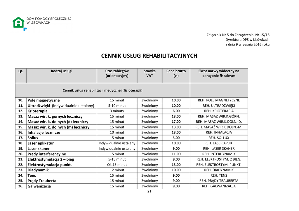 Załącznik Nr 5 do Zarządzenia Nr 15/16 Dyrektora DPS w Lisówkach z dnia 9 września 2016 roku CENNIK USŁUG REHABILITACYJNYCH Lp. Rodzaj usługi Czas zabiegów (orientacyjny) Stawka VAT Cena brutto (zł) Skrót nazwy widoczny na paragonie fiskalnym Zwolniony Zwolniony Zwolniony Zwolniony Zwolniony Zwolniony Zwolniony Zwolniony Zwolniony Zwolniony Zwolniony Zwolniony Zwolniony Zwolniony Zwolniony Zwolniony Zwolniony 21 10,00 10,00 6,00 13,00 17,00 13,00 13,00 5,00 10,00 9,00 11,00 9,00 13,00 10,00 9,00 9,00 9,00 REH. POLE MAGNETYCZNE REH. ULTRADŹWIĘKI REH. KRIOTERAPIA REH. MASAŻ WIR.K.GÓRN. REH. MASAŻ WIR.K.DOLN.-D. REH. MASAŻ WIR.K.DOLN.-M. REH. INHALACJA REH. SOLLUX REH. LASER APLIK. REH. LASER SKANER REH. INTERDYNAMIK REH. ELEKTROSTYM. 2 BIEG. REH. ELEKTROSTYM. PUNKT. REH. DIADYNAMIK REH. TENS REH. PRĄDY TRAUBERTA REH. GALWANIZACJA Cennik usług rehabilitacji medycznej (fizjoterapii) 10. 11. 12. 13. 14. 15. 16. 17. 18. 19. 20. 21. 22. 23. 24. 25. 26. Pole magnetyczne Ultradźwięki (indywidualnie ustalany) Krioterapia Masaż wir. k. górnych leczniczy Masaż wir. k. dolnych (d) leczniczy Masaż wir. k. dolnych (m) leczniczy Inhalacje lecznicze Sollux Laser aplikatur Laser skaner Prądy interferencyjne Elektrostymulacja 2 – bieg Elektrostymulacja punkt. Diadynamik Tens Prądy Trauberta Galwanizacja 15 minut 5-10 minut 3 minuty 15 minut 15 minut 15 minut 10 minut 15 minut Indywidualnie ustalany Indywidualnie ustalany 15 minut 5-15 minut Ok.15 minut 12 minut 15 minut 15 minut 15 minut 27. 28. 29. 30. 31. 32. 33. 34. 35. Tonoliza Jonoforeza Ćwiczenia w odciążeniu (ugul) Bioptron Okłady cieplne Tlenoterapia lecznicza Ćwiczenia indywidualne (lecznicze) Ćwiczenia grupowe(lecznicze) Dynamometria (lecznicza) 36. Aquavibron masaż leczniczy 15 minut 15 minut 20 minut 10 minut 20 minut 10 minut 30 minut 30 minut 30 minut Indywidualnie ustalany (10-15 minut) Zwolniony Zwolniony Zwolniony Zwolniony Zwolniony Zwolniony Zwolniony Zwolniony Zwolniony 9,00 10,00 18,00 15,00 11,00 13,00 24,00 6,00 5,00 REH. TONOLIZA REH. JONOFOREZA REH. ĆWICZ. UGUL REH. BIOPTRON REH. OKŁADY CIEPL. REH. TLENOTERAP. REH. ĆWICZ. INDYWID. REH. ĆWICZ. GRUPOWE REH. DYNAMOMETRIA Zwolniony 12,00 REH. AQUAVIBRON Skrót nazwy widoczny na paragonie fiskalnym Cennik usług relaksującyjno-kosmetycznych 37. 38. 39. 40. 41. Masaż Wellnes 30 minut 23% 17,00 MASAŻ WELLNES Fotel do masażu 15 minut 23% 12,00 FOTEL DO MASAŻU Kapsuła SPA (program 1-9) 30 minut 23% 37,00 KAPSUŁA SPA Masaż podwodny- CARACALLA 30 minut 23% 35,00 MASAŻ PODWOD. CARACALLA Solarium – 1 minuta *** Maksymalnie 13 minut 23% 1,00 SOLARIUM – MIN. Solarium – karnet obejmujący 100 minut Maksymalnie 23% 75,00 SOLARIUM - KARNET 100 42. (karnet ważny do 31 grudnia)*** 13 minut jednorazowo Solarium – karnet obejmujący 50 minut Maksymalnie 23% 42,00 SOLARIUM - KARNET 50 43. (karnet ważny do 31 grudnia)*** 13 minut jednorazowo 44. Masaż Roll Shaper – 1 zabieg – 60 minut 60 minut 23% 12,00 MASAŻ ROLL SHAPER Usługi świadczone nieodpłatnie dla mieszkańców DPS w Lisówkach w ramach zleceń lekarskich poz.10-28,34,38-40. *** Karnety na solarium tracą ważność 31 grudnia każdego roku budżetowego. Uwaga: Maksymalny czas korzystania z solarium jednorazowo wynosi 13 minut. 22
