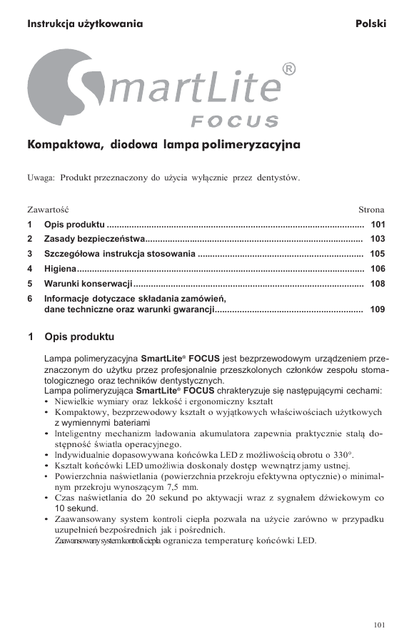 Instrukcja użytkowania Polski Kompaktowa, diodowa lampa polimeryzacyjna Uwaga: Produkt przeznaczony do użycia wyłącznie przez dentystów. Zawartość Strona 1 Opis produktu ........................................................................................................ 101 2 Zasady bezpieczeństwa........................................................................................ 103 3 Szczegółowa instrukcja stosowania ................................................................... 105 4 Higiena.................................................................................................................... 106 5 Warunki konserwacji ............................................................................................. 108 6 Informacje dotyczace składania zamówień, dane techniczne oraz warunki gwarancji............................................................ 109 1 Opis produktu Lampa polimeryzacyjna SmartLite® FOCUS jest bezprzewodowym urządzeniem przeznaczonym do użytku przez profesjonalnie przeszkolonych członków zespołu stomatologicznego oraz techników dentystycznych. Lampa polimeryzująca SmartLite® FOCUS chrakteryzuje się następującymi cechami: • Niewielkie wymiary oraz lekkość i ergonomiczny kształt • Kompaktowy, bezprzewodowy kształt o wyjątkowych właściwościach użytkowych z wymiennymi bateriami • Inteligentny mechanizm ładowania akumulatora zapewnia praktycznie stałą dostępność światła operacyjnego. • Indywidualnie dopasowywana końcówka LED z możliwością obrotu o 330°. • Kształt końcówki LED umożliwia doskonały dostęp wewnątrz jamy ustnej. • Powierzchnia naświetlania (powierzchnia przekroju efektywna optycznie) o minimalnym przekroju wynoszącym 7,5 mm. • Czas naświetlania do 20 sekund po aktywacji wraz z sygnałem dźwiekowym co 10 sekund. • Zaawansowany system kontroli ciepła pozwala na użycie zarówno w przypadku uzupełnień bezpośrednich jak i pośrednich. Zaawansowany systemkontroli ciepła ogranicza temperaturę końcówki LED. 101 1.1 Polimeryzacyjna lampa SmartLite® FOCUS 1 – Ogólne zasady obsługi 1.1.1 Przycisk ON/OFF (start/stop) 1.1 • Uruchomienie lub przerwanie 20 sekundowego cyklu. 1.1.2 Wskaźnik baterii • Ciągły kolor zielony 1.2 (pojawia się tylko wtedy gdy lampa SmartLite® FOCUS znajduje się w ładowarce 3 ): lampa SmartLite® FOCUS jest całkowicie naładowana. • Migający kolor zielony 1.2 (pojawia się tylko wtedy gdy lampa SmartLite® FOCUS znajduje się w ładowarce 3 ): lampa SmartLite® FOCUS polimeryzacyjna pozostaje w standardowym trybie pracy. • Szybko migający kolor zielony 1.2 (pojawia się tylko wtedy gdy lampa SmartLite® FOCUS znajduje się w ładowarce 3 ): lampa SmartLite® FOCUS polimeryzacyjna pozostaje w trybie automatycznego szybkiego ładowania. • Migający kolor żółty 1.3 : lampa SmartLite® FOCUS jest prawie całkowicie rozładowana. Po pierwszym pojawieniu się pozostały w przybliżeniu 2 minuty do rozładowania i urządzenie wymaga ładowania. • Ciągły kolor żółty 1.3 : Lampa SmartLite® FOCUS jest całkowicie rozładowana (brak możliwości polimeryzacji) i wymaga ładowania. 1.1.3 Sygnały dźwiękowe • Pojedynczy sygnał dźwiękowy: Na początku cyklu polimeryzacji, po upływie 10 sekund naświetlania oraz gdy lampa SmartLite® FOCUS jest całkowicie naładowana. • Dwa sygnały dźwiękowe: Po upływie 20 sekund ciągłego naświetlania. Lampa automatycznie wyłączy się po upływie 20 sekund. • Powtarzający się co 7 sekund krótki sygnał dźwiękowy wraz z migającym na żółto wskaźnikiem baterii: Pojawia się tylko wtedy gdy urządzenie jest wyłączone. Po pierwszym pojawieniu się pozostały w przybliżeniu 2 minuty pracy lampy. Urządzenie wymaga naładowania. • Powtarzający się co 20 sekund krótki sygnał dźwiękowy wraz z żółtym wskaźnikiem baterii: Pojawia się tylko wtedy gdy urządzenie jest wyłączone. Lampa jest całkowicie rozładowana i wymaga naładowania. 1.2 Wskazania • Polimeryzacja materiałów stomatologicznych wiążących pod wpływem fal świetlnych o długości 460-490nm 1.3 Przeciwwskazania • Stosowanie u pacjentów u których istnieje możliwość wystąpienia reakcji fotobiologicznych (w tym u pacjentów cierpiących na Urticaria solaris oraz erytropoetyczną protoporfirię) oraz gdy znajdują się oni w trakcie leczenia światłoczułymi lekami. 102 2 Zasady bezpieczeństwa Należy przestrzegać zasad opisanych w poniższej instrukcji dotyczącej ogólnych uwag na temat bezpieczeństwa oraz wszystkich pozostałych informacji zawartych w całej instrukcji. Symbol ostrzeżenia o niebezpieczeństwie. • To jest znak ostrzegający o potencjalnym niebezpieczeństwie. Został użyty w celu poinformowania użytkowników produktu o możliwości skaleczenia. • W celu uniknięcia skaleczeń należy przestrzegać wszystkich wskazówek zawartych w informacjach opatrzonych tym symbolem. 2.1 Środki ostrożności Nie wolno modyfikować lampy Smart® FOCUS oraz żadnej jej części. Dokonanie jakiejkolwiek zmiany niesie za sobą konsekwencje potencjalnego zmniejszenia efektywności i bezpieczeństwa pracy. 2.1.1 SmartLite® FOCUS rękojeść 1 • Zawsze sprawdzać czy jest dokładnie założony ekran ochronny SmartLite® FOCUS Shields 6 na lampę, w celu ochrony przed przypadkowym połknięciem (dokładnie wcisnąć SmartLite® FOCUS we właściwą pozycję; patrz Procedura D ) dla zapoznania się ze szczegółami). • Należy zawsze sprawdzić czy otwór emitujący światło nie został zakryty przez SmartLite® FOCUS Shields (patrz Rysunek D4 oraz Rysunek D4 ). • Nie podejmować prób zdjęcia końcówki LED z rękojeści, ponieważ są one połączone na stałe. • Końcówka LED ma możliwość obrotu o 330º. Nie próbować dokonywać pełnego obrotu końcówką LED. • Nie stosować lampy do retrakcji tkanek, ponieważ może to spowodować uszkodzen