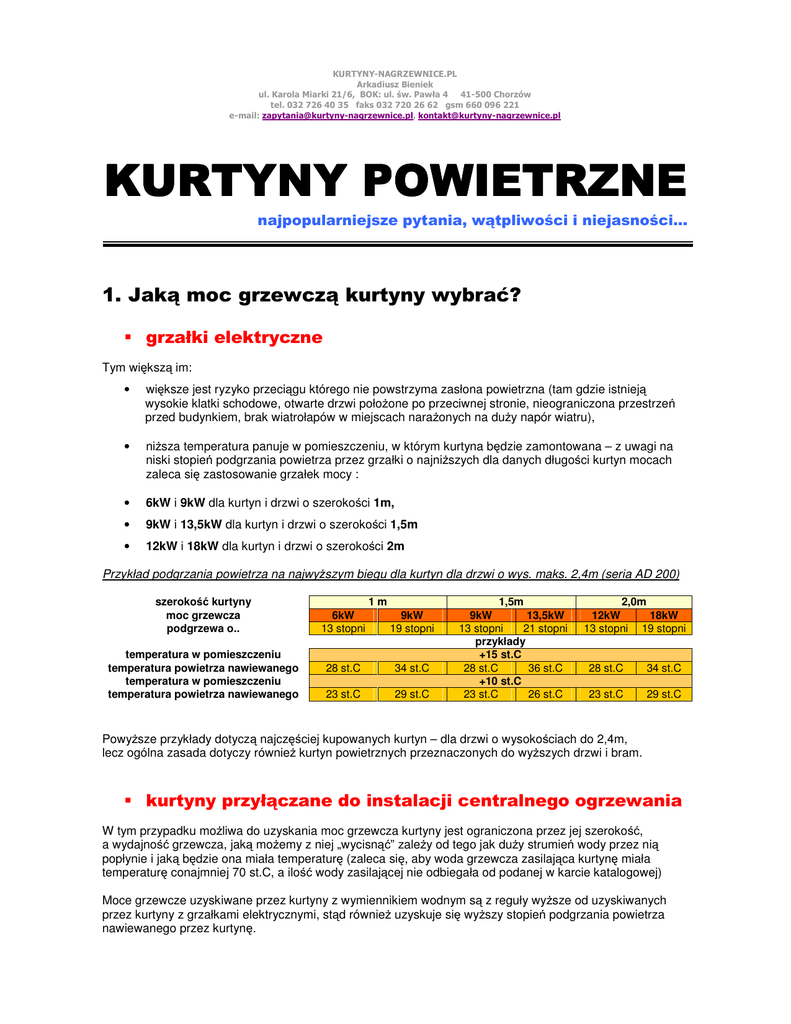 KURTYNY-NAGRZEWNICE.PL Arkadiusz Bieniek ul. Karola Miarki 21/6, BOK: ul. św. Pawła 4 41-500 Chorzów tel. 032 726 40 35 faks 032 720 26 62 gsm 660 096 221 e-mail: [email protected], [email protected] KURTYNY POWIETRZNE najpopularniejsze pytania, wątpliwości i niejasności... 1. Jaką moc grzewczą kurtyny wybrać? grzałki elektryczne Tym większą im: • większe jest ryzyko przeciągu którego nie powstrzyma zasłona powietrzna (tam gdzie istnieją wysokie klatki schodowe, otwarte drzwi położone po przeciwnej stronie, nieograniczona przestrzeń przed budynkiem, brak wiatrołapów w miejscach narażonych na duży napór wiatru), • niższa temperatura panuje w pomieszczeniu, w którym kurtyna będzie zamontowana – z uwagi na niski stopień podgrzania powietrza przez grzałki o najniższych dla danych długości kurtyn mocach zaleca się zastosowanie grzałek mocy : • 6kW i 9kW dla kurtyn i drzwi o szerokości 1m, • 9kW i 13,5kW dla kurtyn i drzwi o szerokości 1,5m • 12kW i 18kW dla kurtyn i drzwi o szerokości 2m Przykład podgrzania powietrza na najwyższym biegu dla kurtyn dla drzwi o wys. maks. 2,4m (seria AD 200) szerokość kurtyny moc grzewcza podgrzewa o.. temperatura w pomieszczeniu temperatura powietrza nawiewanego temperatura w pomieszczeniu temperatura powietrza nawiewanego 1m 6kW 13 stopni 9kW 19 stopni 28 st.C 34 st.C 23 st.C 29 st.C 1,5m 9kW 13,5kW 13 stopni 21 stopni przykłady +15 st.C 28 st.C 36 st.C +10 st.C 23 st.C 26 st.C 2,0m 12kW 18kW 13 stopni 19 stopni 28 st.C 34 st.C 23 st.C 29 st.C Powyższe przykłady dotyczą najczęściej kupowanych kurtyn – dla drzwi o wysokościach do 2,4m, lecz ogólna zasada dotyczy również kurtyn powietrznych przeznaczonych do wyższych drzwi i bram. kurtyny przyłączane do instalacji centralnego ogrzewania W tym przypadku możliwa do uzyskania moc grzewcza kurtyny jest ograniczona przez jej szerokość, a wydajność grzewcza, jaką możemy z niej „wycisnąć” zależy od tego jak duży strumień wody przez nią popłynie i jaką będzie ona miała temperaturę (zaleca się, aby woda grzewcza zasilająca kurtynę miała temperaturę conajmniej 70 st.C, a ilość wody zasilającej nie odbiegała od podanej w karcie katalogowej) Moce grzewcze uzyskiwane przez kurtyny z wymiennikiem wodnym są z reguły wyższe od uzyskiwanych przez kurtyny z grzałkami elektrycznymi, stąd również uzyskuje się wyższy stopień podgrzania powietrza nawiewanego przez kurtynę. KURTYNY-NAGRZEWNICE.PL Arkadiusz Bieniek ul. Karola Miarki 21/6, BOK: ul. św. Pawła 4 41-500 Chorzów tel. 032 726 40 35 faks 032 720 26 62 gsm 660 096 221 e-mail: [email protected], [email protected] Przykład podgrzania powietrza na najwyższym biegu dla kurtyn dla drzwi o wys. maks. 2,4m (seria AD 200) szerokość kurtyny temperatura wody grzewczej temperatura w pomieszczeniu temperatura powietrza nawiewanego temperatura w pomieszczeniu temperatura powietrza nawiewanego 1m 60 st.C 80 st.C 32 st.C 37 st.C 29 st.C 34 st.C 1,5m 60 st.C 80 st.C przykłady +20 st.C 32 st.C 37 st.C +15 st.C 29 st.C 34 st.C 2,0m 60 st.C 80 st.C 32 st.C 37 st.C 29 st.C 34 st.C 2. Kurtyna ma za słaby nawiew, dlaczego? W niektórych sytuacjach może dochodzić do zmniejszenia intensywności nawiewu powietrza z kurtyny: • w przypadku niezachowania zalecanych w instrukcji montażu odległości urządzenia od sufitu lub ścian bocznych – w tej sytuacji ograniczona zostaje przestrzeń, z której zasysane jest powietrze, należy wówczas odsunąć kurtynę od ścian/sufitu na odległość zalecaną w instrukcji, • w przypadku kurtyn przyłączanych do centralnego ogrzewania, które są wyposażone w filtr powietrza (zabezpiecza on wymiennik ciepła przez zapchaniem kurzem, pyłem – zmniejszeniem wydajności grzewczej, podgrzewaniem zbierających sie zanieczyszczeń) przyczyną ograniczenia nawiewu jest często zabrudzenie filtra, należy go po prostu wyczyścić (odkurzyć, umyć itp), jest to najczęściej spotykana sytuacja w dużych marketach, gdzie słychać wycie wentylatorów, nie odczuwa się natomiast zupełnie nawiewu, • zakrycie lub zasłonięcie kratki zasysającej, • dobrano kurtynę o zbyt małym zasięgu lub dobrano urządzenie „kurtynopodobne” nie spełniające wymagań co do zasięgu. 3. Kurtyna grzeje za słabo, dlaczego? kurtyny powietrzne z grzałkami elektrycznymi • dobrano zbyt niską moc grzewczą w zestawieniu z panującymi warunkami w pomieszczeniu, • kurtyna rozpoczyna pracę w niskiej temperaturze, np: o o o tuż po zakończeniu prac remontowych i adaptacyjnych, w pomieszczeniach nieogrzewanych (kurtyna nie jest urządzeniem przeznaczonym do ogrzewania pomieszczeń!), po zakończeniu weekendu lub przerwy świątecznej w warunkach „ekonomicznej” pracy instalacji ogrzewania lub jej całkowitym wyłączeniu. ZAPAMIĘTAJ! Grzałki elektryczne podgrzewają powietrze przy danym natężeniu nawiewu ZAWSZE o TAKĄ SAMĄ ILOŚĆ STOPNI, niezależnie od temperatury w pomieszczeniu. Temperatura powietrza na wylocie z kurtyny lub nagrzewnicy będzie zawsze zależeć od temperatury powietrza jakie to urządzenie zasysa. KURTYNY-NAGRZEWNICE.PL Arkadiusz Bieniek ul. Karola Miarki 21/6, BOK: ul. św. Pawła 4 41-500 Chorzów tel. 032 726 40 35 faks 032 720 26 62 gsm 660 096 221 e-mail: [email protected], [email protected] kurtyny powietrzne przyłączane do instalacji centralnego ogrzewania • • do kurtyny dopływa zbyt mało wody grzewczej: o kurtyna jest dołączona do istniejącej instalacji obsługiwanej przez pompę, której wydajność nie uwzględnia stosunkowo dużego przepływu wody wymaganego przez kurtynę – należy wówczas wykonać osobną pętlę wodną dla kurtyny z osobną obsługująca ją pompą, która zapewni wymagany przepływ, o instalacja nie jest zrównoważona, tzn. np do najdalej położonej od źródła ciepła kurtyny dopływa zbyt mało wody, a do blisko położonych grzejników – zbyt dużo – należy zastosow