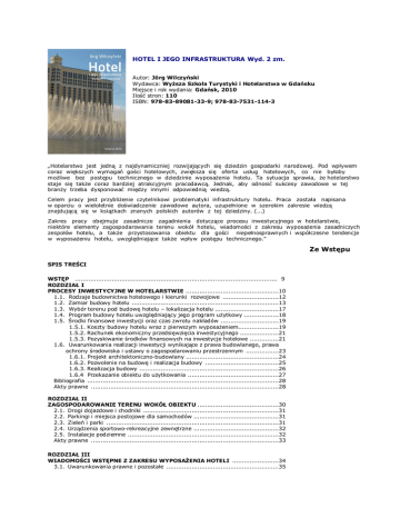 HOTEL I JEGO INFRASTRUKTURA Wyd. 2 zm. Autor: Jörg Wilczyński Wydawca: Wyższa Szkoła Turystyki i Hotelarstwa w Gdańsku Miejsce i rok wydania: Gdańsk, 2010 Ilość stron: 110 ISBN: 978-83-89081-33-9; 978-83-7531-114-3 „Hotelarstwo jest jedną z najdynamiczniej rozwijających się dziedzin gospodarki narodowej. Pod wpływem coraz większych wymagań gości hotelowych, zwiększa się oferta usług hotelowych, co nie byłoby możliwe bez postępu technicznego w dziedzinie wyposażenia hotelu. Ta sytuacja sprawia, że hotelarstwo staje się także coraz bardziej atrakcyjnym pracodawcą. Jednak, aby odnosić sukcesy zawodowe w tej branży trzeba dysponować między innymi odpowiednią wiedzą. Celem pracy jest przybliżenie czytelnikowi problematyki infrastruktury hotelu. Praca została napisana w oparciu o wieloletnie doświadczenie zawodowe autora, uzupełnione w szerokim zakresie wiedzą znajdującą się w książkach znanych polskich autorów z tej dziedziny. (...) Zakres pracy obejmuje zasadnicze zagadnienia dotyczące procesu inwestycyjnego w hotelarstwie, niektóre elementy zagospodarowania terenu wokół hotelu, wiadomości z zakresu wyposażenia zasadniczych zespołów hotelu, a także przystosowania obiektu dla gości niepełnosprawnych i współczesne tendencje w wyposażeniu hotelu, uwzględniające także wpływ postępu technicznego.” Ze Wstępu SPIS TREŚCI WSTĘP ........................................................................................................ 9 ROZDZIAŁ I PROCESY INWESTYCYJNE W HOTELARSTWIE ................................................10 1.1. Rodzaje budownictwa hotelowego i kierunki rozwojowe .............................12 1.2. Zamiar budowy hotelu ............................................................................13 1.3. Wybór terenu pod budowę hotelu – lokalizacja hotelu .................................17 1.4. Program budowy hotelu uwzględniający jego program użytkowy ..................18 1.5. Środki finansowe inwestycji oraz czas zwrotu nakładów ..............................19 1.5.1. Koszty budowy hotelu wraz z pierwszym wyposażeniem.....................19 1.5.2. Rachunek ekonomiczny przedsięwzięcia inwestycyjnego ....................21 1.5.3. Pozyskiwanie środków finansowych na inwestycje hotelowe ...............21 1.6. Uwarunkowania realizacji inwestycji wynikające z prawa budowlanego, prawa ochrony środowiska i ustawy o zagospodarowaniu przestrzennym .................23 1.6.1. Projekt architektoniczno-budowlany ................................................24 1.6.2. Pozwolenie na budowę i realizacja budowy ......................................25 1.6.3. Realizacja budowy ........................................................................26 1.6.4 Przekazanie obiektu do użytkowania ...............................................27 Bibliografia ...................................................................................................28 Akty prawne .................................................................................................28 ROZDZIAŁ II ZAGOSPODAROWANIE TERENU WOKÓŁ OBIEKTU ..........................................30 2.1. Drogi dojazdowe i chodniki ......................................................................31 2.2. Parkingi i miejsca postojowe dla samochodów ............................................31 2.3. Zieleń i parki .........................................................................................31 2.4. Urządzenia sportowo-rekreacyjne zewnętrzne ............................................32 2.5. Instalacje podziemne ..............................................................................32 Akty prawne .................................................................................................33 ROZDZIAŁ III WIADOMOŚCI WSTĘPNE Z ZAKRESU WYPOSAŻENIA HOTELI ........................34 3.1. Uwarunkowania prawne i pozostałe ..........................................................35 3.1.1. Uwarunkowania prawne .................................................................35 3.1.2. Uwarunkowania pozostałe ..............................................................36 3.2. Związki pomiędzy wyposażeniem a rodzajami hoteli ...................................37 3.3. Wpływ segmentu gości hotelowych na wyposażenie oraz zakres użytkowy zespołów funkcjonalnych hotelu .................................38 3.4. Zasadnicze wymagania stawiane elementom wyposażenia ...........................39 3.5. Standaryzacja w obiektach hotelarskich.................................................... 40 Bibliografia .................................................................................................. 41 Akty prawne .................................................................................................41 ROZDZIAŁ IV WYPOSAŻENIE HALLU HOTELOWEGO I RECEPCJI ..........................................42 4.1. Podstawowe funkcje zespołu hallu hotelowego i recepcji............................ 42 4.2. Główne zespoły węzła recepcyjnego ...........................................................42 4.3. Funkcje hallu recepcyjnego w obsłudze gości hotelowych i jego wyposażenie ..................................................................................43 4.4. Funkcje recepcji hotelowej i jej wyposażenie ..............................................44 Bibliografia ...................................................................................................46 Akty prawne .................................................................................................46 ROZDZIAŁ V WYPOSAŻENIE JEDNOSTEK MIESZKALNYCH ..................................................47 5.1 Typy i funkcje jednostek mieszkalnych .......................................................47 5.2. Wymagania stawiane elementom wyposażenia jednostek mieszkalnych .........48 5.3. Wyposażenie i aranżacja wnętrz jednostek mieszkal