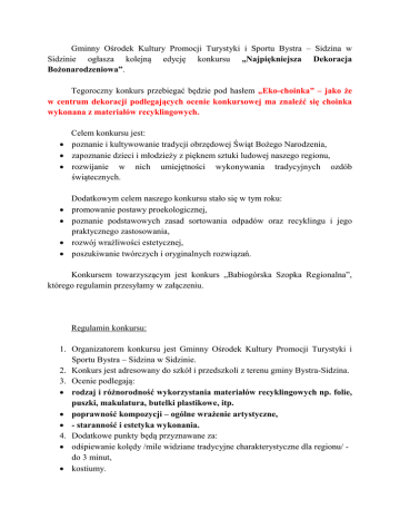 Gminny Ośrodek Kultury Promocji Turystyki i Sportu Bystra – Sidzina w Sidzinie ogłasza kolejną edycję konkursu „Najpiękniejsza Dekoracja Bożonarodzeniowa”. Tegoroczny konkurs przebiegać będzie pod hasłem „Eko-choinka” – jako że w centrum dekoracji podlegających ocenie konkursowej ma znaleźć się choinka wykonana z materiałów recyklingowych. Celem konkursu jest: poznanie i kultywowanie tradycji obrzędowej Świąt Bożego Narodzenia, zapoznanie dzieci i młodzieży z pięknem sztuki ludowej naszego regionu, rozwijanie w nich umiejętności wykonywania tradycyjnych ozdób świątecznych. Dodatkowym celem naszego konkursu stało się w tym roku: promowanie postawy proekologicznej, poznanie podstawowych zasad sortowania odpadów oraz recyklingu i jego praktycznego zastosowania, rozwój wrażliwości estetycznej, poszukiwanie twórczych i oryginalnych rozwiązań. Konkursem towarzyszącym jest konkurs „Babiogórska Szopka Regionalna”, którego regulamin przesyłamy w załączeniu. Regulamin konkursu: 1. Organizatorem konkursu jest Gminny Ośrodek Kultury Promocji Turystyki i Sportu Bystra – Sidzina w Sidzinie. 2. Konkurs jest adresowany do szkół i przedszkoli z terenu gminy Bystra-Sidzina. 3. Ocenie podlegają: rodzaj i różnorodność wykorzystania materiałów recyklingowych np. folie, puszki, makulatura, butelki plastikowe, itp. poprawność kompozycji – ogólne wrażenie artystyczne, - staranność i estetyka wykonania. 4. Dodatkowe punkty będą przyznawane za: odśpiewanie kolędy /mile widziane tradycyjne charakterystyczne dla regionu/ do 3 minut, kostiumy. 5. Komisja oceniająca sprawdzi dekoracje w dniu 20.12.2016r. tj. wtorek. 6.Placówki biorące udział w konkursie otrzymają pisemną informację o wynikach konkursu po przerwie świątecznej. 7. Ogłoszenie wyników i wręczenie nagród pieniężnych będzie miało miejsce w styczniu 2017r. Życzymy wszystkim uczestnikom konkursu pasjonującej i radosnej pracy przy tworzeniu bajkowej rzeczywistości, towarzyszącej nieodłącznie Świętom Bożego Narodzenia !!!