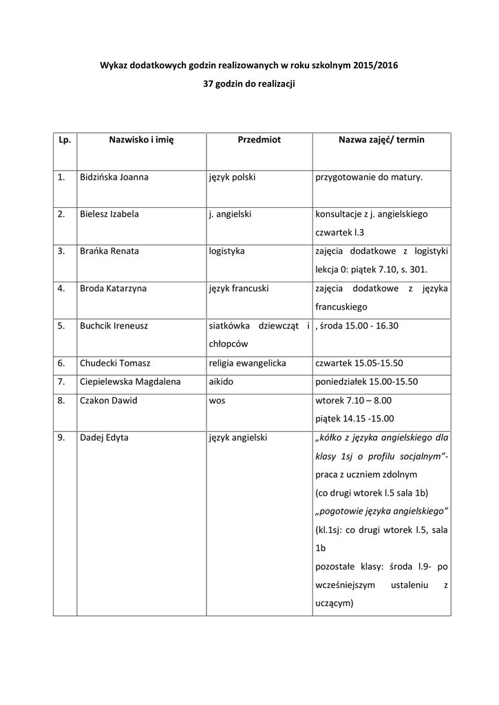 Wykaz dodatkowych godzin realizowanych w roku szkolnym 2015/2016 37 godzin do realizacji Lp. Nazwisko i imię Przedmiot Nazwa zajęć/ termin 1. Bidzińska Joanna język polski przygotowanie do matury. 2. Bielesz Izabela j. angielski konsultacje z j. angielskiego czwartek l.3 3. Brańka Renata logistyka zajęcia dodatkowe z logistyki lekcja 0: piątek 7.10, s. 301. 4. Broda Katarzyna język francuski zajęcia dodatkowe z języka francuskiego 5. Buchcik Ireneusz siatkówka dziewcząt i , środa 15.00 - 16.30 chłopców 6. Chudecki Tomasz religia ewangelicka czwartek 15.05-15.50 7. Ciepielewska Magdalena aikido poniedziałek 15.00-15.50 8. Czakon Dawid wos wtorek 7.10 – 8.00 piątek 14.15 -15.00 9. Dadej Edyta język angielski „kółko z języka angielskiego dla klasy 1sj o profilu socjalnym”praca z uczniem zdolnym (co drugi wtorek l.5 sala 1b) „pogotowie języka angielskiego” (kl.1sj: co drugi wtorek l.5, sala 1b pozostałe klasy: środa l.9- po wcześniejszym uczącym) ustaleniu z 10. Dabrowa Sylwia matematyka konsultacje z matematyki/ poniedziałek 1505-1550 11. Fober Krzysztof koło strzeleckie czwartek 13.30 – 15.30 12. Foltyn Rafał pgk, pai, wai grafika komputerowa / piątek 15.00 – 15.45 13. Gaś Kinga siatkówka dziewcząt i chłopców , środa 15.00 - 16.30 14. Gross Małgorzata zajęcia artystyczne, międzynarodowe spotkania z kulturą i sztuką, pon. 6l 15. Grygierek Małgorzata język polski przygotowanie do matury. przygotowanie do konkursów przedmiotowych. czwartek – lekcja 7 , czwartek – lekcja 9 16. Guzy Błażej wos/geog zajęcia dodatkowe z geografii i wosu środa 8:00 17. Herrman Przemysław wai, pai, utk, putk przygotowanie do kwalifikacji e.14 / piątek 15.05 18. Huczała Agnieszka język angielski matura z języka angielskiego – poziom podstawowy i rozszerzony. czwartek lekcja 7 19. Hussar Piotr fizyka pogotowie fizyczne; czwartek 15:00; inny termin uzgodnieniu po z zainteresowanymi 20. Jagiełło Tomasz religia poniedziałek 8.00 – 8.45 21. Klus Agata j. ang. zajęcia dodatkowe z języka angielskiego wtorek 8:00 22. Kozińska Barbara Internat – zaj. op. wych. czwartek 8.00-9.00 23. Kożusznik Danuta zajęcia wyrównawcze oprogramowanie wtorek l. 9 biurowe 24. Kuchejda Katarzyna bazy danych przygotowanie do kwalifikacji e.14. piątek 15:05-15:50 25. Kumor-Bednarczyk Teresa zajęcia opiekuńcze 26. Lehrich Anna czwartek 9:00-10:00 środa 14.10- 15.00 pogotowie matematyczne 27. Mikietyn Tomasz przedmioty zawodowe środa, czwartek 7:05-7:50 konsultacje do kwalifikacji e.12 e.13 28. Olszar Dariusz przedmioty zawodowe poniedziałek – piątek 7:05-7:50 konsultacje do kwalifikacji e.12 e.14 29. Panek Agnieszka język niemiecki kółko języka niemieckiego, piątek. l.1 30. Pawlak Elżbieta Język polski wtorek 12.35, czwartek 8.00 (2 godz.), piątek- 8.50 przygotowanie do matury i praca z ucz. słabym 31. Pawlak Janusz jęz.polski poniedziałek, 1, 2 lekcja, czwartek, 7, 8 lekcja 32. Plisz Sławomir zajęcia dodatkowe z wtorek 15.00 – 15.45 przedmiotów zawodowych 33. Puczok Joachim koszykówka dziewcząt i chłopców poniedziałek 15.00 - 16.30 34. Romanowska Barbara pogotowie wtorek 800-845 matematyczne 35. Romanowski Mariusz zajęcia dodatkowe z utk czwartki, godz: 14:45-15:00 i putk 36. Skałuba Mariusz logistyka, środa 14;10 sala 201 szkolny przedsiębiorczość klub przedsiębiorczości 37. Stwora Rafał religia kat. przygotowanie do konkursu jonasz / czwartek 1505-1550 38. Szlachta Barbara język angielski english is cool, czwartek 7 l./piątek 2l. 39. Szymanek Damian przedmioty zawodowe - zajecia logistyczne przdmiotów dodatkowe z logistycznych środa godz, 7:10- 7:55, – sala 300 40. Szwed Beata chemia zajęcia dodatkowe z chemii. wtorek 9 lekcja 41. Twardowska Mariola zajęcia opiekuńczo środa 800-845 wychowawcze 42. Wawrzyczek Michał historia i społeczeństwo konsultacje/ przygotowanie do matury. środa 8.00-8.45 43. Welc Piotr historia i społeczeństwo zajęcia dodatkowe: przygotowanie do konkursów, praca z uczniem zdolnym oraz słabym/czwartek l.8 – 14.15 44. Weres Martyna zajęcia wychowawcze w wtorek 8.00 - 9.00 internacie, 45. Wocko-Krupska Danuta język niemiecki 46. Żurawska Urszula zajęcia opiekuńczo- poniedziałek 8.00-9.00 wychowawcze internacie poniedziałek 14.15-15.00 w