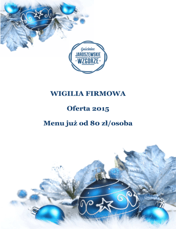 WIGILIA FIRMOWA Oferta 2015 Menu już od 80 zł/osoba WIGILIA 2015 Propozycja I 80,00 zł/netto/ osoba I. Zupa Staropolski barszcz z uszkami II. Drugie danie Pierogi z kapustą i grzybami Dzwonki karpia smażone na maśle Ziemniaki opiekane w ziołach III. Na zimno Sałatka ziemniaczana ze śledziem i buraczkami Galaretki rybne z marchewką i koperkiem Fileciki rybne w złotym cieście Śledź w oliwie Pieczywo IV. Na słodko Makowiec Ciastka piernikowe V. Napoje Kompot z suszonych owoców Kawa, herbata, woda w dzbankach Cena obejmuje - wynajem lokalu do 75 osób - dania serwowane do stołów lub w formie bufetu szwedzkiego - dekorację stołu z akcentami świątecznymi - obsługę kelnerską WIGILIA 2015 Propozycja II 100,00 zł/ netto/osoba I. Przystawka Placuszki z cukinii z pastą koperkową i wędzonym łososiem II. Zupa Staropolski barszcz z uszkami III. Drugie danie Pierogi z kapustą i grzybami Sandacz w sosie kurkowym Zraz z karkówki Ryż z warzywami Pieczone ziemniaczki IV. Na zimno Galaretki rybne z marchewką i koperkiem Śledź pod pierzynką Kremowa roladka ze szpinakiem i łososiem Sałatka ziemniaczana ze śledziem i buraczkami Schabik parzony ze śliwką V. Na słodko Sernik/Makowiec Ciastka piernikowe VI. Napoje Kompot z suszonych owoców Kawa, herbata, woda w dzbankach Cena obejmuje - wynajem lokalu do 75 osób - dania serwowane do stołów lub w formie bufetu szwedzkiego - dekorację stołu z akcentami świątecznymi - obsługę kelnerską WIGILIA 2015 Propozycja III 130,00 zł/ netto/osoba I. Przystawka Tatar ze śledzia na buraczanych plastrach II. Zupa Rybna/ Borowikowa III. Drugie danie Pierogi z kapustą i grzybami Sandacz z patelni w sosie kaparowo-cytrynowym Filet z kaczki w sosie śliwkowym Pieczone ziemniaczki Zestaw surówek IV. Na zimno Galaretki rybne z marchewką i koperkiem Śledź w trzech smakach Kremowa roladka ze szpinakiem i łososiem Sałatka ziemniaczana ze śledziem i buraczkami Schabik parzony ze śliwką Dechy z wiejskimi wędlinami Pieczywo V. Na słodko Sernik/Makowiec/Babka czekoladowa z orzechami Ciastka piernikowe VI. Napoje Kompot z suszonych owoców Kawa, herbata, woda w dzbankach Cena obejmuje - wynajem lokalu do 75 osób - dania serwowane do stołów lub w formie bufetu szwedzkiego - dekorację stołu z akcentami świątecznymi - obsługę kelnerską Przedstawiona oferta stanowi jedynie propozycję. Na Państwa życzenie skomponujemy indywidualne menu. Kontakt: Gościniec Jaroszewskie Wzgórze Grobia 60, 64-410 Sieraków tel. 609-331-332 e-mail: [email protected] www.jaroszewskiewzgorze.pl