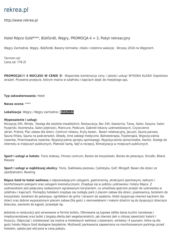 rekrea.pl http://www.rekrea.pl Hotel Répce Gold****, Bükfürdõ, Węgry, PROMOCJA 4 = 3, Pobyt rekreacyjny Węgry Zachodnie, Węgry. Bükfürdõ, Baseny termalne, relaks i rodzinne wakacje . Wczasy 2016 na Węgrzech. Terminn od: Cena od: 778 Zł PROMOCJA!!! 4 NOCLEGI W CENIE 3! Wspaniała kombinacja ceny i jakości usług! WYSOKA KLASA! Kapielisko wrażeń. Prywatne przejscie, którym można w szlafroku i kapciach dojść do miejskiego spa. Typ zakwaterowania: Hotel Nasza ocena: **** Lokalizacja: Węgry / Węgry zachodnie / Bükfürdö Wyposażenie i usługi: Recepcja 24h, Winda, Dostęp dla wózków inwalidzkich, Restauracja, Bar 24h, Kawiarnia, Taras, Salon, Kasyno, Salon fryzjerski, Kosmetyka, Salon piękności, Manicure, Pedicure, Gabinet lekarzy uzdrowiskowych, Czyszczenie ubrań, Pralnia, Plac zabaw dla dzieci, Centrum relaksu, Kryty basen, Basen relaksacyjny, Jacuzzi, Sauna parowa, Sauna fińska, Sauna na podczerwień, Okłady, Inne zabiegi medyczne, Balneoterapia, Fizjoterapia, Wypożyczalnia rowerów, Przechowalnia rowerów, Wypożyczalnia sprzętu sportowego, Wypożyczalnia samochodów, Kantor, Dostęp do internetu w miejscach publicznych, Płatność kartą, Sejf w recepcji, Klimatyzacja w miejscach publicznych. Sport i usługi w hotelu: Tenis stołowy, Fitness centrum, Boisko do koszykówki, Boisko do petanque, Strzałki, Bilard, Masaże Sport i usługi w najbliższej okolicy: Tenis, Siatkówka plażowa, Cyklistyka, Golf, Minigolf, Basen dla dzieci ze zjeżdżalniami, Bowling Répce Gold to hotel wellness z odpowiadającymi usługami, gastronomią, atrakcjami sportowymi, ładnymi i komfortowymi pokojami oraz usługami kosmetycznymi. Znajduje się w pobliżu uzdrowiska i hotelu Répce. Z uzdrowiskiem jest połączony zadaszonym ogrzewanym korytarzem, co umożliwia gościom przejść do uzdrowiska w szlafroku i kapciach. Pomiędzy hotelami znajduje się rozległy park z placem zabaw dla dzieci, piaskownicą, boiskiem do koszykówki, boiskiem do petanque, ogródkiem do grilla i tarasem do opalania. Hotel dysponuje również kącikiem dla dzieci oraz dobrze wyposażonym placem zabaw.Dla gości z niemowlakami i małymi dziećmi są do dyspozycji dziecięce łóżeczka, wanienki do kąpieli, przewijak itp. Jedzenie w restauracji jest serwowane w formie bufetu. Oferowane są typowe obfite dania kuchni narodowej i międzynarodowej oraz bufet z bogatą ofertą dań wegetariańskich, jak również dań o niższej zawartości kalorii i tłuszczu. Odpocząć i zrelaksować się można w hotelowych wellness z basenami, wirówką i 4 saunami, które są dla gości hotelu Répce Gold dostępne bezpłatnie. Możliwość parkowania zapewniona na monitorowanym parkingu przed hotelem, opłata jest wliczona w cenę pobytu. Répce Gold polecamy tym, którzy szukają spokoju, relaksu i komfortu. Wiosna, jesień i zima są idealnym porami roku dla seniorów i par. Ceny są niższe, a uzdrowiska nie są zatłoczone. Letnie miesiące to idealny czas dla rodzin z dziećmi. Rozrywkowe programy sportowe, kwizy rodzinne oraz zajęcia w przyrodzie sprawią, że Twoja rodzina powróci do domu z niezapomnianymi wrażeniami. Zniżka First Moment przez cały rok: 8% za zamówienie pobytu 60 dni przed przyjazdem 3% za zamowienie pobytu 30 dni przed przyjazdem PROMOCJA 3=2 2.1. – 31.1.2016 oraz 1.12. – 20.12. 2016 PROMOCJA 4=3 2.1. – 1.4. 2016 oraz 20.11. - 20.12.2016 PROMOCJA 7=6 przez cały rok, oprócz wakacji (1.7. -31.8.2016) PROMOCJA SPECIALNA DLA SENIORÓW – 2.1. – 28.2. 2016 oraz 1.12. – 20.12. 2016 – cena 770 zł dotyczy tylko pokoju jednoosobowego! Notatka Zalecamy zakup kompleksowego ubezpieczenia turystycznego, w tym ubezpieczenia rezygnacji z podróży za obniżoną cenę. Cena obejmuje 4x zakwaterowanie, 4x HB (śniadania i obiadokolacje w formie bufetu), codzienny wolny wstęp do łaźni Bük, bezpłatne korzystanie z wellness, udział w programach sportowych, wypożyczenie szlafroka, opłatę za parking, obowiązkowe ubezpieczenie biur podróży. Cena nie obejmuje podatku turystycznego 410 HUF (cca 1,7 €) za osobę w wieku od 18 lat / noc