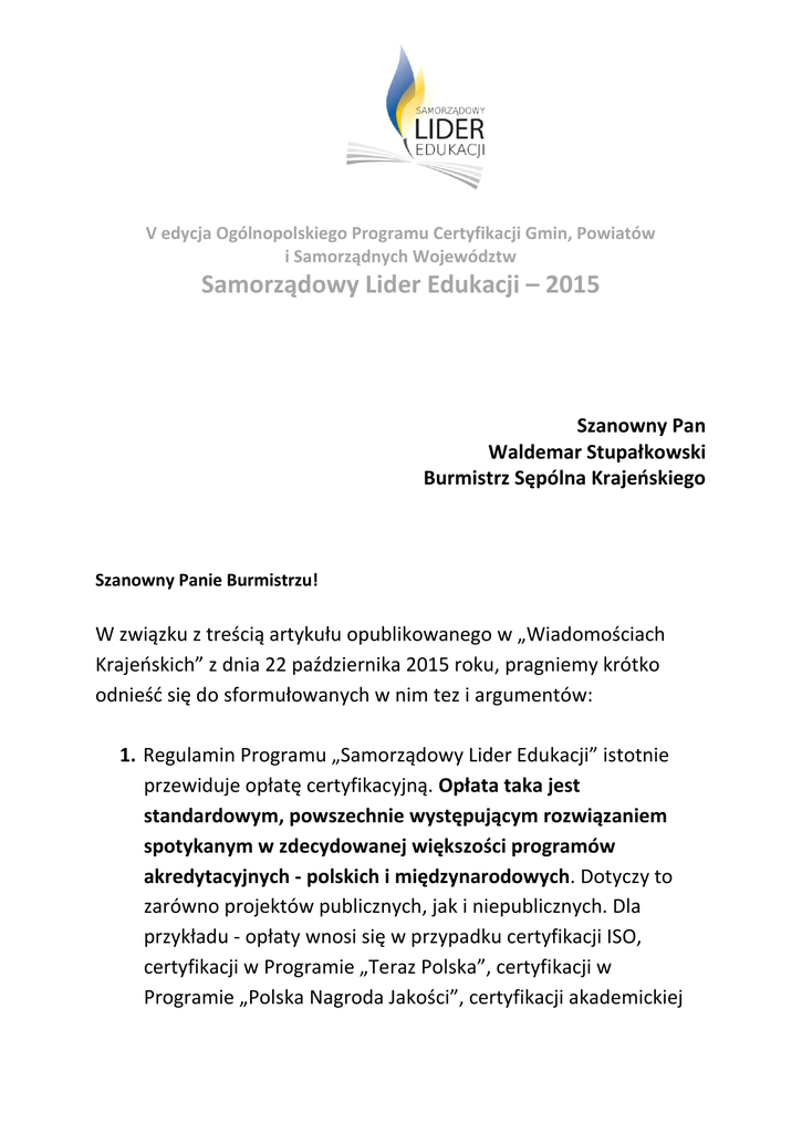 V edycja Ogólnopolskiego Programu Certyfikacji Gmin, Powiatów i Samorządnych Województw Samorządowy Lider Edukacji – 2015 Szanowny Pan Waldemar Stupałkowski Burmistrz Sępólna Krajeńskiego Szanowny Panie Burmistrzu! W związku z treścią artykułu opublikowanego w „Wiadomościach Krajeńskich” z dnia 22 października 2015 roku, pragniemy krótko odnieść się do sformułowanych w nim tez i argumentów: 1. Regulamin Programu „Samorządowy Lider Edukacji” istotnie przewiduje opłatę certyfikacyjną. Opłata taka jest standardowym, powszechnie występującym rozwiązaniem spotykanym w zdecydowanej większości programów akredytacyjnych - polskich i międzynarodowych. Dotyczy to zarówno projektów publicznych, jak i niepublicznych. Dla przykładu - opłaty wnosi się w przypadku certyfikacji ISO, certyfikacji w Programie „Teraz Polska”, certyfikacji w Programie „Polska Nagroda Jakości”, certyfikacji akademickiej SEM FORUM czy akredytacji Uniwersyteckiej Komisji Akredytacyjnej (dla szkół wyższych). Opłatę przewidują akredytacje kuratoriów oświaty dla placówek szkoleniowych czy certyfikacje Polskiego Centrum Akredytacji (jednostki państwowe). Opłaty regulaminowe występują ponadto w akredytacjach międzynarodowych, w tym m.in. w najbardziej prestiżowych programach akredytacyjnych dla uczelni (AACSB International) czy akredytacjach trenerów biznesu (International Coaching Federation). Każda osoba posiadająca nawet podstawową wiedzę na temat problematyki zarządzania jakością oraz systemów monitorowania i potwierdzania jakości ma świadomość odpłatnego charakteru postępowań akredytacyjnych i rozumie, jakie są tego przyczyny (rzetelnie przeprowadzona, wieloelementowa certyfikacja wymaga znaczących nakładów finansowych) – rozwiązanie takie jest powszechnie znane i akceptowane w środowisku praktyków zarządzania. Akredytacje (certyfikacje) środowiskowe, a do takich należy projekt „Samorządowy Lider Edukacji”, nie korzystają z dotacji publicznych – realizowane są przez organizacje pozarządowe lub instytucje branżowe. Program „Samorządowy Lider Edukacji” w części merytorycznej finansowany jest w większości ze środków Fundacji Rozwoju Edukacji i Szkolnictwa Wyższego. Natomiast pozostała część kosztów projektu pokrywana jest z opłat certyfikacyjnych wnoszonych przez podmioty certyfikowane. 2. Opłata certyfikacyjna określona w Regulaminie Programu „Samorządowy Lider Edukacji” przeznaczana jest m.in. na sfinansowanie następujących kosztów Programu: koszty związane z audytem formalnym aplikacji zgłoszonych do Programu, koszty związane z obsługą ewentualnych wyjazdów audytorskich (np. koszty podróży i zakwaterowania recenzentów oceniających gminy/powiaty), koszty związane z prowadzeniem stałego monitoringu jakości w certyfikowanych samorządach w okresie obowiązywania certyfikatu (12 miesięcy) – po otrzymaniu certyfikatu przez rok specjalny zespół audytorów monitoruje jakość polityki oświatowej w certyfikowanym samorządzie i weryfikuje, czy nie dochodzi tam do działań, które winny skutkować cofnięciem/zawieszeniem certyfikatu, koszty organizacyjne związane z przygotowaniem Gali Finałowej Programu, koszty pracy Biura Programu, koszty związane z promocją i obsługą public relations Programu (np. serwis fotograficzny, przygotowanie materiałów prasowych itp.), koszty produkcji certyfikatów i pamiątkowych statuetek. 3. Jako Organizatorzy Programu staramy się ograniczać do niezbędnego minimum wysokość opłaty certyfikacyjnej. Warto podkreślić, że jesteśmy jednym z nielicznych programów akredytacyjnych dla samorządów, w których nie obowiązują żadne opłaty weryfikacyjne (wstępne) warunkujące możliwość udziału w postępowaniu certyfikacyjnym. W wielu analogicznych programach akredytacyjnych opłaty wnoszone są już na początku procedury – warunkiem uruchomienia procesu oceny jest wniesienie opłaty przez podmiot poddający się audytowi. Budzi to kontrowersje – wniesienie opłaty z góry może powodować, iż podmiot certyfikujący działa niejako „pod presją” wniesionej opłaty, co może wywoływać zastrzeżenia odnośnie do bezstronności i niezawisłości oceny. W Programie „Samorządowy Lider Edukacji” wprowadzono inne rozwiązanie – opłata wnoszona jest dopiero po zakończeniu procedury certyfikacyjnej. Taki model pozwala zdecydowanie oddzielić wymiar merytoryczny certyfikacji i oceny samorządu (nie wymagający wnoszenia opłat i obejmujący wszystkich uczestników Programu) od wymiaru organizacyjnego, marketingowego i ewaluacyjnego (który wiąże się z koniecznością wniesienia opłaty, ale dotyczy włącznie podmiotów, które uzyskały certyfikat). 4. Certyfikacja w Programie „Samorządowy Lider Edukacji” jest wieloelementowa i kilkuetapowa. Polityka oświatowa samorządów poddawana jest niezwykle szczegółowej analizie Komisji. Ocena każdej gminy czy powiatu trwa około trzech miesięcy. Etapem pierwszym jest OCENA FORMALNA, w toku której Organizator sprawdza poprawność wypełnienia dokumentów oraz aspekty formalno-prawne działalności gmin/powiatów. Kluczowym etapem certyfikacji jest etap drugi, czyli OCENA MERYTORYCZNA. W ramach tego etapu każdą gminę/powiat ocenia niezależnie od siebie 2 członków Komisji. Ich ocena odbywa się między innymi na podstawie: raportów samooceny przygotowanych przez samorządy, informacji pozyskanych z instytucji publicznych, informacji pozyskanych od środowisk lokalnych, informacji z placówek oświatowych, dla których gmina/powiat jest organem prowadzącym, danych Systemu Informacji Oświatowej, danych instytucji nadzoru i kontroli, analizy aktów prawa miejscowego, analizy przekazów medialnych, analizy wyników nauczania w szkołach prowadzonych przez samorząd, badań społecznych prowadzonych w toku certyfikacji itd. Recenzenci mogą również zapoznawać s