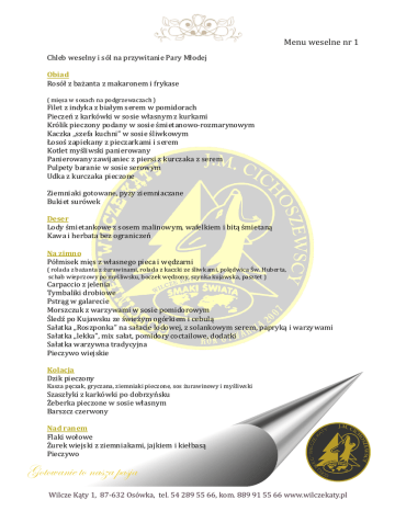Menu weselne nr 1 Chleb weselny i sól na przywitanie Pary Młodej Obiad Rosół z bażanta z makaronem i frykase ( mięsa w sosach na podgrzewaczach ) Filet z indyka z białym serem w pomidorach Pieczeń z karkówki w sosie własnym z kurkami Królik pieczony podany w sosie śmietanowo-rozmarynowym Kaczka „szefa kuchni” w sosie śliwkowym Łosoś zapiekany z pieczarkami i serem Kotlet myśliwski panierowany Panierowany zawijaniec z piersi z kurczaka z serem Pulpety baranie w sosie serowym Udka z kurczaka pieczone Ziemniaki gotowane, pyzy ziemniaczane Bukiet surówek Deser Lody śmietankowe z sosem malinowym, wafelkiem i bitą śmietaną Kawa i herbata bez ograniczeń Na zimno Półmisek mięs z własnego pieca i wędzarni ( rolada z bażanta z żurawinami, rolada z kaczki ze śliwkami, polędwica Św. Huberta, schab wieprzowy po myśliwsku, boczek wędzony, szynka kujawska, pasztet ) Carpaccio z jelenia Tymbaliki drobiowe Pstrąg w galarecie Morszczuk z warzywami w sosie pomidorowym Śledź po Kujawsku ze świeżym ogórkiem i cebulą Sałatka „Roszponka” na sałacie lodowej, z solankowym serem, papryką i warzywami Sałatka „lekka”, mix sałat, pomidory coctailowe, dodatki Sałatka warzywna tradycyjna Pieczywo wiejskie Kolacja Dzik pieczony Kasza pęczak, gryczana, ziemniaki pieczone, sos żurawinowy i myśliwski IE IN CZ E IL W KĄ T Y GO ŚC Wilcze Kąty 1, 87-632 Osówka, tel. 54 289 55 66, kom. 889 91 55 66 www.wilczekaty.pl ZEWSCY C ’ ’ WI LCZE OS Gotowanie to nasza pasja J.M. C IC Y” ĄT H Nad ranem Flaki wołowe Żurek wiejski z ziemniakami, jajkiem i kiełbasą Pieczywo K Szaszłyki z karkówki po dobrzyńsku Żeberka pieczone w sosie własnym Barszcz czerwony