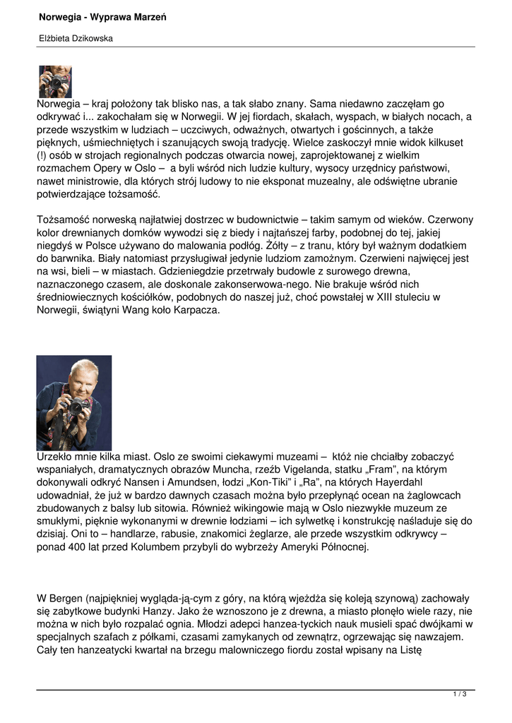 Norwegia - Wyprawa Marzeń Elżbieta Dzikowska Norwegia – kraj położony tak blisko nas, a tak słabo znany. Sama niedawno zaczęłam go odkrywać i... zakochałam się w Norwegii. W jej fiordach, skałach, wyspach, w białych nocach, a przede wszystkim w ludziach – uczciwych, odważnych, otwartych i gościnnych, a także pięknych, uśmiechniętych i szanujących swoją tradycję. Wielce zaskoczył mnie widok kilkuset (!) osób w strojach regionalnych podczas otwarcia nowej, zaprojektowanej z wielkim rozmachem Opery w Oslo – a byli wśród nich ludzie kultury, wysocy urzędnicy państwowi, nawet ministrowie, dla których strój ludowy to nie eksponat muzealny, ale odświętne ubranie potwierdzające tożsamość. Tożsamość norweską najłatwiej dostrzec w budownictwie – takim samym od wieków. Czerwony kolor drewnianych domków wywodzi się z biedy i najtańszej farby, podobnej do tej, jakiej niegdyś w Polsce używano do malowania podłóg. Żółty – z tranu, który był ważnym dodatkiem do barwnika. Biały natomiast przysługiwał jedynie ludziom zamożnym. Czerwieni najwięcej jest na wsi, bieli – w miastach. Gdzieniegdzie przetrwały budowle z surowego drewna, naznaczonego czasem, ale doskonale zakonserwowanego. Nie brakuje wśród nich średniowiecznych kościółków, podobnych do naszej już, choć powstałej w XIII stuleciu w Norwegii, świątyni Wang koło Karpacza. Urzekło mnie kilka miast. Oslo ze swoimi ciekawymi muzeami – któż nie chciałby zobaczyć wspaniałych, dramatycznych obrazów Muncha, rzeźb Vigelanda, statku „Fram”, na którym dokonywali odkryć Nansen i Amundsen, łodzi „Kon-Tiki” i „Ra”, na których Hayerdahl udowadniał, że już w bardzo dawnych czasach można było przepłynąć ocean na żaglowcach zbudowanych z balsy lub sitowia. Również wikingowie mają w Oslo niezwykłe muzeum ze smukłymi, pięknie wykonanymi w drewnie łodziami – ich sylwetkę i konstrukcję naśladuje się do dzisiaj. Oni to – handlarze, rabusie, znakomici żeglarze, ale przede wszystkim odkrywcy – ponad 400 lat przed Kolumbem przybyli do wybrzeży Ameryki Północnej. W Bergen (najpiękniej wyglądającym z góry, na którą wjeżdża się koleją szynową) zachowały się zabytkowe budynki Hanzy. Jako że wznoszono je z drewna, a miasto płonęło wiele razy, nie można w nich było rozpalać ognia. Młodzi adepci hanzeatyckich nauk musieli spać dwójkami w specjalnych szafach z półkami, czasami zamykanych od zewnątrz, ogrzewając się nawzajem. Cały ten hanzeatycki kwartał na brzegu malowniczego fiordu został wpisany na Listę 1/3 Norwegia - Wyprawa Marzeń Elżbieta Dzikowska Światowego Dziedzictwa Kulturowego i Przyrodniczego UNESCO. Wraz z moją towarzyszką podróży dotarłam kolejką linową na szczyt górujący nad Tromsø, miastem położonym na wyspie, 300 km za kołem podbiegunowym. Stamtąd fotografowałyśmy panoramę miasta już po północy, bo noc była wówczas biała i przedziwna: z jednej strony słońce jeszcze nie zakończyło swej wędrówki po niebie, a z drugiej już zdawało się wschodzić. Z Tromsø wypływa się na fotograficzne safari, ale walenie – uprzedzam – nie zawsze chcą pozować. Radzę raczej wybrać się na wyspę Summerey, gdzie można zobaczyć renifery. Najwięcej hodują Lapończycy, a właściwie Samowie, bo tak właśnie wolą się nazywać. To niesłychanie dumny naród – oni pierwsi zasiedlili Norwegię, zanim przybyli tu wikingowie, wywodzący się głównie z plemion germańskich. Oni pierwsi używali nart, spopularyzowanych w Norwegii dopiero pod koniec XIX w. Był czas, kiedy ich tożsamość wydawała się zagrożona, ale potrafili o nią walczyć, co potwierdzają choćby zdjęcia i eksponaty w Muzeum Regionalnym w Tromsø. Powstało tu także Muzeum Polarnictwa i nic w tym dziwnego, bo stąd właśnie wyruszały wszystkie wyprawy polarne z Nansenem i Amundsenem, którzy w Tromsø kompletowali załogę i żywność. Na uwagę zasługuje również naukowa stacja polarna, sprawująca pieczę nad Polarią – ciekawy architektonicznie budynek, gdzie można podziwiać ryby polarne, a także pokazy karmienia fok. Te inteligentne zwierzęta udowadniają, że przez żołądek trafia się nie tylko do serca, ale i do umysłu. Skoro mowa o żołądku, pora pochwalić norweskie jedzenie. Dla smakoszy ryb – a do nich należę – to, powiadając banalnie, raj. Świeże, suszone, morskie, z jezior – palce lizać, kiedy znajdą się na talerzu. Znany doskonale łosoś norweski w swojej ojczyźnie jest jeszcze bardziej smakowity niż u nas. Poza tym halibut, żabnica, okoń, karmazyn i pyszny wieloryb! Nie gardziłam też świetnie przyrządzanymi owocami morza, a dla odmiany degustowałam również pyszną, zwłaszcza na Lofotach, jagnięcinę, w Bergen zaś pieczeń. Nie stroniłam też od befsztyków z renifera. Gdyby istniały wczasy gastronomiczne, to na pewno w ich czołówce znalazłyby się turnusy w Norwegii, bo jedzenie tam jest nie tylko smaczne, ale i zdrowe. Zdrowe jedzenie – bo zdrowe środowisko. Czyste powietrze, woda, ziemia. Człowiek uzależniony od natury, żyjący z nią w zgodzie, darzący ją szacunkiem. Otaczający też szacunkiem drugiego człowieka, niezależnie od tego, skąd pochodzi, jaki ma kolor skóry, jakich czci bogów. Dobrze czują się w Norwegii Polacy, docenia się ich pracę; w Tromsø naszym norweskim przewodnikiem był czarnoskóry Kenijczyk, w Oslo ekskluzywny hotel prowadziła Meksykanka, która poślubiła Szweda, w Bergen za potomka wikingów wzięłam Niemca. Wieloetniczność staje się zjawiskiem coraz bardziej naturalnym. Przyjaźnie wita się tutaj turystów, którzy mają co oglądać, co robić, gdzie odpoczywać. W 2/3 Norwegia - Wyprawa Marzeń Elżbieta Dzikowska Norwegii polecałabym przede wszystkim odpoczynek czynny, jako że w kraju, który jest potęgą narciarską, są wspaniałe warunki do uprawiania sportów zimowych na