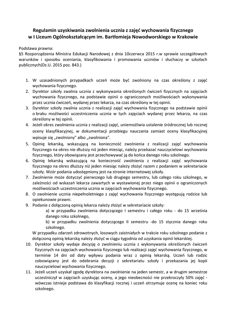 Regulamin uzyskiwania zwolnienia ucznia z zajęć wychowania fizycznego w I Liceum Ogólnokształcącym im. Bartłomieja Nowodworskiego w Krakowie Podstawa prawna: §5 Rozporządzenia Ministra Edukacji Narodowej z dnia 10czerwca 2015 r.w sprawie szczegółowych warunków i sposobu oceniania, klasyfikowania i promowania uczniów i słuchaczy w szkołach publicznych(Dz.U. 2015 poz. 843.) 1. W uzasadnionych przypadkach uczeń może być zwolniony na czas określony z zajęć wychowania fizycznego. 2. Dyrektor szkoły zwalnia ucznia z wykonywania określonych ćwiczeń fizycznych na zajęciach wychowania fizycznego, na podstawie opinii o ograniczonych możliwościach wykonywania przez ucznia ćwiczeń, wydanej przez lekarza, na czas określony w tej opinii. 3. Dyrektor szkoły zwalnia ucznia z realizacji zajęć wychowania fizycznego na podstawie opinii o braku możliwości uczestniczenia ucznia w tych zajęciach wydanej przez lekarza, na czas określony w tej opinii. 4. Jeżeli okres zwolnienia ucznia z realizacji zajęć, uniemożliwia ustalenie śródrocznej lub rocznej oceny klasyfikacyjnej, w dokumentacji przebiegu nauczania zamiast oceny klasyfikacyjnej wpisuje się „zwolniony” albo „zwolniona”. 5. Opinię lekarską, wskazującą na konieczność zwolnienia z realizacji zajęć wychowania fizycznego na okres nie dłuższy niż jeden miesiąc, należy przekazać nauczycielowi wychowania fizycznego, który obowiązany jest przechowywać ją do końca danego roku szkolnego. 6. Opinię lekarską wskazującą na konieczność zwolnienia z realizacji zajęć wychowania fizycznego na okres dłuższy niż jeden miesiąc należy złożyć razem z podaniem w sekretariacie szkoły. Wzór podania udostępniony jest na stronie internetowej szkoły. 7. Zwolnienie może dotyczyć pierwszego lub drugiego semestru, lub całego roku szkolnego, w zależności od wskazań lekarza zawartych w wystawionej przez niego opinii o ograniczonych możliwościach uczestniczenia ucznia w zajęciach wychowania fizycznego. 8. O zwolnienie ucznia niepełnoletniego z zajęć wychowania fizycznego występują rodzice lub opiekunowie prawni. 9. Podanie z dołączoną opinią lekarza należy złożyć w sekretariacie szkoły: a) w przypadku zwolnienia dotyczącego I semestru i całego roku - do 15 września danego roku szkolnego, b) w przypadku zwolnienia dotyczącego II semestru -do 15 stycznia danego roku szkolnego. W przypadku zdarzeń zdrowotnych, losowych zaistniałych w trakcie roku szkolnego podanie z dołączoną opinią lekarską należy złożyć w ciągu tygodnia od uzyskania opinii lekarskiej. 10. Dyrektor szkoły wydaje decyzję o zwolnieniu ucznia z wykonywania określonych ćwiczeń fizycznych na zajęciach wychowania fizycznego lub realizacji zajęć wychowania fizycznego, w terminie 14 dni od daty wpływu podania wraz z opinią lekarską. Uczeń lub rodzic zobowiązany jest do odebrania decyzji z sekretariatu szkoły i przekazania jej kopii nauczycielowi wychowania fizycznego. 11. Jeżeli uczeń uzyskał zgodę dyrektora na zwolnienie na jeden semestr, a w drugim semestrze uczestniczył w zajęciach uzyskując oceny, a jego nieobecności nie przekroczyły 50% zajęć wówczas istnieje podstawa do klasyfikacji rocznej i uczeń otrzymuje ocenę na koniec roku szkolnego. 12. Jeżeli uczeń uzyskał zgodę dyrektora na zwolnienie na jeden semestr, a w drugim semestrze powinien uczestniczyć w zajęciach uzyskując oceny, jednak jego nieobecności przekroczyły 50% zajęć i nie ma podstawy do wystawienia oceny, to uczeń jest nieklasyfikowany i może przystąpić do egzaminu klasyfikacyjnego. Egzamin klasyfikacyjny z wychowania fizycznego ma przede wszystkim formę praktyczną. W przypadku, gdy uczeń nie może wykonać praktycznych zadań w czasie egzaminu, co jest potwierdzone zaświadczeniem lekarskim, zdaje egzamin w formie pisemnej i ustnej. Egzamin klasyfikacyjny przeprowadza się nie później niż w dniu poprzedzającym dzień zakończenia rocznych zajęć dydaktycznowychowawczych. 13. Uczeń zwolniony z realizacji zajęć wychowania fizycznego ma obowiązek być obecnym na tych zajęciach. Gdy lekcje wychowania fizycznego są pierwszymi lub ostatnimi zajęciami w danym dniu, uczeń może być zwolniony z tego obowiązku na podstawie decyzji dyrektora. W tym czasie odpowiedzialność za ucznia ponoszą jego rodzice(prawni opiekunowie). 14. Regulamin uzyskiwania zwolnienia z zajęć wychowania fizycznego dostępny jest na stronie internetowej szkoły i w bibliotece szkolnej. Dodatkowo - przekazywany jest przez wychowawcę: uczniom (na zajęciach z wychowawcą) i rodzicom (na pierwszym zebraniu w danym roku szkolnym).