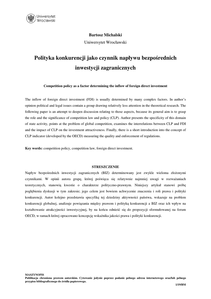 Bartosz Michalski Uniwersytet Wrocławski Polityka konkurencji jako czynnik napływu bezpośrednich inwestycji zagranicznych Competition policy as a factor determining the inflow of foreign direct investment The inflow of foreign direct investment (FDI) is usually determined by many complex factors. In author’s opinion political and legal issues contain a group drawing relatively less attention in the theoretical research. The following paper is an attempt to deepen discussion relating to those aspects, because its general aim is to grasp the role and the significance of competition law and policy (CLP). Author presents the specificity of this domain of state activity, points at the problem of global competition, examines the interrelations between CLP and FDI and the impact of CLP on the investment attractiveness. Finally, there is a short introduction into the concept of CLP indicator (developed by the OECD) measuring the quality and enforcement of regulations. Key words: competition policy, competition law, foreign direct investment. STRESZCZENIE Napływ bezpośrednich inwestycji zagranicznych (BIZ) determinowany jest zwykle wieloma złożonymi czynnikami. W opinii autora grupę, której poświęca się relatywnie najmniej uwagi w rozważaniach teoretycznych, stanowią kwestie o charakterze polityczno-prawnym. Niniejszy artykuł stanowi próbę pogłębienia dyskusji w tym zakresie; jego celem jest bowiem uchwycenie znaczenia i roli prawa i polityki konkurencji. Autor kolejno przedstawia specyfikę tej dziedziny aktywności państwa, wskazuje na problem konkurencji globalnej, analizuje powiązania między prawem i polityką konkurencji a BIZ oraz ich wpływ na kształtowanie atrakcyjności inwestycyjnej, by na końcu odnieść się do propozycji sformułowanej na forum OECD, w ramach której opracowano koncepcję wskaźnika jakości prawa i polityki konkurencji. MASZYNOPIS Publikacja chroniona prawem autorskim. Cytowanie jedynie poprzez podanie pełnego adresu internetowego oraz/lub pełnego przypisu bibliograficznego do źródła papierowego. 1/19/BM Wprowadzenie Napływ bezpośrednich inwestycji zagranicznych (BIZ) do danego kraju zdeterminowany jest wieloma złożonymi czynnikami. Aby ich identyfikacji i dalszym badaniom w tym zakresie nadać pewien usystematyzowany charakter, w teorii międzynarodowych stosunków gospodarczych dokonano zasadniczej klasyfikacji tych zmiennych na1: • motywy rynkowe, • motywy kosztowe, • motywy zaopatrzeniowe, • motywy polityczno-prawne. Istnieje rzecz jasna szereg teorii kompleksowo wyjaśniających specyfikę i determinanty transferu kapitału w formie BIZ. Z uwagi na stosunkowo większą łatwość dokonania obiektywizacji koncentrują się one na kwestiach mierzalnych, tzn. dających się przełożyć na charakterystyczny dla nauk ekonomicznych i zarządzania język wskaźników liczbowych. Wynika to poniekąd z faktu, iż spośród wyżej wymienionych motywów ekspansji międzynarodowych przedsiębiorstw za najważniejsze uznaje się dwie pierwsze grupy. Znaczenie motywów zaopatrzeniowych uległo częściowemu zmniejszeniu, czego przyczyną jest rozległość i efektywność współczesnych powiązań transportowych oraz przemiany strukturalne w wysoko rozwiniętych gospodarkach (wzrost znaczenia sektora usługowego i powiązanych z nim branż „wiedzochłonnych”). Ostatnią grupę motywów — kwestie o charakterze polityczno-prawnym — w zasadzie uznaje się za warunek konieczny niejako dopełniający całość, w związku z czym relatywnie rzadziej (co wydaje się swego rodzaju zaniedbaniem) poświęca się tym zagadnieniom uwagę. Niejako milcząco towarzyszy temu założenie, iż najlepsze warunki do lokowania BIZ istnieją w wysoko rozwiniętych, stabilnych systemach demokratycznych, o silnie zakorzenionych społecznie wzorcach gospodarki rynkowej, jak i sprawnie działającym, wiarygodnym systemem politycznym, w ramach którego jego uczestnicy wiedzeni odpowiedzialnością za gospodarczą pomyślność kraju nie generują żadnych kontrowersyjnych pomysłów, które 1 Zob. szerzej m.in. J. Rymarczyk, Internacjonalizacja i globalizacja przedsiębiorstwa, PWE, Warszawa 2004. MASZYNOPIS Publikacja chroniona prawem autorskim. Cytowanie jedynie poprzez podanie pełnego adresu internetowego oraz/lub pełnego przypisu bibliograficznego do źródła papierowego. 2/19/BM mogłyby z kolei zostać źle przyjęte przez przedstawicieli międzynarodowego biznesu i przełożyć się na negatywną ocenę klimatu inwestycyjnego (atrakcyjności inwestycyjnej)2. Spłycenie analizy do kwestii ogólnie rozumianej wiarygodności i stabilności systemu politycznego oraz odpowiedzialnej, lecz będącej jednocześnie (o czym należy pamiętać) wypadkową interesów poszczególnych grup nacisku, polityki gospodarczej nie wydaje się jednak zadowalające. Z tego powodu warto podjąć próbę pewnego uporządkowania tej problematyki, identyfikując zagadnienia szczegółowe i bliżej je analizując. Celem niniejszego artykułu jest refleksja nad znaczeniem polityki konkurencji w kontekście napływu BIZ. Temat ten wydaje się ciekawy, gdyż żaden z najpopularniejszych podręczników akademickich traktujących o polityce gospodarczej 3 nie przybliża kompleksowo tematyki polityki konkurencji jako takiej. Utrudnia to zatem zdaniem autora uchwycenie istotnych kwestii determinujących m.in. prowadzenie polityki przemysłowej czy innowacyjnej, oddziałujących na stanowienie i wykonywanie prawa, a szerszym kontekście kreujących określony wizerunek kraju. Przedłożone studium jest pochodną refleksji poczynionej w toku lektury zagranicznych opracowań międzynarodowych organizacji gospodarczych (WTO, UNCTAD, OECD, ICN4), które w ramach posiadanych kompetencji zajmują (względnie zajmowały się) problematyką polityki konkurencji i ustanowieniem systemu międzynarodowej współpracy w tym zakresie. Artykuł stanowi zarazem drobną część badań w