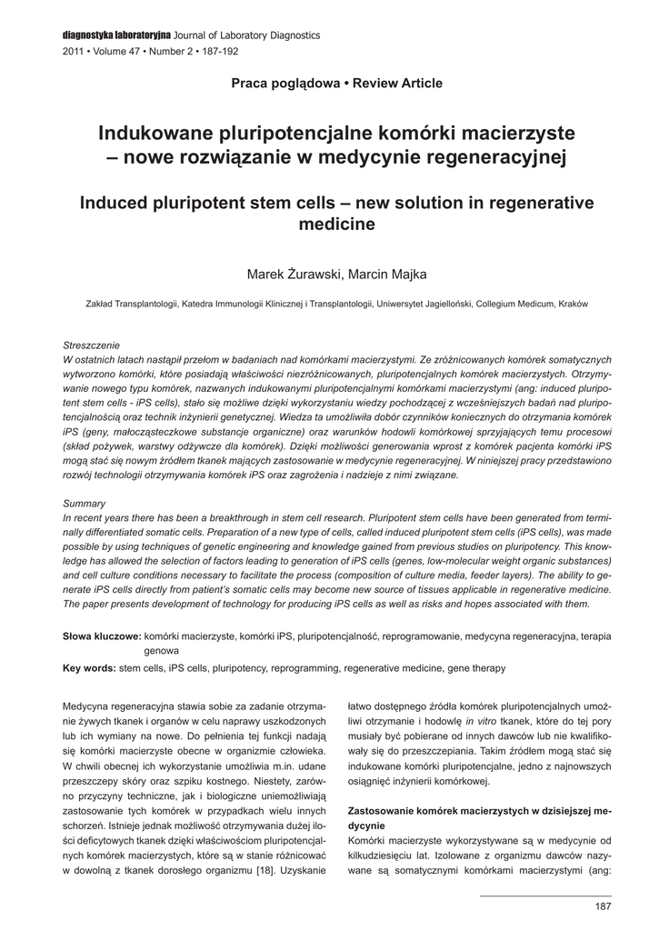 diagnostyka laboratoryjna Journal of Laboratory Diagnostics 2011 • Volume 47 • Number 2 • 187-192 Praca poglądowa • Review Article Indukowane pluripotencjalne komórki macierzyste – nowe rozwiązanie w medycynie regeneracyjnej Induced pluripotent stem cells – new solution in regenerative medicine Marek Żurawski, Marcin Majka Zakład Transplantologii, Katedra Immunologii Klinicznej i Transplantologii, Uniwersytet Jagielloński, Collegium Medicum, Kraków Streszczenie W ostatnich latach nastąpił przełom w badaniach nad komórkami macierzystymi. Ze zróżnicowanych komórek somatycznych wytworzono komórki, które posiadają właściwości niezróżnicowanych, pluripotencjalnych komórek macierzystych. Otrzymywanie nowego typu komórek, nazwanych indukowanymi pluripotencjalnymi komórkami macierzystymi (ang: induced pluripotent stem cells - iPS cells), stało się możliwe dzięki wykorzystaniu wiedzy pochodzącej z wcześniejszych badań nad pluripotencjalnością oraz technik inżynierii genetycznej. Wiedza ta umożliwiła dobór czynników koniecznych do otrzymania komórek iPS (geny, małocząsteczkowe substancje organiczne) oraz warunków hodowli komórkowej sprzyjających temu procesowi (skład pożywek, warstwy odżywcze dla komórek). Dzięki możliwości generowania wprost z komórek pacjenta komórki iPS mogą stać się nowym źródłem tkanek mających zastosowanie w medycynie regeneracyjnej. W niniejszej pracy przedstawiono rozwój technologii otrzymywania komórek iPS oraz zagrożenia i nadzieje z nimi związane. Summary In recent years there has been a breakthrough in stem cell research. Pluripotent stem cells have been generated from terminally differentiated somatic cells. Preparation of a new type of cells, called induced pluripotent stem cells (iPS cells), was made possible by using techniques of genetic engineering and knowledge gained from previous studies on pluripotency. This knowledge has allowed the selection of factors leading to generation of iPS cells (genes, low-molecular weight organic substances) and cell culture conditions necessary to facilitate the process (composition of culture media, feeder layers). The ability to generate iPS cells directly from patient’s somatic cells may become new source of tissues applicable in regenerative medicine. The paper presents development of technology for producing iPS cells as well as risks and hopes associated with them. Słowa kluczowe:komórki macierzyste, komórki iPS, pluripotencjalność, reprogramowanie, medycyna regeneracyjna, terapia genowa Key words:stem cells, iPS cells, pluripotency, reprogramming, regenerative medicine, gene therapy Medycyna regeneracyjna stawia sobie za zadanie otrzymanie żywych tkanek i organów w celu naprawy uszkodzonych lub ich wymiany na nowe. Do pełnienia tej funkcji nadają się komórki macierzyste obecne w organizmie człowieka. W chwili obecnej ich wykorzystanie umożliwia m.in. udane przeszczepy skóry oraz szpiku kostnego. Niestety, zarówno przyczyny techniczne, jak i biologiczne uniemożliwiają zastosowanie tych komórek w przypadkach wielu innych schorzeń. Istnieje jednak możliwość otrzymywania dużej ilości deficytowych tkanek dzięki właściwościom pluripotencjalnych komórek macierzystych, które są w stanie różnicować w dowolną z tkanek dorosłego organizmu [18]. Uzyskanie łatwo dostępnego źródła komórek pluripotencjalnych umożliwi otrzymanie i hodowlę in vitro tkanek, które do tej pory musiały być pobierane od innych dawców lub nie kwalifikowały się do przeszczepiania. Takim źródłem mogą stać się indukowane komórki pluripotencjalne, jedno z najnowszych osiągnięć inżynierii komórkowej. Zastosowanie komórek macierzystych w dzisiejszej medycynie Komórki macierzyste wykorzystywane są w medycynie od kilkudziesięciu lat. Izolowane z organizmu dawców nazywane są somatycznymi komórkami macierzystymi (ang: 187 Indukowane pluripotencjalne komórki macierzyste – nowe rozwiązanie w medycynie regeneracyjnej somatic stem cells – SSC). To dzięki nim można dokonywać m.in. przeszczepów szpiku kostnego i skóry. Dzieje się tak dlatego, że tkanki te są ewolucyjnie przystosowane do ciągłego odtwarzania, przez co w odpowiednich warunkach są w stanie zrekonstruować zarówno ubytki fizjologiczne, jak i wywołane chorobą czy urazami. Przeszczepy szpiku kostnego i zawartych w nim hematopoetycznych komórek macierzystych (ang: hematopoietic stem cells – HSC) są najczęstszym zastosowaniem terapeutycznym komórek macierzystych. Przeszczepy przeprowadza się m.in. w leczeniu nowotworów krwi i niektórych ciężkich postaci anemii. Źródłem komórek hematopoetycznych jest szpik kostny, krew obwodowa (po uprzedniej mobilizacji komórek ze szpiku) i krew pępowinowa [18]. Transplantacje komórek hematopoetycznych wykonuje się także w Polsce. Pierwszy udany allogeniczny przeszczep szpiku wykonała grupa prof. Jędrzejczaka w 1984 r. w Warszawie. Był to przeszczep od dawcy spokrewnionego wykonany u pacjentki z rzadką niedokrwistością Diamonda-Blackfana i drugi taki przypadek na świecie [32]. W 1987 r. dokonano pierwszego w kraju typowania antygenów zgodności tkankowej (HLA) w Instytucie Immunologii i Terapii Doświadczalnej we Wrocławiu. W tym samym roku powstał powiązany z nim Oddział Immunoterapii i Przeszczepiania Szpiku pod kierownictwem prof. Langego. Była to pierwsza jednostka w polskiej służbie zdrowia, która mogła samodzielnie wykonywać wszystkie czynności związane z przeszczepianiem komórek krwiotwórczych [13]. Procedury dotyczące przeszczepów opracowane we Wrocławiu przyczyniły się do rozwoju polskiej hematologii. Wrocławski ośrodek były także pierwszym w Polsce, w którym wykonano przeszczep szpiku w leczeniu guza litego [32]. Kamieniem milowym polskiej transplantologii był rok 1997, kiedy to pierwszy przeszczep szpiku od dawcy niespokrewnionego przeprowadził prof. Jerzy 