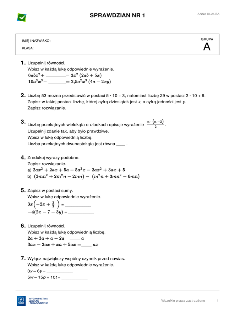 SPRAWDZIAN NR 1 ANNA KLAUZA GRUPA IMIĘ I NAZWISKO: A KLASA: 1. Uzupełnij równości. Wpisz w każdą lukę odpowiednie wyrażenie. 2. Liczbę 53 można przedstawić w postaci 5 · 10 + 3, natomiast liczbę 29 w postaci 2 · 10 + 9. Zapisz w takiej postaci liczbę, której cyfrą dziesiątek jest x, a cyfrą jedności jest y. Zapisz rozwiązanie. 3. Liczbę przekątnych wielokąta o n bokach opisuje wyrażenie . Uzupełnij zdanie tak, aby było prawdziwe. Wpisz w lukę odpowiednią liczbę. Liczba przekątnych dwunastokąta jest równa ____ . 4. Zredukuj wyrazy podobne. Zapisz rozwiązanie. a) b) 5. Zapisz w postaci sumy. Wpisz w lukę odpowiednie wyrażenie. = ____________ = ____________ 6. Uzupełnij równości. Wpisz w każdą lukę odpowiednią liczbę. 7. Wyłącz największy wspólny czynnik przed nawias. Wpisz w każdą lukę odpowiednie wyrażenie. 3x – 6y = ____________ 5w – 15p + 10t = ____________ Wszelkie prawa zastrzeżone 1 8. Pewna rzeka w ciągu 1 s wprowadza do jeziora k dm 3 wody. Ile litrów wody wprowadza ta rzeka do jeziora w ciągu 24 godzin? Zapisz obliczenia i sformułuj odpowiedź. 9. Wiedząc, że pole trójkąta równobocznego wyraża się wzorem P = gdzie a to długość boku trójkąta, oblicz pole trójkąta równobocznego o boku długości 4 cm. Zapisz rozwiązanie. 10. Doprowadź wyrażenia do najprostszej postaci. Zapisz rozwiązanie. a) b) 11. Uzupełnij równości. Wpisz w każdą lukę odpowiednią liczbę. 12. Oblicz miarę kąta wewnętrznego dziewięciokąta foremnego, korzystając z faktu, że suma kątów wewnętrznych w n–kącie wypukłym jest równa (n – 2) · 180°, gdzie n jest liczbą naturalną większą od 2. 13. Uzupełnij. Wpisz w każdą lukę odpowiednią liczbę. a) 3a – 6b + 9c – 12 = 3(a – ____b + ____c – ____) b) 15a – 5b + 10c – 25 = ____(____a – b + ____c – ____) c) ____a – 21b + ____c + 14 = 7(2a – ____b + 5c + ____) d) 33a + ____b + ____c + 44 = 11(____a + 5b + 7c + ____) 14. Uzupełnij równości. Wpisz w każdą lukę odpowiedni jednomian. Wszelkie prawa zastrzeżone 2 15. W dniu 14 lipca 2010 roku w gminach Suchożebry i Mokobrody w powiecie siedleckim znajdowało się 88 gniazd zamieszkałych przez bociany. Każde z gniazd zamieszkiwała para dorosłych bocianów wraz z młodymi. W jednym z tych gniazd znajdowało się aż 6 młodych ptaków. Sześć gniazd było z dwoma, zaledwie kilka z trzema, czternaście z pięcioma, a pozostałe były z czterema młodymi bocianami. a) Wyznacz liczbę n gniazd z trzema młodymi bocianami, przyjmując za k liczbę gniazd z czterema młodymi bocianami. b) Zapisz wyrażenie algebraiczne opisujące liczbę wszystkich bocianów gniazdujących w obu gminach, przyjmując za n liczbę gniazd z młodymi bocianami. Wszelkie prawa zastrzeżone 3