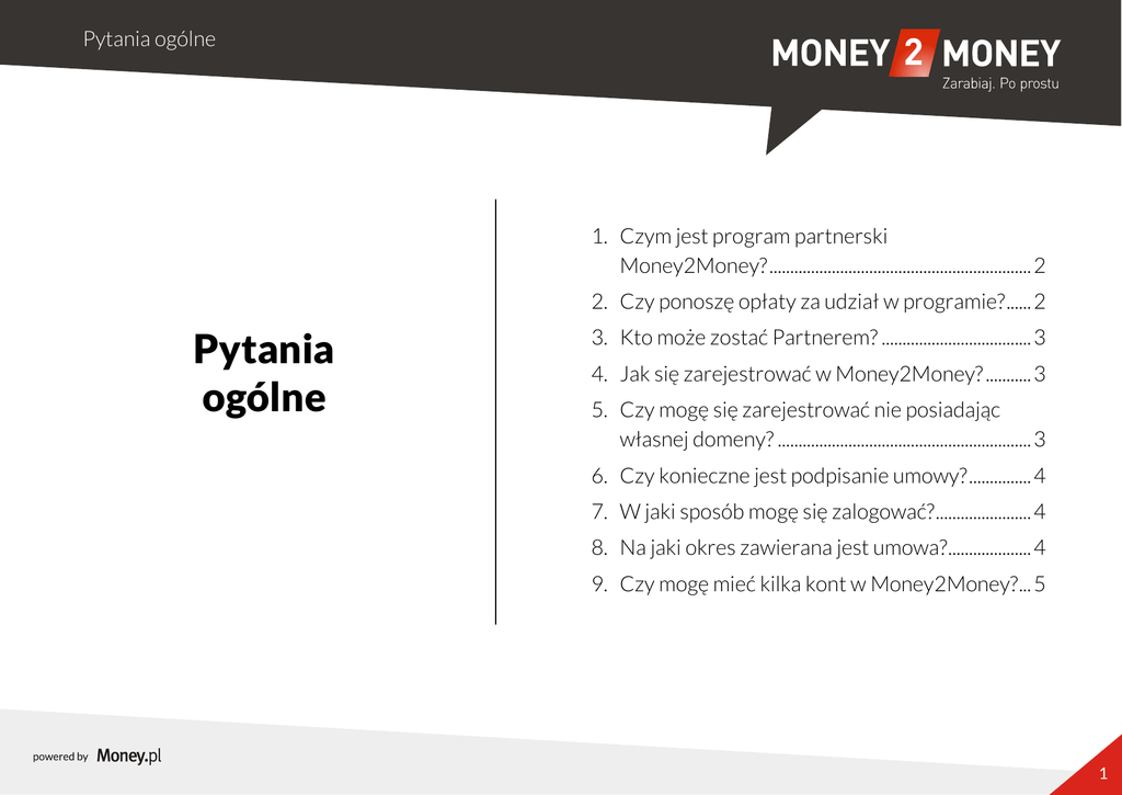 Pytania ogólne 1. Czym jest program partnerski Money2Money? ............................................................... 2 2. Czy ponoszę opłaty za udział w programie? ...... 2 Pytania ogólne 3. Kto może zostać Partnerem? .................................... 3 4. Jak się zarejestrować w Money2Money? ........... 3 5. Czy mogę się zarejestrować nie posiadając własnej domeny? ............................................................. 3 6. Czy konieczne jest podpisanie umowy? ............... 4 7. W jaki sposób mogę się zalogować? ....................... 4 8. Na jaki okres zawierana jest umowa? .................... 4 9. Czy mogę mieć kilka kont w Money2Money? ... 5 1 Pytania ogólne 1. Czym jest program partnerski Money2Money? Zarabianie w programie partnerskim Money2Money polega m.in. na promowaniu swojej strony WWW, poprzez którą realizowana jest sprzedaż produktów i usług. Program polecamy w szczególności : właścicielom stron WWW, for i blogów internetowych oraz baz mailingowych, którzy chcą na nich zarabiać więcej lub dopiero rozpocząć zarabianie, każdemu kto chce dopiero rozpocząć zarabianie on-line i nie ma jeszcze swojej strony WWW (udostępnimy Ci gotowe narzędzia), a Twoim zadaniem będzie ich promowanie w mediach społecznościowych, katalogach, wyszukiwarkach itp. 2. Czy ponoszę opłaty za udział w programie? Program Partnerski jest bezpłatny i niezobowiązujący. Partner nie ponosi żadnych kosztów związanych z rejestracją i obsługą – nawet w przypadku korzystania z domeny oferowanej przez Money2Money. Rozwiązanie umowy również nie wiąże się z żadnymi opłatami. 2 Pytania ogólne 3. Kto może zostać Partnerem? Partnerem Money2Money może zostać: każda osoba fizyczna, która ukończyła 18 lat, każda firma, bez względu na formę prawną. 4. Jak się zarejestrować w Money2Money? W celu przystąpienia do programu partnerskiego Money2Money, należy wypełnić formularz dostępny na stronie internetowej: www.money2money.com.pl/rejestracja/ 5. Czy mogę się zarejestrować nie posiadając własnej domeny? Jeżeli Partner nie posiada własnej domeny, a posiada umiejętności związane ze aktywnym reklamowaniem produktów znajdujących się w naszym programie partnerskim może skorzystać z naszej bezpłatnej domeny .oferty-kredytowe.pl Chęć skorzystania z niej Partner zaznacza wybierając odpowiednią opcję w momencie rejestracji. Wówczas Partner podaje też nazwę subdomeny. Subdomena może zostać zmieniona na wniosek Partnera. W tym celu należy skontaktować się z Opiekunem programu partnerskiego Money2Money poprzez formularz kontaktowy dostępny w panelu po zalogowaniu. 3 Pytania ogólne 6. Czy konieczne jest podpisanie umowy? 7. W jaki sposób mogę się zalogować? Po wypełnieniu zgłoszenia oraz formularza rejestracyjnego, Money.pl Sp. z o.o. - właściciel programu partnerskiego Money2Money akceptuje konto partnera. Następnie drogą elektroniczną zawarta zostaje umowa o dzierżawę powierzchni reklamowej, którą Partner otrzymuje na wskazany podczas rejestracji adres e-mail. Nie ma potrzeby jej podpisywania i odsyłania. Na stronie http://www.money2money.com.pl/ należy wpisać login i hasło, podane podczas rejestracji. Po zalogowaniu Partner otrzymuje dostęp do wielu funkcji i narzędzi umożliwiających pełne spersonalizowanie strony WWW lub stworzenie własnej unikalnej strony WWW. Otrzymuje również bezpłatny pasaż finansowy. 8. Na jaki okres zawierana jest umowa? Umowa zawierana jest na czas nieokreślony. 4 Pytania ogólne 9. Czy mogę mieć kilka kont w Money2Money? Niestety nie. Jedna osoba/ firma może posiadać tylko jedno konto w programie partnerskim Money2Money. 5