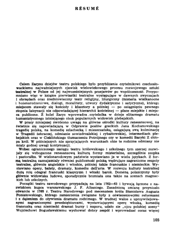 RESUME Celem Zarysu dziejów teatru polskiego było przybliżenie czytelnikowi czechosło wackiemu najważniejszych zjawisk wielowiekowego procesu rozwojowego sztuki teatralnej w Polsce od jej najwcześniejszych przejawów po współczesność. Przypo mniano więc w książce pierwiastki teatralne występujące w dawnych zwyczajach I obrzędach oraz średniowieczny teatr religijny, liturgiczny (misteria wielkanocne i bożenarodzeniowe, dialogi, moralitety, utwory dydaktyczne i satyryczne), któregc miejscem stawały się kościoły i klasztory a później — po osiągnięciu pewnego stopnia laicyzacji nie odpowiadającej hierarchii kościelnej — place miejskie i miejs ca publiczne. Z kolei Zarys wprowadza . czytelnika w dzieje elitarnego dramatu humanistycznego istniejącego obok popularnych widowisk plebejskich. W pracy niniejszej zwrócono uwagę na główne ośrodki kultury renesansowej, na świetnie się zapowiadającą w Odprawie posłów greckich Jana Kochanowskiego tragedię polską, na komedię szlachecką i mieszczańską, osiągającą swą kulminację w Tragedii żebraczej, odmianie sowizdrzalskiej i rybałtowskiej, intermediach ple bejskich oraz w Cieklińskiego tłumaczeniu Potrójnego czy w komedii Baryki Z chło pa król. W późniejszych nie sprzyjających warunkach obie te rodzime odmiany nie miały godnej uwagi kontynuacji. Wobec ograniczonego zasięgu teatru królewskiego i szkolnego tym szerzej rozwi jały się wzbogacone renesansową kulturą formy misterialne, szczególnie szopka i pastorałka. W wielonarodowym państwie wystawiano je w wielu językach. Z for mą teatralną zaznajamiały również publiczność polską wędrujące zagraniczne zespoły teatralne, głównie angielskie i włoskie, później także francuskie i niemieckie. Wy stawiano opery, balety, dramaty, komedie delTarte. W rozwoju kultury teatralnej dużą rolę odegrał francuski klasycyzm i włoski barok. Domeną polszczyzny były głównie widowiska ludowe, sporadycznie brzmiała ona także na scenach magnac kich lub szkolnych. Początki teatru zawodowego przypadają na lata 1762—63 i bywają łączone z na zwiskiem kupca warszawskiego J. F. Albaniego. Zasadniczą zmianę przyniosło otwarcie w 1765 r. Teatru Narodowego pod mecenatem króla Stanisława Augusta Poniatowskiego, którego zamierzenia związane były z oświeceniowymi reformami i z dążeniem do ożywienia dramatu rodzimego. W trudnej walce z uprzywilejowa nymi zagranicznymi przedsiębiorcami, wystawiającymi operę włoską, komedię francuską oraz niemiecki dramat burzy i naporu, udało sie „ojcu polskiej sceny" Wojciechowi Bogusławskiemu wychować dobry zespół i wprowadzać coraz więcej 105 dzieł polskich, często jednak będących przeróbkami obcych, najczęściej francuskich utworów. Działalności Bogusławskiego towarzyszył znaczny rozwój twórczości dra matycznej (Franciszek Bohomolec, Franciszek Zabłocki, Julian Ursyn Niemcewicz, Ignacy Krasicki, Józef Wybicki). Organizując spektakle wyjazdowe w różnych mia stach polskich Teatr Narodowy przyczynił się do powstawania zarówno nowych ośrodków życia teatralnego jak i polskich zespołów wędrownych. Wielkim wzbogaceniem literatury dramatycznej była twórczość czołowych poetów romantycznych, na krajowych scenach niestety jednak długo ze względów cenzuralnych nieobecna. Z rodzimych autorów aż po okres pozytywizmu górowali Aleksan der Fredro i Józef Korzeniowski. W repertuarze warszawskiego Teatru Narodowego po odejściu Bogusławskiego zanikały tak silne uprzednio tendencje postępowe, nadal dbano jednak o dobre przygotowanie aktorów, którzy w warunkach materialnego zabezpieczenia ze strony Warszawskich Teatrów Rządowych mogli rozwijać swój talent. Powstały tak zgodnie z polityką zaborcy „teatr gwiazd" (Alojzy Żółkowski syn i inni wielcy aktorzy) stracił w znacznym stopniu swą dawna silę ideowego oddziaływania na widownię. W duchu koncepcji Bogusławskiego natomiast stworzył żywy ośrodek teatralny we Lwowie Jan Nepomucen Kamiński. W drugiej połowie X I X wieku szczególne miejsce w kulturze polskiej zajmuje teatr krakowski, którego świetny okres zapoczątkował Stanisław Koźmian torując mu drogę do nowoczesności między innymi poprzez dobór repertuaru oraz metody pracy scenicznej. Koźmian wychował wielu wybitnych aktorów, którzy później zasilili teatry stołeczne (Józef Rychter, Jan Królikowski, Helena Modrzejewska. Wincenty Rapacki, Bolesław Lesz czyński, Bolesław Ladnowski i inni, w następnej generacji zaś np. Irena Solska, Ludwik Solski, Kazimierz Kamiński, Maria Przybyłko-Potocka). Rozwój społeczeństwa, emancypacja nowych warstw społecznych postawiły w drugiej połowie X I X w. również przed teatrem nowe zadania. W Warszawie obok elitarnych teatrów rządowych powstawały teatry ogródkowe oraz teatry Letni, Mały i Nowy, w których grano przeważnie lżejszy repertuar: wodewile, farsy i operetki. Stałe teatry i wędrowne grupy teatralne powstawały w Poznaniu, Łodzi, Lublinie, Kaliszu i innych miastach. Ważnym problemem było w tym czasie poszukiwanie właściwego kształtu dla teatru popularnego, ludowego. Na przełomie stulecia nadal przodował teatr galicyjski: krakowski i lwowski. Kierujący nimi Tadeusz Pawlikowski świetnie potrafił przeszczepiać osiągnięcia europejskie (zespołowość teatru z Meiningen, zdobycze teatru naturalistycznego, symbolistycznego i modernistycznego, inspiracje płynące z dramatu skandynawskie go i rosyjskiego). Józef Kotarbiński i Ludwik Solski wprowadzali na sceny polskie monumentalne dzieła wielkich romantyków (Adam Mickiewicz, Juliusz Słowacki, Zygmunt Krasiński, Cyprian Kamil Norwid) obok sztuk aktualnie powstających (Jan August Kisielewski, Stanisław Wyspiański, Lucjan Rydel, Stanisław Przyby szewski, Tadeusz Rittner, Włodzimierz Perzyński, Gabriela Zapolska, Karol Hubert Rostworowski). Szczególna rola w rozwoju myśli teatr