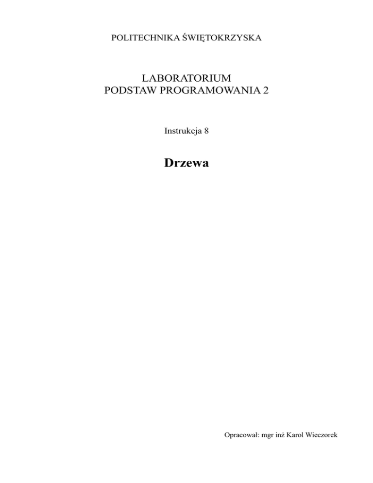 POLITECHNIKA ŚWIĘTOKRZYSKA LABORATORIUM PODSTAW PROGRAMOWANIA 2 Instrukcja 8 Drzewa Opracował: mgr inż Karol Wieczorek 1. Przystępując do zajęć student powinien mieć opanowane • wiadomości dotyczące drzew • mechanizmy pozwalające pracować z drzewami 2. Zadania do wykonania Zad 1 Napisać program wczytujący z podanego pliku słownik polsko angielski • każdy rekord w pliku to wiersz składający się z frazy polskiej i angielskiej. Oddzielone są one znakiem '|' • drzewo powinno mieć taką budowę by przyspieszyć wyszukiwane wyrazów. Pierwsza litera szukanego wyrazu określa węzeł z pierwszego poziomu. Druga litera drugiego trzecia trzeciego itd. Długość wyrazu określi nam też poziom. na którym się on znajduje przykład: • Przykładowo, szukając słowa beczka, wyszukujemy węzeł B potem pod węzłem B szukamy węzeł E pod węzłem E szukamy C itd. Przy węźle BECZKA powinna być podczepiona wartość BARREL. Jeżeli wyraz ma kilka znaczeń to pod danym węzłem trzeba podczepić kilka wyrazów (lista). • Do słownika można było dodać nowy rekord, edytować wyszukany rekord, oraz usunąć wyszukany rekord. • Powinno się dać zapisać z powrotem do pliku całe drzewo, w sposób posortowany. • Powinno dać się przeprowadzić konwersje z polsko angielskiego na angielsko polski. • Program powinien mieć miły i intuicyjny interfejs. •