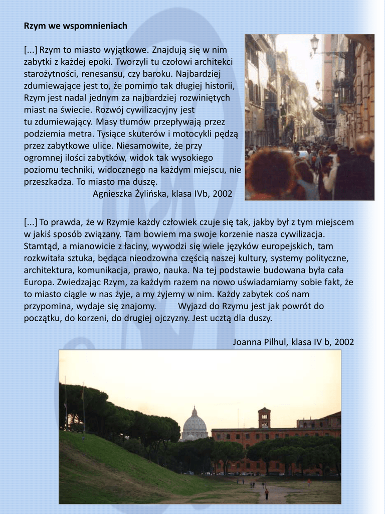 Rzym we wspomnieniach *...+ Rzym to miasto wyjątkowe. Znajdują się w nim zabytki z każdej epoki. Tworzyli tu czołowi architekci starożytności, renesansu, czy baroku. Najbardziej zdumiewające jest to, że pomimo tak długiej historii, Rzym jest nadal jednym za najbardziej rozwiniętych miast na świecie. Rozwój cywilizacyjny jest tu zdumiewający. Masy tłumów przepływają przez podziemia metra. Tysiące skuterów i motocykli pędzą przez zabytkowe ulice. Niesamowite, że przy ogromnej ilości zabytków, widok tak wysokiego poziomu techniki, widocznego na każdym miejscu, nie przeszkadza. To miasto ma duszę. Agnieszka Żylioska, klasa IVb, 2002 *...+ To prawda, że w Rzymie każdy człowiek czuje się tak, jakby był z tym miejscem w jakiś sposób związany. Tam bowiem ma swoje korzenie nasza cywilizacja. Stamtąd, a mianowicie z łaciny, wywodzi się wiele języków europejskich, tam rozkwitała sztuka, będąca nieodzowna częścią naszej kultury, systemy polityczne, architektura, komunikacja, prawo, nauka. Na tej podstawie budowana była cała Europa. Zwiedzając Rzym, za każdym razem na nowo uświadamiamy sobie fakt, że to miasto ciągle w nas żyje, a my żyjemy w nim. Każdy zabytek coś nam przypomina, wydaje się znajomy. Wyjazd do Rzymu jest jak powrót do początku, do korzeni, do drugiej ojczyzny. Jest ucztą dla duszy. Joanna Pilhul, klasa IV b, 2002 *...+ Wieczne Miasto posiada wiele takich miejsc, w których zakochad się można do szaleostwa – i to już od pierwszego wejrzenia. Nie sposób jednak pokochad Rzymu całego – a przynajmniej ja tak nie potrafię. Brakuje mu niepowtarzalnej atmosfery wąskich uliczek Wenecji, brakuje mu potęgi i majestatu, jaki bije od murów Florencji. *...+ I chod zapewne zdążyłem już wyjśd na wiecznie niezadowolonego malkontenta, to jednak nie mam najmniejszego zamiaru twierdzid, że nie ma w Rzymie nic pięknego. Są w nim bowiem miejsca naprawdę urokliwe, tchnące niepowtarzalną atmosferą. To przyjemny chłód Portyku Oktawii i labirynt krętych uliczek Zatybrza. To zielone wzgórze Gianicolo i zarośnięte ruiny pałaców cesarskich na Palatynie. To krypty kapucynów w Santa Maria della Concezione. To tajne sanktuarium Mitry w podziemiach wczesnochrześcijaoskiej bazyliki, gdzie pod nogami wciąż szumi woda, spływająca Cloaca Maxima. To wszystkie te miejsca, gdzie chod na chwilę można uciec od nieznośnego tłumu, snującego się bez wyraźnego celu po Forum Romanum. *...+ Nie mógłbym sobie natomiast darowad, gdybym nie odbył wczesnym rankiem kilkukilometrowej wędrówki Via Appia i nie zjadł skromnego śniadania pod grobowcem Ilariusa Fuskusa, złożywszy uprzednio ( oczywista! ) ofiarę jego cieniowi. Podobnie, jak nie ma nic wspanialszego, niż [...] spacer Via Giulia tuż po zapadnięciu zmroku, pod czujnym okiem porośniętych mchem fantasmagorycznych rzygaczy oraz makabrycznych czaszek, zdobiących fasadę Santa Maria dell’Orazione e Morte... Wystarczy jednak skręcid w kilka przecznic, wyjśd na Plac Hiszpaoski i ... cały czar pryska. Niestety. Forum Romanum. Sol Invictus wciąż grzeje niemiłosiernie, mszcząc się najwyraźniej za ostateczny tryumf chrześcijaostwa. Przeciskam się uporczywie przez zbitą ciżbę niemieckich turystów, by chod na chwilę móc spojrzed na Rostrę i uszami pochwycid donośny, melodyjny głos Marka Tuliusza Cycerona, ogłaszający właśnie katylinarczyków wrogami ojczyzny. Zamiast niego odzywa się jednak chrapliwy megafon, informujący grupę, że z tej mównicy ... O tempora, o mores! Nie słychad już nic: to niebo mówi obcą mową / to barbarzyoski okrzyk trwogi / którego nie zna twa łacina ... Mateusz Żurawski, klasa IVb, 2002 [...] Rzym jest miastem – ikoną. Z założenia miał byd Wiecznym Miastem. Stworzony, aby dad wyraz jedności i siły, Rzym zawsze stanowił dla królów i władców wzór imperium; ideał pysznej potęgi. Wielcy władcy, aspirując do tego wzorca, przywoływali widmo wielkiego rzymskiego imperium, nazywali siebie cesarzami, ponieważ dodawało im to splendoru. Żadnemu z tych marzycieli nie udało się zrealizowad planu stworzenia „drugiego Rzymu”. Jak wiadomo, samo Wieczne Miasto nie podołało takiemu zamierzeniu. *...+ To, co decyduje o ikonograficznym charakterze miasta, mieści się w resztkach dawnej władzy, znakach kultury. A znaków jest tu pełno. Nie jest trudno odnaleźd siebie w Rzymie, gdyż otaczają nas znane obiekty, które już poznaliśmy wcześniej. Tak jak Wieża Eiffla i Notre - Dame są znakami rozpoznawczymi Paryża, tak Koloseum, Forum Romanum, Schody Hiszpaoskie, Fontanna di Trevi, Plac św. Piotra, bazylika św. Piotra i wiele innych, są symbolami Rzymu. Oczywiście istnieje ponad tysiąc katedr Notre – Dame we Francji i mnóstwo amfiteatrów, takich jak Koloseum, ale tak się to właśnie dzieje z symbolami, że przy ich odczytywaniu najważniejsze jest pierwsze skojarzenie. Gdy zatem poruszamy się po mieście, nie musimy czud się obco, otaczają nas bowiem elementy „oswojonego świata”. Możemy doznad w pełni wrażeo, których wcześniej doznawaliśmy niejako „z drugiej ręki”: z fotografii, filmu, czy książki. Wreszcie sami możemy oddychad powietrzem pod Panteonem, czy Fontanną di Trevi. W ten sposób wtórnie doświadczamy pewnych wrażeo i jesteśmy lepiej przygotowani na ewentualne spotkanie z absolutem.[...] Magda Grenda, klasa IV b, 2002 *...+ Na koocu wymienię miejsce, które najlepiej wspominam z całego Rzymu. Aczkolwiek w przewodniku jest ono w rozdziale „Wycieczki poza miasto”, ale na planie jeszcze się znajduje. Mówię oczywiście o Via Appia. Jest to malownicza droga z zachowaną oryginalną nawierzchnią z czasów starożytnego Rzymu. Po paru godzinach spędzonych w zgiełku samochodów i skuterów nagle znalazłam się na cichej, wąskiej, wiejskiej drodze. Była druga połowa października, a klimat w tej części Europy jest o tej porze taki, jak w 