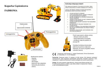 Instrukcje dotyczące baterii Koparka Gąsienicowa Pilot zasilany jest baterią 9V. Aby włożyć ją do środka, należy odkręcić śrubę pokrywy na baterie znajdującą się na odwrocie UWAGA: NIE MIESZAJ RÓŻNYCH RADZAJÓW BATERII; NIE MIESZAJ NOWYCH BATERII Z NOWYMI FADROMA WYJMIJ BATERIE PO ZABAWIE ZUŻYTE BATERIE NALEŻY USUNĄĆ I WYRZUĆIĆ DO ODPOWIEDNIEGO POJEMNIKA BATERII NIE BĘDĄCYCH AKUMULATORKAMI NIE WOLNO ŁADOWAĆ AKUMULATORKI NALEŻY WYJĄĆ Z ZABAWKI PRZED PRÓBĄ ICH NAŁADOWANIA AKUMULATORKI NALEŻY ŁADOWAĆ POD NADZOREM DOROSŁEGO BATERIE NALEŻY WKŁADAĆ ZGODNIE Z ICH POLARYZACJĄ BATERIE WYMIENIAJ POD NADZOREM DOROSŁEGO NIE WOLNO DOPROWADZAĆ DO SPIĘCIA PANELU ZASILANIA ZACHOWAJ OPAKOWANIE, GDYŻ ZAWIERA ONO ISTOTNE INFORMACJE Przed rozpoczęciem zabawy należy: - dokręcić antenę do pilota - wpiąć kabel baterii do pojazdu - przełączyć włącznik pojazdu na pozycję ON Pamiętaj, by ładować akumulator jedynie przy pomocy załączonej ładowarki. W innym przypadku możesz uszkodzić baterię. Dystrybucja: ZUH Kontext s.c. Izabela Zawistowska, Konrad Zawistowski. Ul. Hetmańska 10 / 15-727 Białystok Opakowanie zawiera: - koparkę - nadajnik - akumulator - baterię 9V (do nadajnika) - ładowarkę akumulatora - antena Gwarancja: Gwarancja ważna 12 miesięcy od daty zakupu. Nie obejmuje uszkodzeń mechanicznych, bądź zagubienia jakichkolwiek elementów. Wszelkie używanie w celu niezgodnym z załączoną instrukcją nie będzie podlegało pod warunki gwarancyjne. Uwaga: Gra może zawierać małe elementy, chronić przed dziećmi poniżej 3 lat. Po zakończonej zabawie, pudełko z grą należy odłożyć w bezpiecznym miejscu, w celu zminimalizowania ryzyka. KX9014