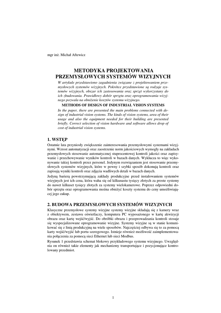 mgr inż. Michał Aftewicz METODYKA PROJEKTOWANIA PRZEMYSŁOWYCH SYSTEMÓW WIZYJNYCH W artykule przedstawiono zagadnienia związane z projektowaniem przemysłowych systemów wizyjnych. Pokrótce przedstawione są rodzaje systemów wizyjnych, obszar ich zastosowania oraz sprzęt wykorzystany do ich zbudowania. Prawidłowy dobór sprzętu oraz oprogramowania wizyjnego pozwala na obniżenie kosztów systemu wizyjnego. METHODS OF DESIGN OF INDUSTRIAL VISION SYSTEMS In the paper, there are presented the main problems connected with design of industrial vision systems. The kinds of vision systems, area of their usage and also the equipment needed for their building are presented briefly. Correct selection of vision hardware and software allows drop of cost of industrial vision systems. 1. WSTĘP Ostatnie lata przyniosły zwiększenie zainteresowania przemysłowymi systemami wizyjnymi. Wzrost automatyzacji oraz zaostrzenie norm jakościowych wymogły na zakładach przemysłowych stosowanie automatycznej stuprocentowej kontroli jakości oraz zapisywanie i przechowywanie wyników kontroli w bazach danych. Wyklucza to więc wykonywanie takiej kontroli przez personel. Jedynym rozwiązaniem jest stosowanie przemysłowych systemów wizyjnych, które w pewny i szybki sposób dokonują kontroli oraz zapisują wyniki kontroli oraz zdjęcia wadliwych detali w bazach danych. Jedyną barierą powstrzymującą zakłady produkcyjne przed instalowaniem systemów wizyjnych jest ich cena, która waha się od kilkunastu tysięcy złotych za proste systemy do nawet kilkuset tysięcy złotych za systemy wielokamerowe. Poprzez odpowiedni dobór sprzętu oraz oprogramowania można obniżyć koszty systemu do ceny umożliwiającej jego zakup. 2. BUDOWA PRZEMYSŁOWYCH SYSTEMÓW WIZYJNYCH Klasyczne przemysłowe systemy wizyjne systemy wizyjne składają się z kamery wraz z obiektywem, zestawu oświetlaczy, komputera PC wyposażonego w kartę akwizycji obrazu oraz kartę wejść/wyjść. Do obróbki obrazu i przeprowadzania kontroli stosuje się wyspecjalizowane oprogramowanie wizyjne. Systemy wizyjne są w stanie komunikować się z linią produkcyjną na wiele sposobów. Najczęściej odbywa się to za pomocą karty wejść/wyjść lub portu szeregowego. Istnieje również możliwość zaimplementowania połączenia za pomocą sieci Ethernet lub sieci Modbus. Rysunek 1 przedstawia schemat blokowy przykładowego systemu wizyjnego. Uwzględnia on również takie elementy jak mechanizmy transportujące i pozycjonujące kontrolowany przedmiot. 1 Rysunek 1. Schemat blokowy klasycznego systemu wizyjnego. Coraz częściej klasyczne przemysłowe systemy wizyjne wypierane są przez kamery inteligentne. Kamery te pozwalają na pracę bez komputera PC. Po wgraniu programu wizyjnego mogą być odłączone od komputera i pracować samodzielnie komunikując się z urządzeniem za pomocą karty I/O, Ethernetu TCP IP, RS422, Modbusa. Rozwój procesorów DSP pozwala na produkowanie kamer o dużej rozdzielczości (1280x1024, 8 fps) dla wolnych procesów oraz mniejszej rozdzielczości (640x480, 75 fps) dla szybkich procesów. Początkowo kamery inteligentne służyły do prostych aplikacji nie wymagających dużej mocy obliczeniowej procesora. Obecnie są one w stanie sprostać większości wymagań stawianym przemysłowym systemom wizyjnym, a w niektórych przypadkach są wręcz niezastąpione. 2. GŁÓWNE KIERUNKI ZASTOSOWAŃ SYSTEMÓW WIZYJNYCH Przemysłowe systemy wizyjne mają szerokie spektrum zastosowań. W głównej mierze wykorzystywane są do kontroli jakości. Wśród nich największy udział mają aplikacje realizujące kontrolę powierzchni, sprawdzanie kompletności montażu oraz pomiary. 2.1. Zastosowania systemów wizyjnych do kontroli powierzchni Widoczne wady powierzchni, mimo że nie wpływają na pogorszenie użyteczności i funkcjonalności produktu, powodują kosztowne reklamacje lub wpływają na uznanie 2 takiego produktu za brak. Kontrola wzrokowa powierzchni jest kosztowna i nie zapewnia stuprocentowej pewności. Konieczne jest więc wprowadzenie systemów wizyjnych. Systemy wizyjne zapewniają rzeczywistą, stuprocentową kontrolę, nawet przy wielkich powierzchniach, jak to ma miejsce przy sprawdzaniu produktów ciągłych – tkanin, folii plastykowych i metalowych, tafli szkła czy płyt drewnianych. Przy wizyjnej kontroli powierzchni najczęściej stosowane są dwie metody: • gdy mamy do czynienia z jednorodną strukturą powierzchni wykorzystuje się zaprogramowany opis wyglądu wad, np. rys, plam, dziur, itd. Za pomocą specjalnego oprogramowania komputer szuka takich form w obrazach kontrolowanego produktu, • gdy produkt ma stałą, powtarzającą się geometryczną fakturę, komputer porównuje obraz pobrany obraz z zaprogramowanym wzorcem, czyli zapamiętanym obrazem odniesienia. 2.2. Sprawdzanie montażu za pomocą systemów wizyjnych Również sprawdzanie poprawności montażu w obecnych czasach nie powinno być wykonywane przez ludzi, gdyż nie zapewnia ona obiektywności kontroli oraz stuprocentowej pewności. Automatyczna kontrola montażu obejmuje sprawdzanie kompletności, czyli obecności wszystkich przewidzianych części oraz sprawdzanie usytuowania i zmontowania każdej z nich. Kontrola może odbywać w czasie wykonywania montażu lub po jego ukończeniu. Po kontroli końcowej produkt może być oznakowany i zapakowany. Pełna kontrola wizyjna jest często powiązana z dokumentowaniem kontroli. Wyniki każdej kontroli mogą być wprowadzone do bazy danych, co umożliwia potwierdzenie faktu kontroli przy dostawach i przy reklamacjach. Archiwizowanie wyników kontroli pozwala na prowadzenie polityki podnoszenia jakości i realizowanie systemowych pętli sterowania jakością. W przemyśle związanym z bezpieczeństwem (np. produkcja poduszek powietrznych) wręcz jest wymagana stuprocentowa kontrola i jej dokumentacja. Może to zostać osiągnięte tylko i wyłącznie poprzez zastosowanie