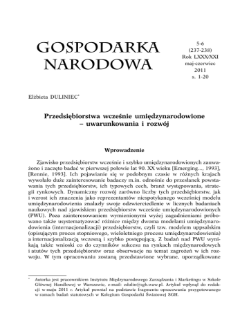 GOSPODARKA NARODOWA 5-6 (237-238) Rok LXXX/XXI maj-czerwiec 2011 s. 1-20 Elżbieta DULINIEC* Przedsiębiorstwa wcześnie umiędzynarodowione – uwarunkowania i rozwój Wprowadzenie Zjawisko przedsiębiorstw wcześnie i szybko umiędzynarodowionych zauważono i zaczęto badać w pierwszej połowie lat 90. XX wieku [Emerging..., 1993], [Rennie, 1993]. Ich pojawianie się w podobnym czasie w różnych krajach wywołało duże zainteresowanie badaczy m.in. odnośnie do przesłanek powstawania tych przedsiębiorstw, ich typowych cech, branż występowania, strategii rynkowych. Dynamiczny rozwój zarówno liczby tych przedsiębiorstw, jak i wzrost ich znaczenia jako reprezentantów niespotykanego wcześniej modelu umiędzynarodowienia znalazły swoje odzwierciedlenie w licznych badaniach naukowych nad zjawiskiem przedsiębiorstw wcześnie umiędzynarodowionych (PWU). Poza zainteresowaniem wymienionymi wyżej zagadnieniami próbowano także usystematyzować różnice między dwoma modelami umiędzynarodowienia (internacjonalizacji) przedsiębiorstw, czyli tzw. modelem uppsalskim (opisującym proces stopniowego, wieloletniego procesu umiędzynarodowienia) a internacjonalizacją wczesną i szybko postępującą. Z badań nad PWU wynikają także wnioski co do czynników sukcesu na rynkach międzynarodowych i atutów tych przedsiębiorstw oraz obserwacje na temat zagrożeń w ich rozwoju. W tym opracowaniu zostaną przedstawione wybrane, uporządkowane * Autorka jest pracownikiem Instytutu Międzynarodowego Zarządzania i Marketingu w Szkole Głównej Handlowej w Warszawie, e-mail: [email protected]. Artykuł wpłynął do redakcji w maju 2011 r. Artykuł powstał na podstawie fragmentu opracowania przygotowanego w ramach badań statutowych w Kolegium Gospodarki Światowej SGH. 2 GOSPODARKA NARODOWA Nr 5-6/2011 według wymienionych wyżej zagadnień, wnioski z dotychczasowych badań nad przedsiębiorstwami wcześnie umiędzynarodowionymi na świecie. Przedsiębiorstwa wcześnie umiędzynarodowione są opisywane w anglojęzycznej literaturze przedmiotu z zastosowaniem różnych terminów, w tym jako born globals, international new ventures, born internationals, early internationalizing firms i wielu innych, w piśmiennictwie polskojęzycznym np. jako przedsiębiorstwa globalne od początku, urodzeni globaliści1; odmienne są także niektóre wnioski z badań nad tym przedsiębiorstwami. Mimo to nie ulega wątpliwości, że ta kategoria przedsiębiorstw istnieje na rynku międzynarodowym, a jej liczebność i znaczenie rosną (por. [Moen, 2002], [Shrader i in., 2000]). W niektórych ujęciach PWU podkreśla się, że niekoniecznie są to od razu przedsiębiorstwa o globalnym zasięgu działania. I tak np. przedsiębiorstwa nieomal od powstania eksportujące swe produkty na rynki krajów macierzystego regionu (kontynentu) określa się jako born internationals (międzynarodowe od początku) w odróżnieniu od born globals; rynki zbytu tych ostatnich znajdują się również na innych kontynentach [Luostarinen, Gabrielsson, 2002]. To kryterium jest zazwyczaj łączone z udziałem eksportu o określonym jako minimalny udział procentowy (np. 25%, 30%, 50%) w całości sprzedaży przedsiębiorstwa, obserwowanym w stosunkowo krótkim czasie od utworzenia przedsiębiorstwa (najczęściej w ciągu dwóch-trzech lat) (por. [Duliniec, 2011], Przybylska, 2010]). Przesłanki powstawania przedsiębiorstw wcześnie umiędzynarodowionych Przesłanki zewnętrzne Do występujących w otoczeniu międzynarodowym uwarunkowań sprzyjających międzynarodowej ekspansji PWU należą przede wszystkim następujące: 1. Nowe warunki rynkowe w wielu sektorach gospodarczych: rosnące znaczenie rynków niszowych o zasięgu międzynarodowym i globalnym dla przedsiębiorstw małych i średnich; odnosi się to zwłaszcza do krajów o dojrzałych, wysoko rozwiniętych gospodarkach, w których obserwuje się wzrost zapotrzebowania na wyspecjalizowane dobra i usługi, a które często jest raczej jednorodne w przekroju międzynarodowym (globalizacja potrzeb wąskich segmentów transnarodowych) – niewielkie przedsiębiorstwa tylko w rynkach niszowych mogą osiągnąć silną pozycję konkurencyjną, oferować znaczną wartość dodaną. Przykładem może tu być sprzęt do badań naukowych z dziedziny fizyki niskich temperatur [Gabrielsson i in., 2008, s. 388]. 1 Przegląd terminologii dotyczącej PWU znajduje się w [Duliniec, 2011]. Elżbieta Duliniec, Przedsiębiorstwa wcześnie umiędzynarodowione... 3 2. Innowacyjne procesy technologiczne (np. z wykorzystaniem mikroprocesorów) umożliwiające efektywną produkcję skomplikowanych, nietypowych komponentów i niestandardowych wyrobów gotowych (także w zróżnicowanym asortymencie) w niewielkich partiach i ich indywidualne dostosowywanie do zróżnicowanych wymagań odbiorców; dzięki temu wyspecjalizowane, małe przedsiębiorstwa mogą być wysoce konkurencyjne, także wobec wielkich korporacji (trzeba dodać, że zazwyczaj nie ma tu korzyści skali, co działa na korzyść firm o niewielkich zasobach). Można spotkać opinię, że większość PWU pojawiła się jako efekt istotnego przełomu (breakthrough) w procesach, technologiach itd. [Andersson, Wictor, 2003, s. 252], chociaż spotyka się także PWU z branż tradycyjnych technologii (por. dalej). 3. Wyjątkowo szybki w ostatnich dekadach rozwój technologii komunikacyjnych, przyspieszający międzynarodowe przepływy informacji i zmniejszający ich koszty (telefonia komórkowa, poczta elektroniczna i inne wspomagane komputerowo formy elektronicznej wymiany danych), co umożliwia niewielkim przedsiębiorstwom skuteczne kontakty z całym światem (dostawcami, odbiorcami, kooperantami), w tym szybkie powiększanie wiedzy o rynkach zagranicznych, ograniczanie dystansu kulturowego i sprawną realizację operacji międzynarodowych; szczególnie przyczynia się do powstawania i rozwoju PWU międzynarodowa ekspansja Interne